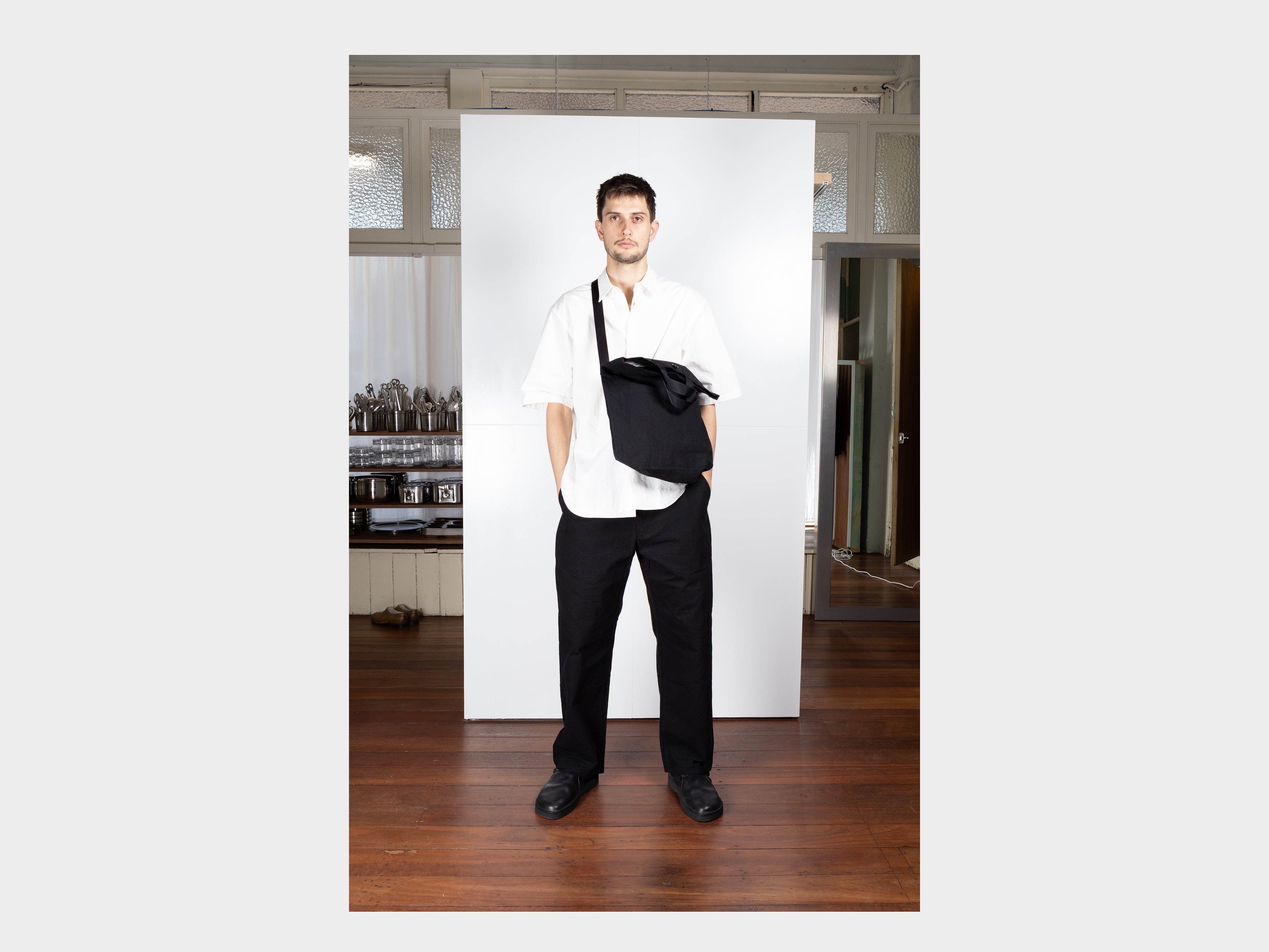 +Fold–over tote with taped slot button closure, two short handles, and single long shoulder strap designed to be worn crossbody. Made in Japan.