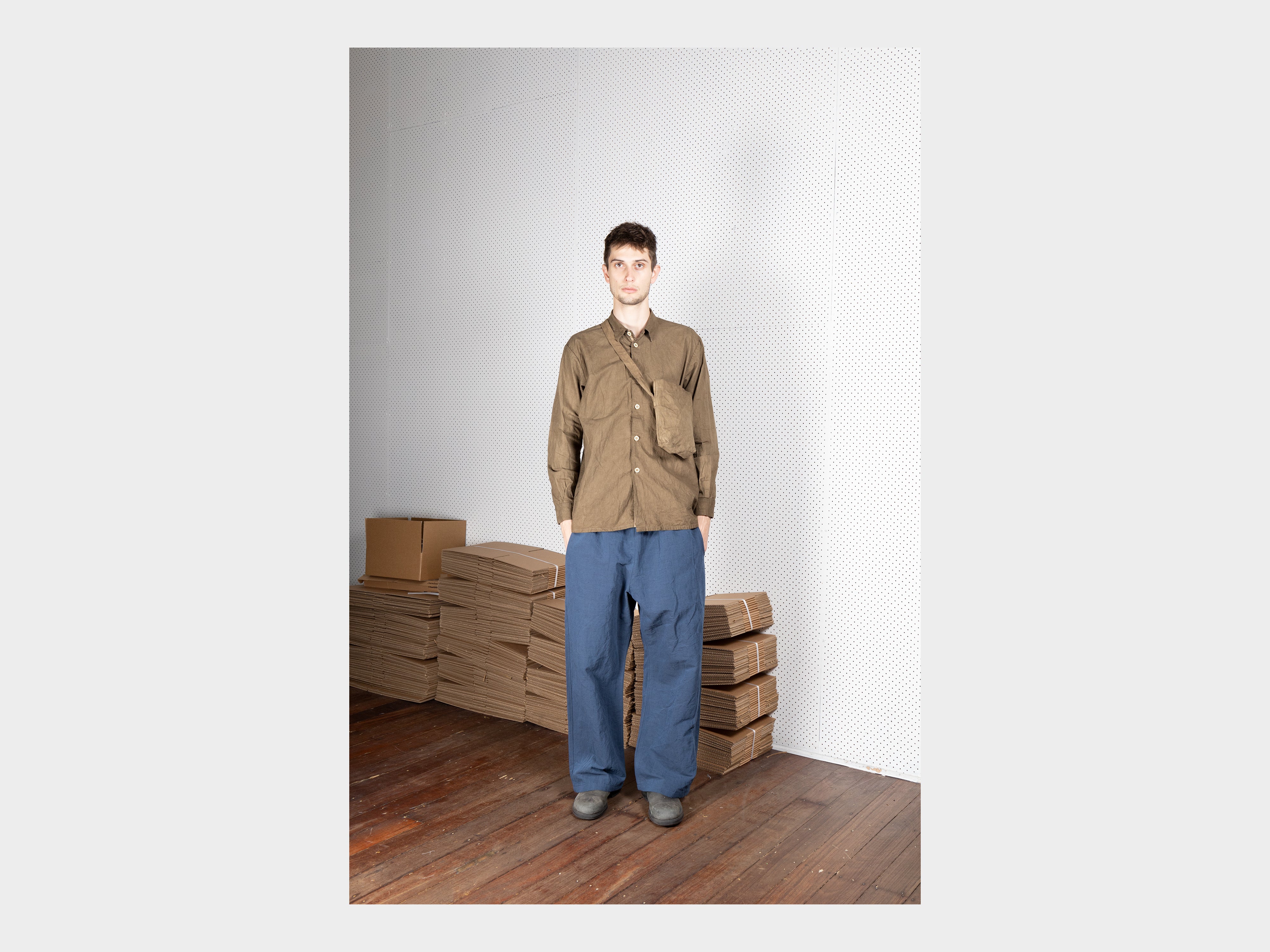 100% cotton canvas. Woven for MAN-TLE in Shizuoka, Japan. Naturally dyed at Kanai Kougei, Amami-Ōshima, Japan. Please note the colour may evolve with wear and exposure to sunlight, and the original form may have changed as a result of the rigorous dying process.
