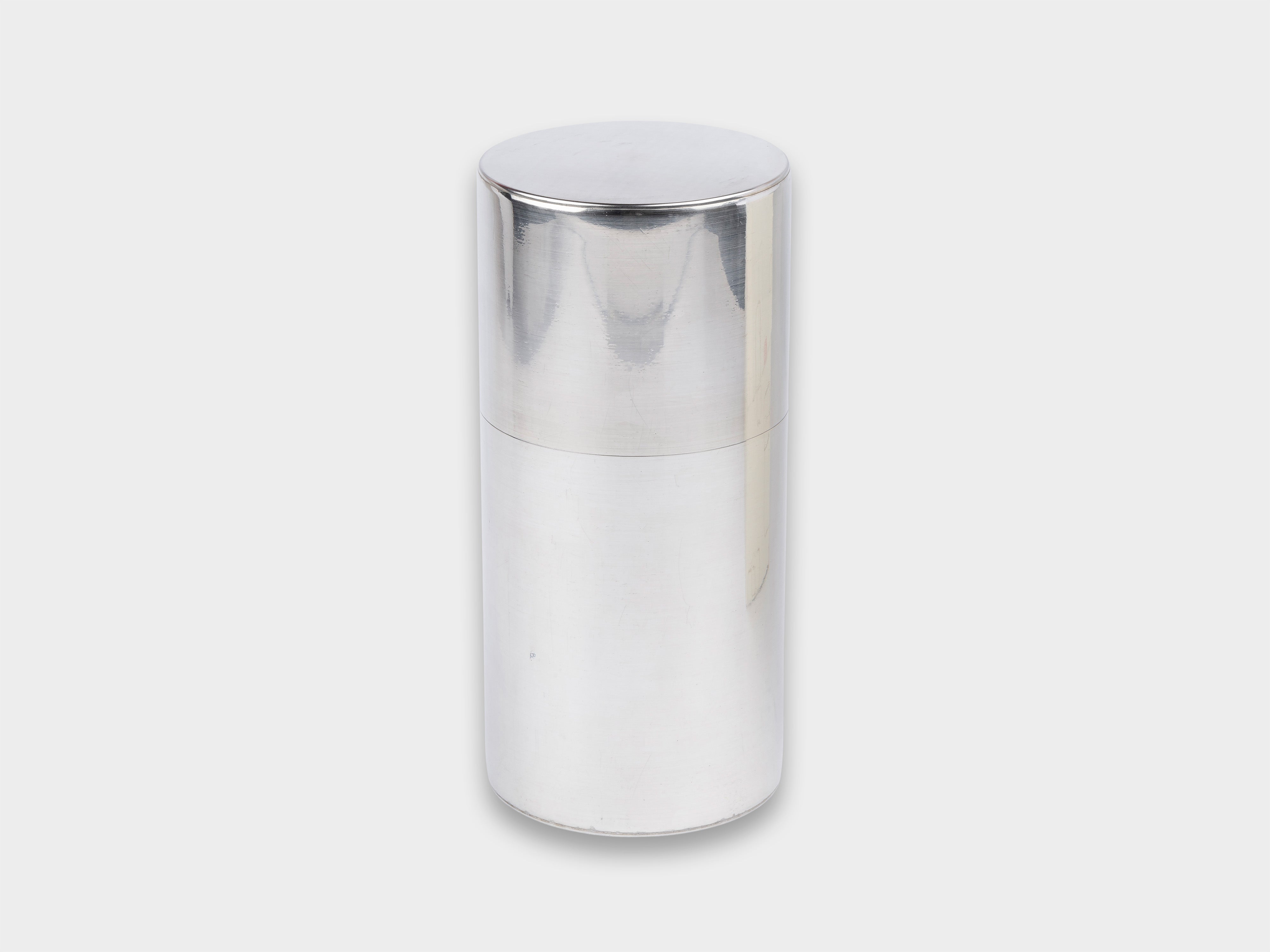 A cylindrical shaped airtight container used to store tea and other dry food products. The process of making a Chazutsu includes 130 steps; the lid is delicately lined up with the body so that when placed on it sinks slowly, sealing the caddy by expelling the remaining air. Made with a double structure using two layers of tin. The tin is made using a traditional manufacturing method called ‘dobozuke’, which gives it its matte finish. It is designed to gradually change colour over the duration of its life.