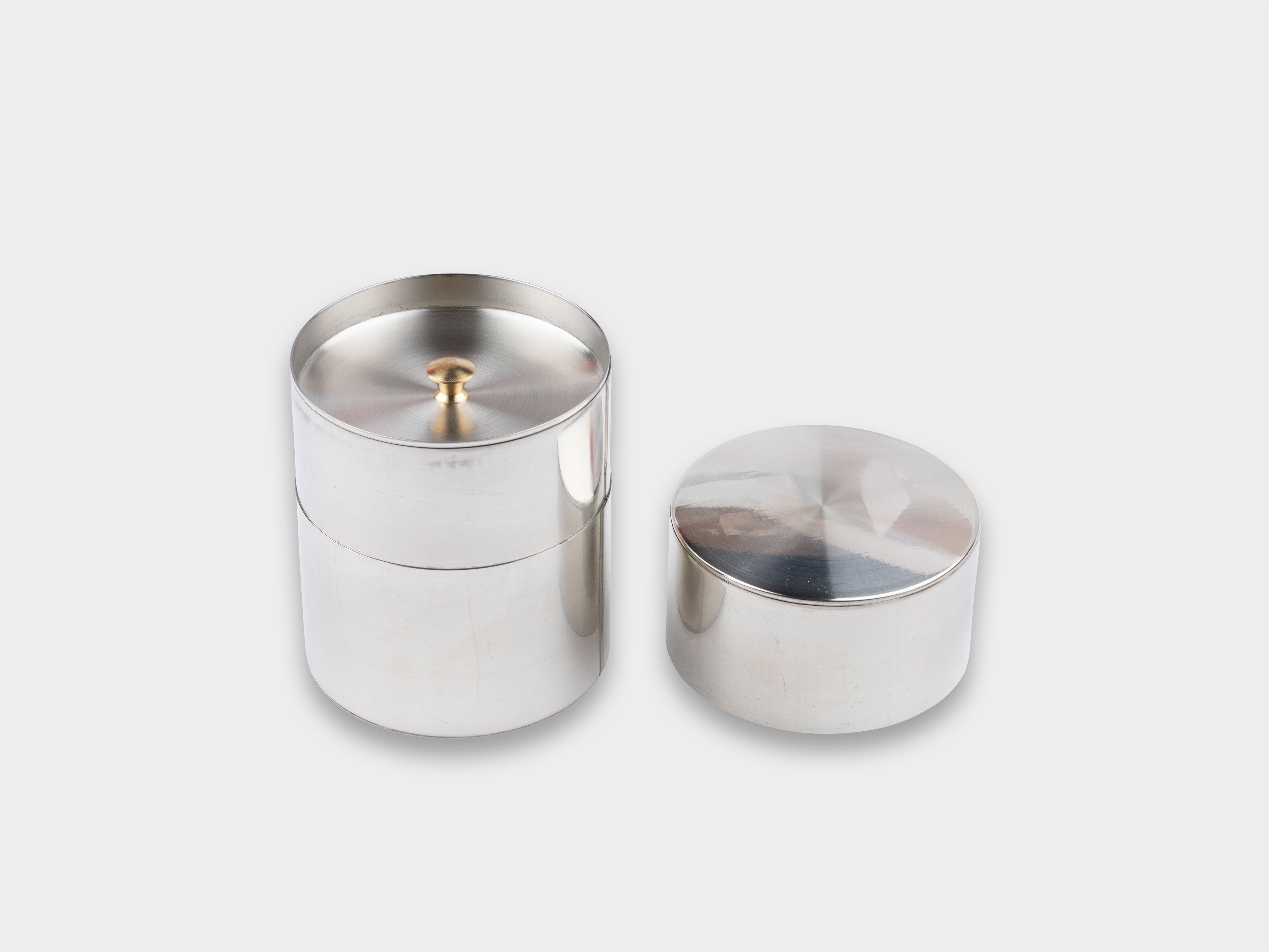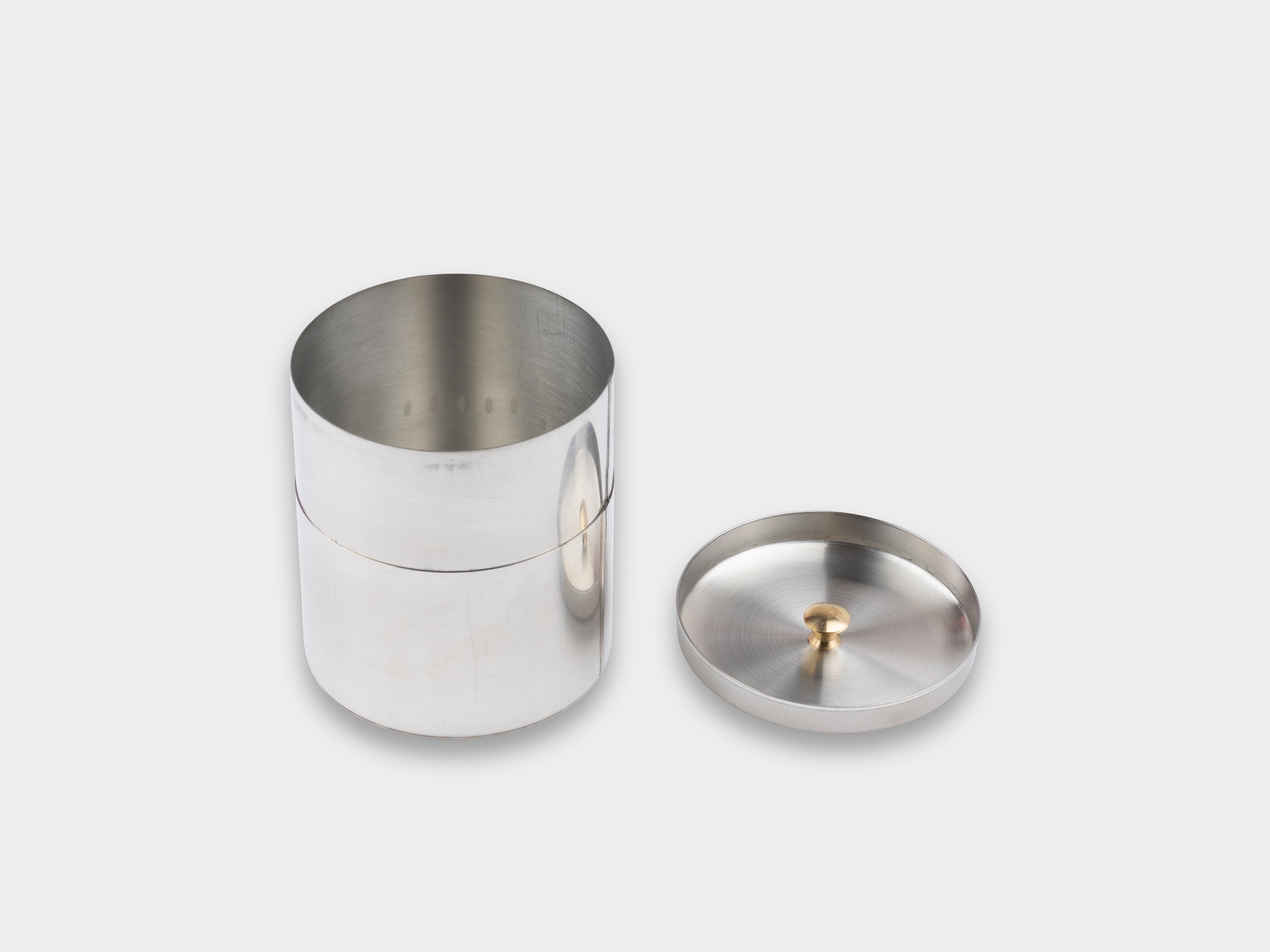 +A cylindrical shaped airtight container used to store tea and other dry food products. The process of making a Chazutsu includes 130 steps; the lid is delicately lined up with the body so that when placed on it sinks slowly, sealing the caddy by expelling the remaining air. Made with a double structure using two layers of tin. The tin is made using a traditional manufacturing method called ‘dobozuke’, which gives it its matte finish. It is designed to gradually change colour over the duration of its life.