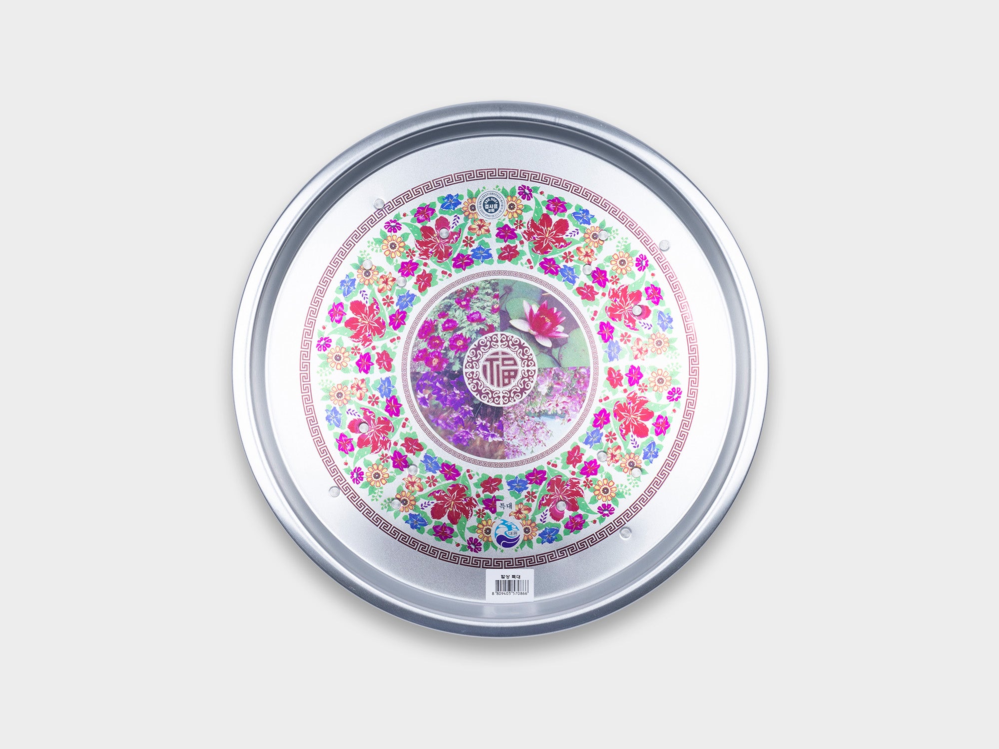 +A large aluminium tray for condiments with a printed motif. These are an ancient tool for serving food in Korea. They grow more beautiful with age and use. This particular version has folding metal legs which allow it to stand taller and save tabletop space.