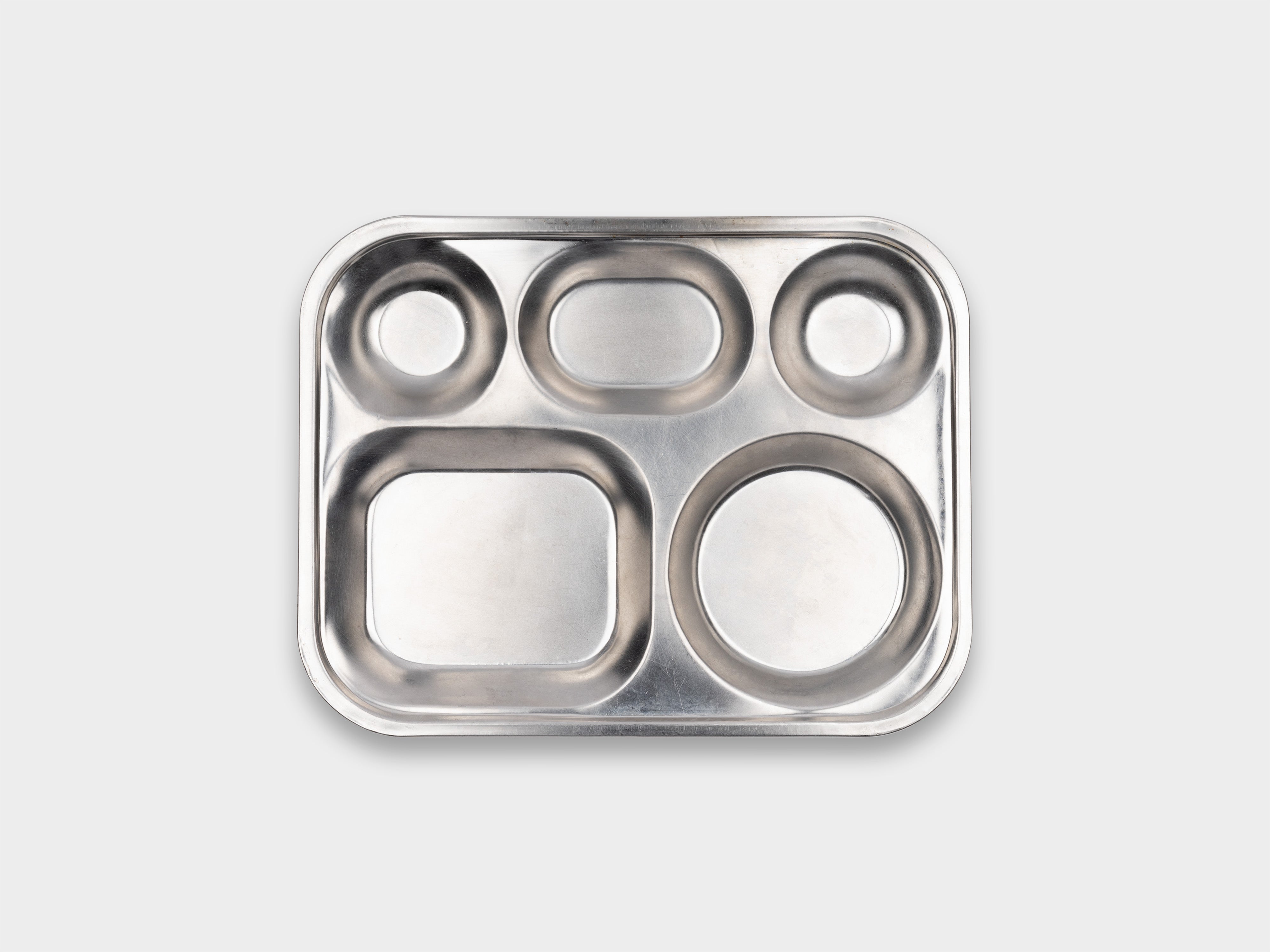 +Stainless steel children's serving plate with 5 seperate compartments. Light, durable and stackable, these were originally made for primary schools in Korea. Used-condition / showing some signs of wear. Variation may exist between each item.