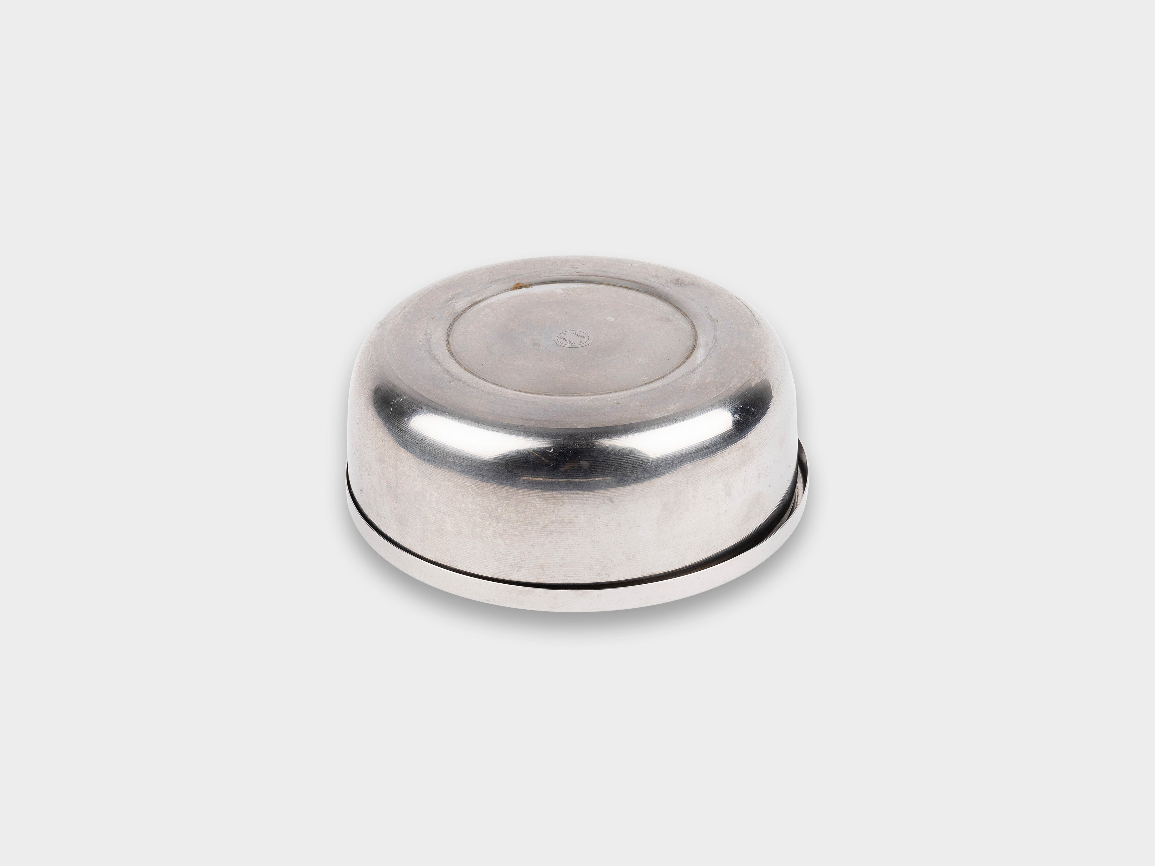 +Stainless steel soup bowl with loose-fitting lid used for serving in restaurants. Used-condition / showing signs of wear. Variation may exist between each item.