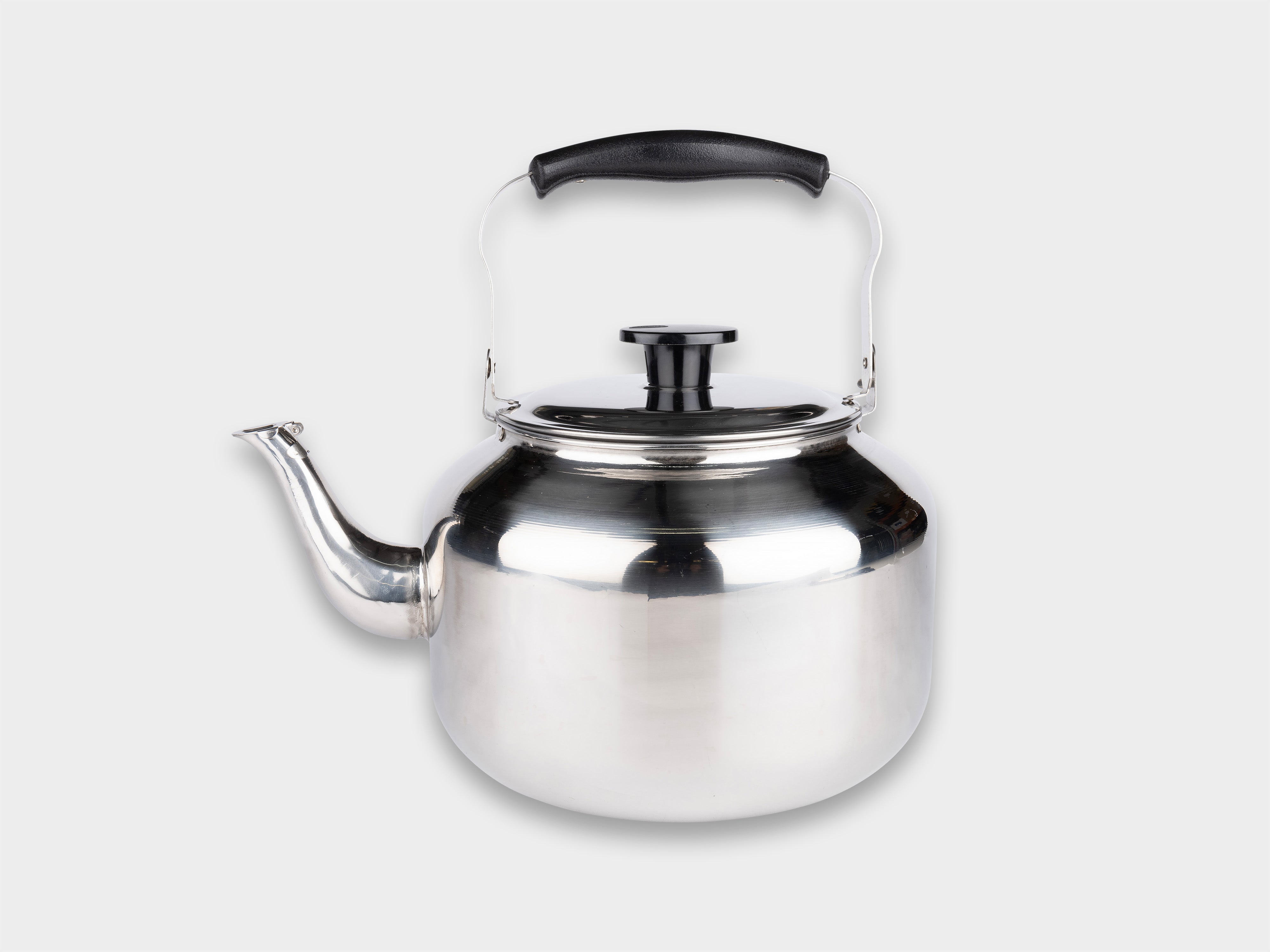 +A giant stainless steel teapot, perfect for sharing tea with others around a fire.