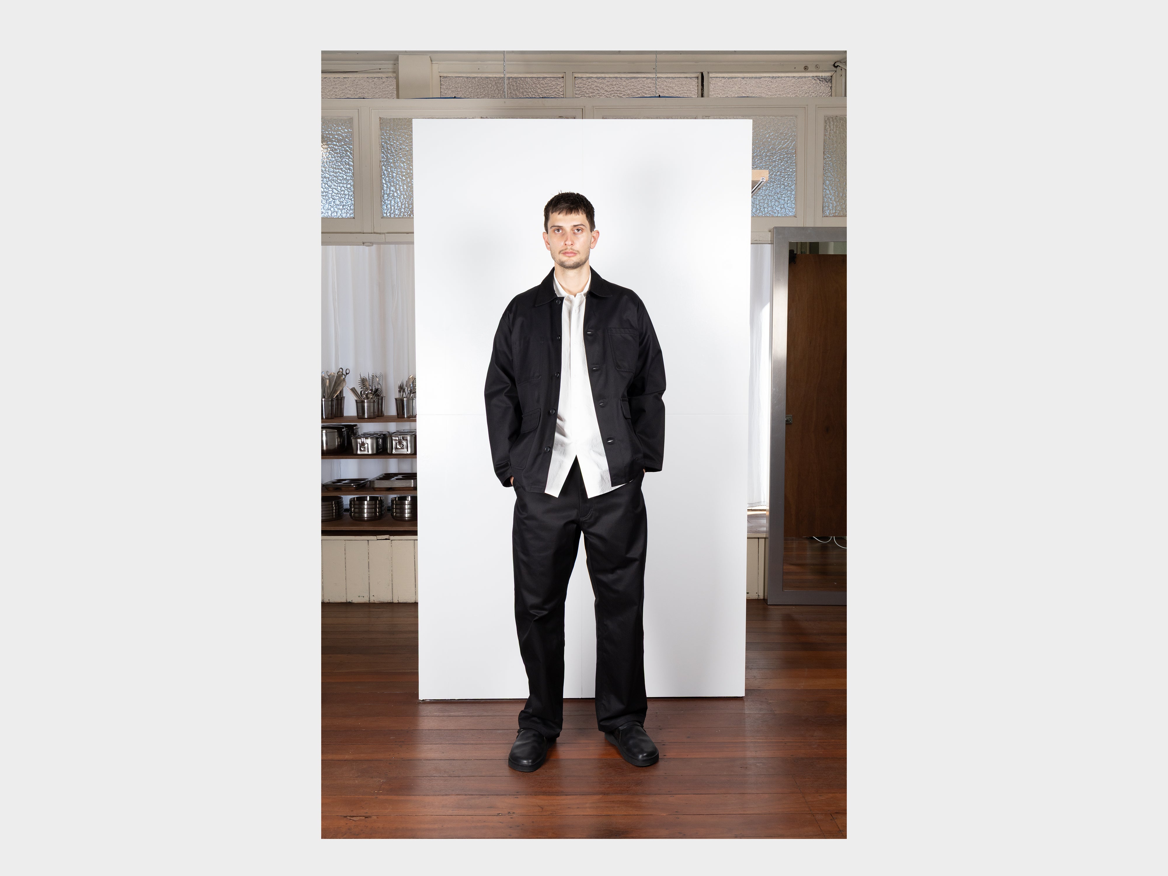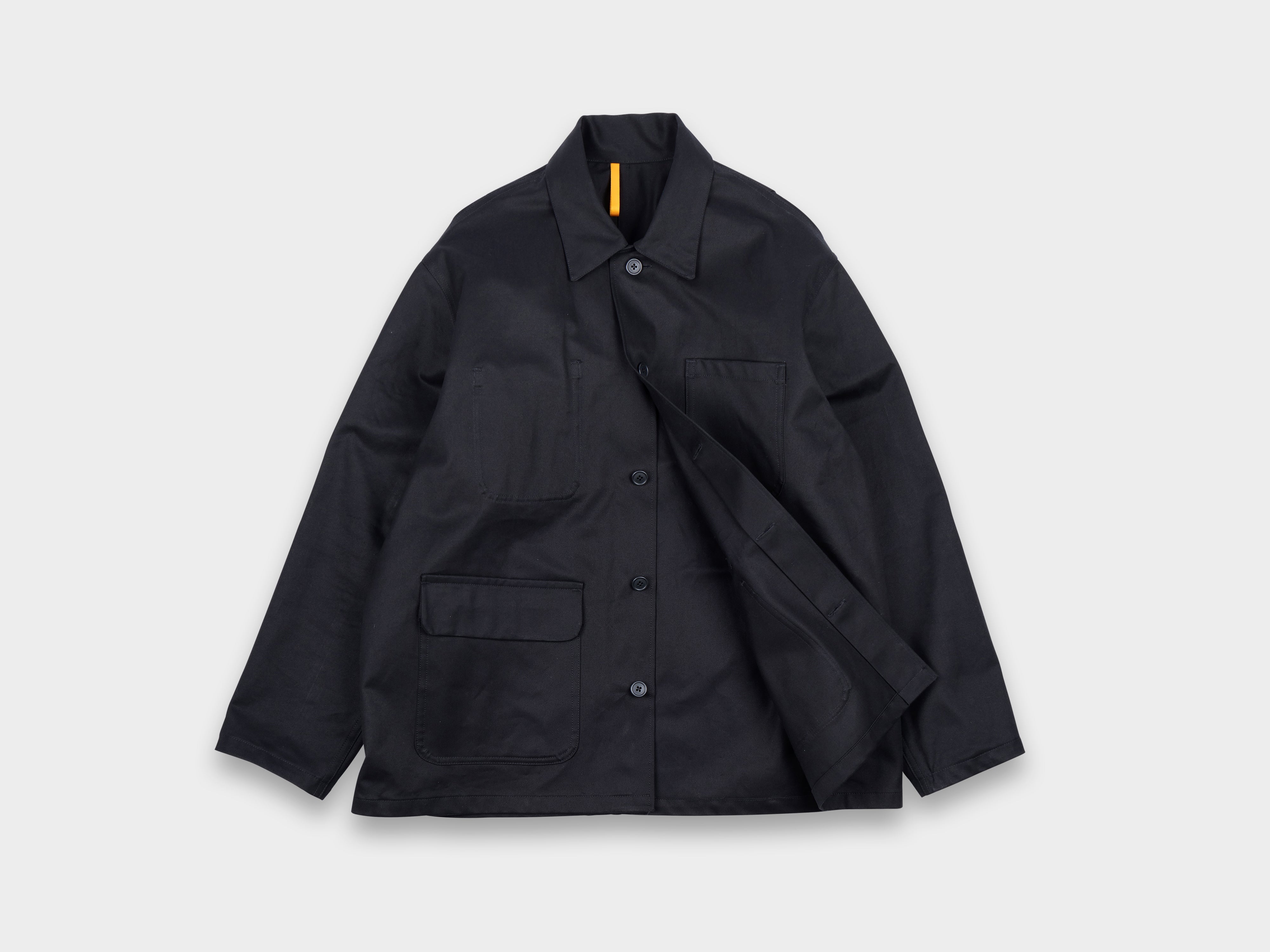 Work jacket suitable for industry. Wide cut with generous sleeves and action pleats at the back for ease of movement. Wide patch pockets with flap closures, double chest pockets — one external, one internal. Double-stitched welted seams, internal cuff facings, pointed collar. Made in Japan.