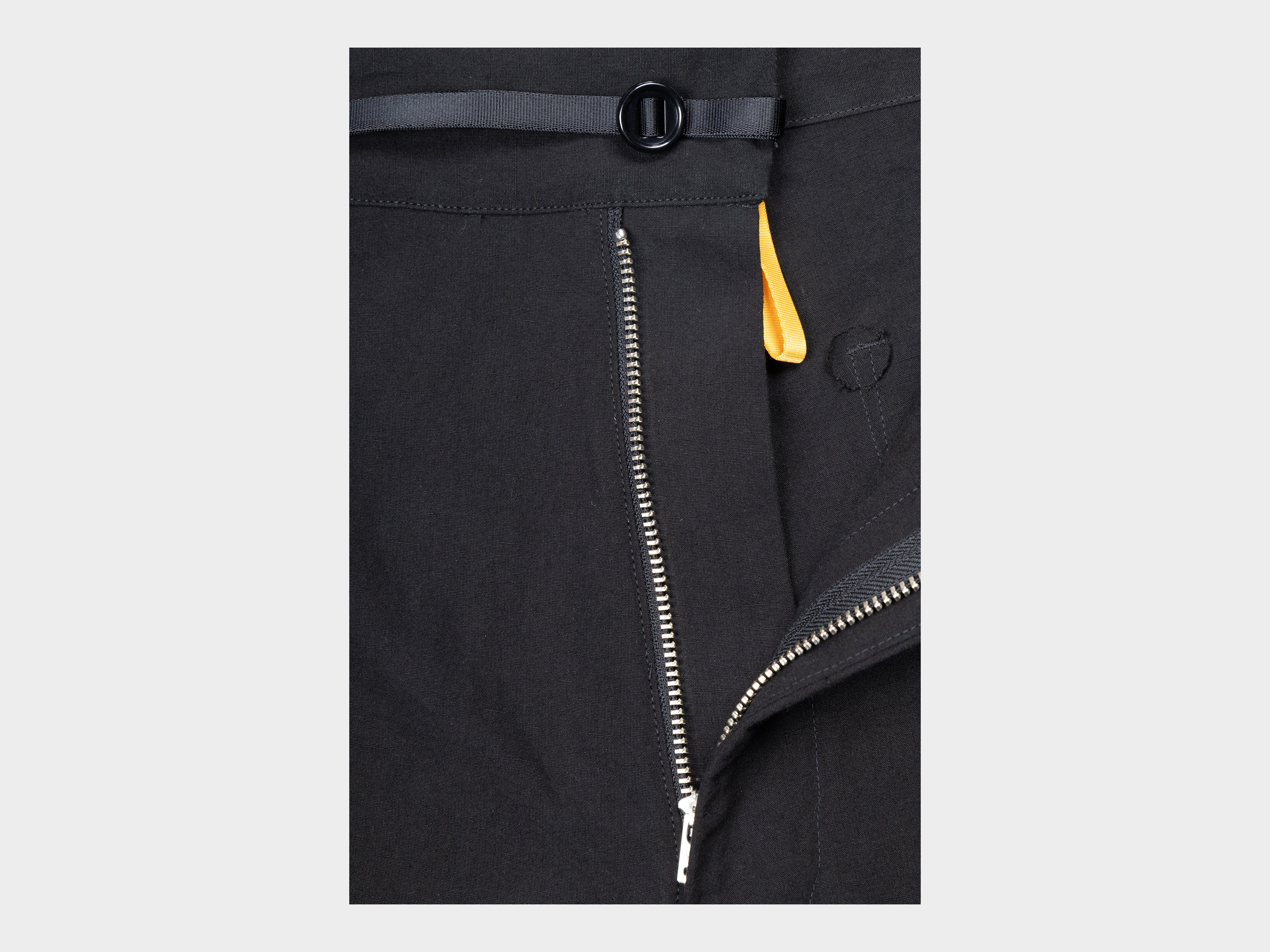 Relaxed wide-leg pants. Long rise and generous room in the hips. Seat belt tape with adjustable button at the front, side-seam pockets and back patch pockets. Made in Japan.