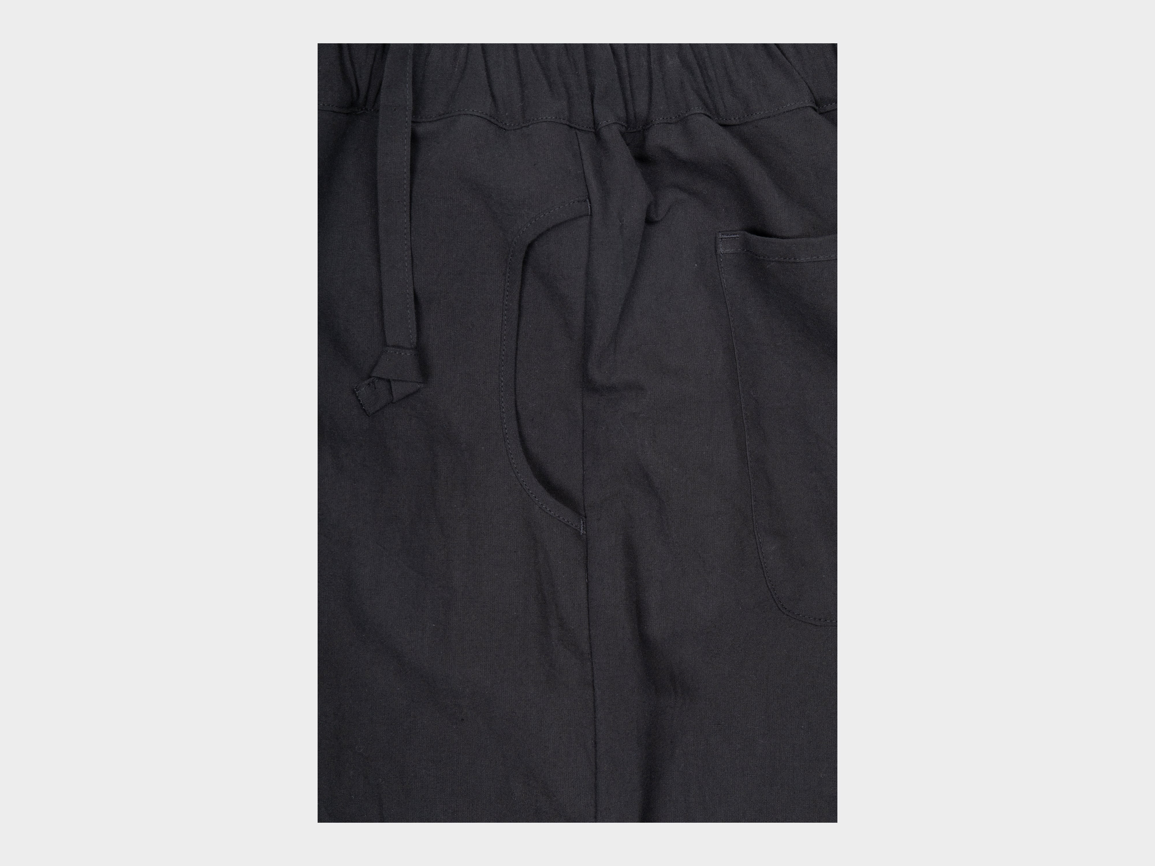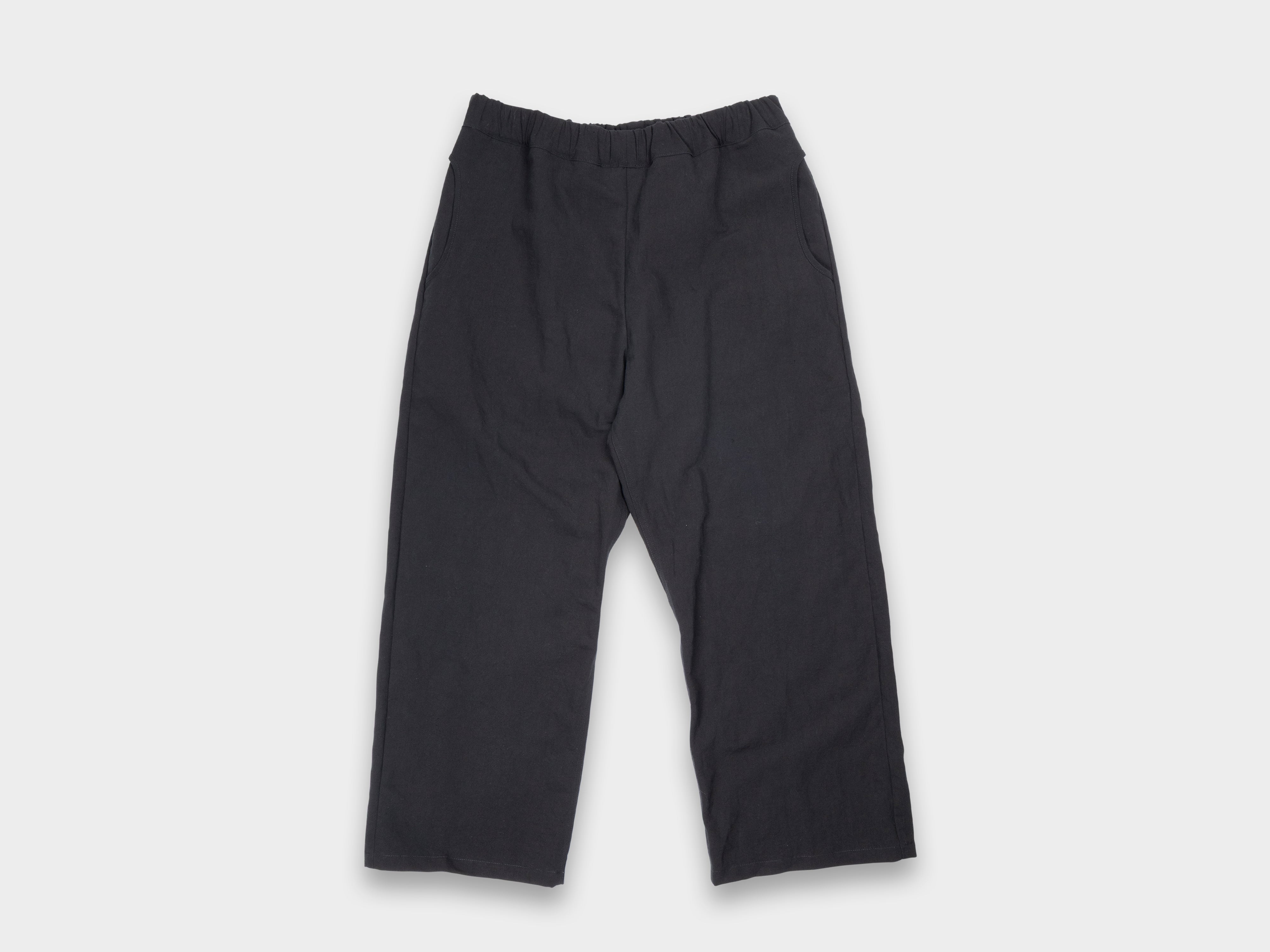 Relaxed-fit elastic waist trouser. Long rise with a loose, wide leg. Cut-away front pockets, rear patch pockets, drawstring waist. Made in Japan.