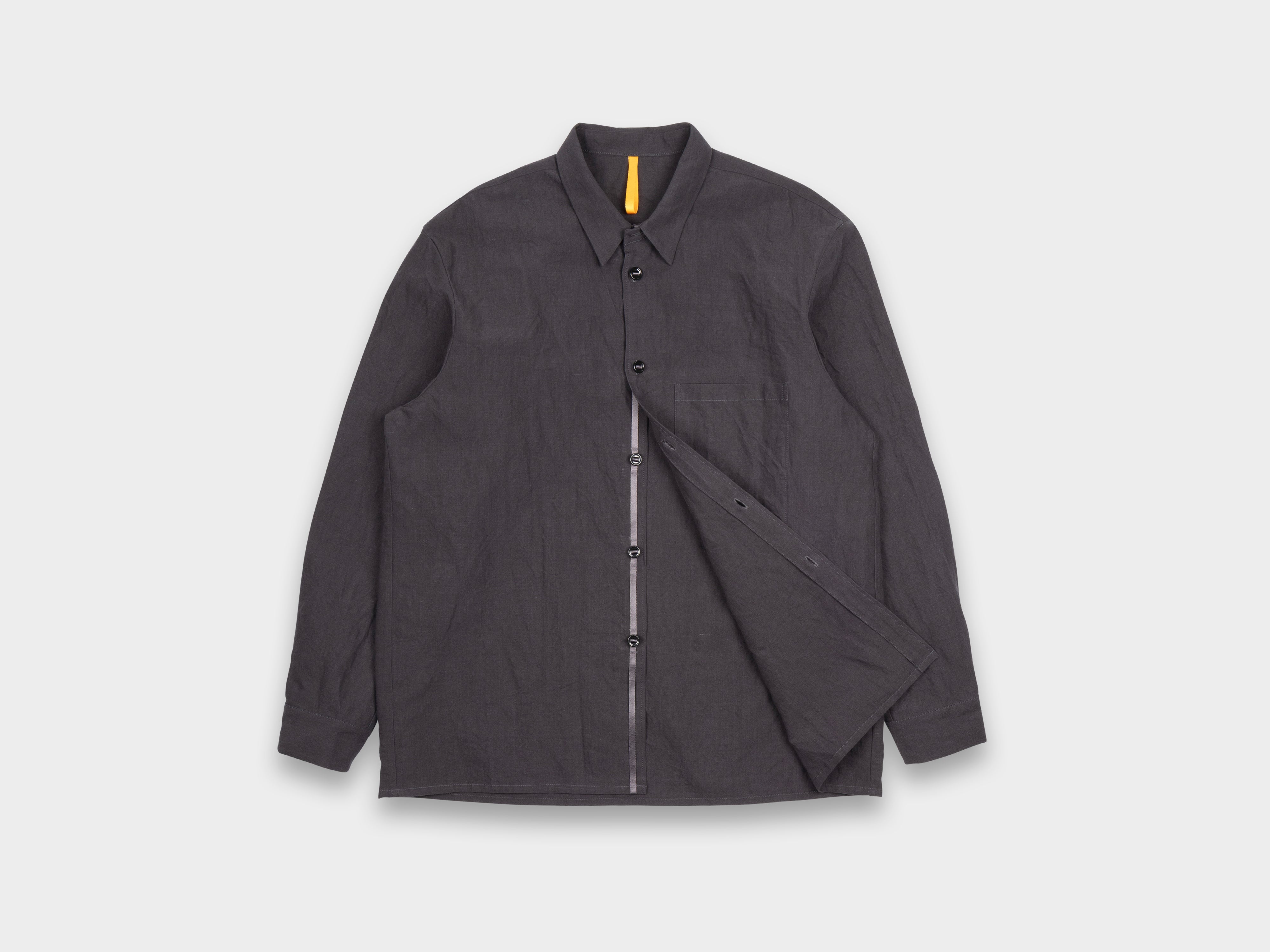 Introduced in R19 – our updated original Shirt-1. Pointed collar, slot buttons threaded onto seat belt tape, straight hem, relaxed sleeves, pleated cuffs with single button closure. Made in Japan.