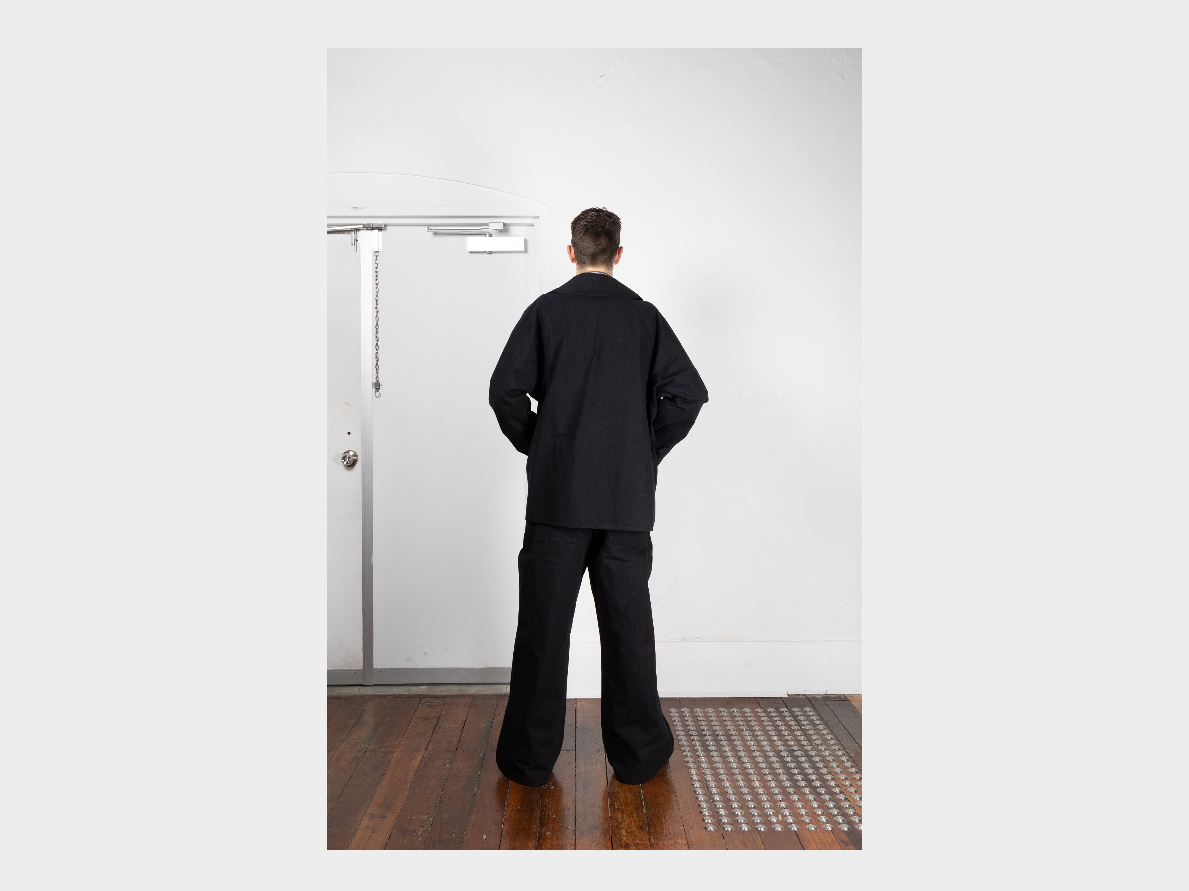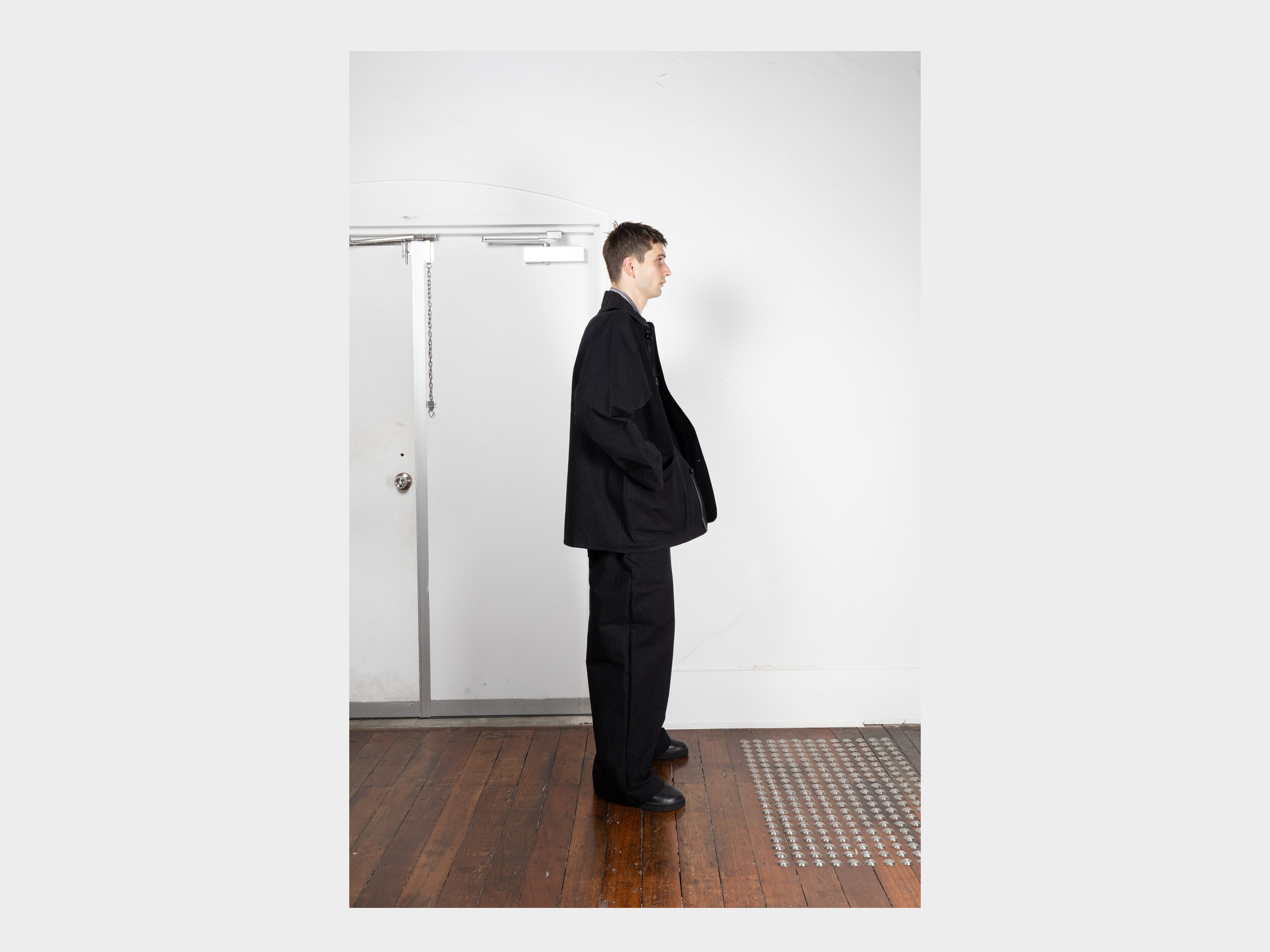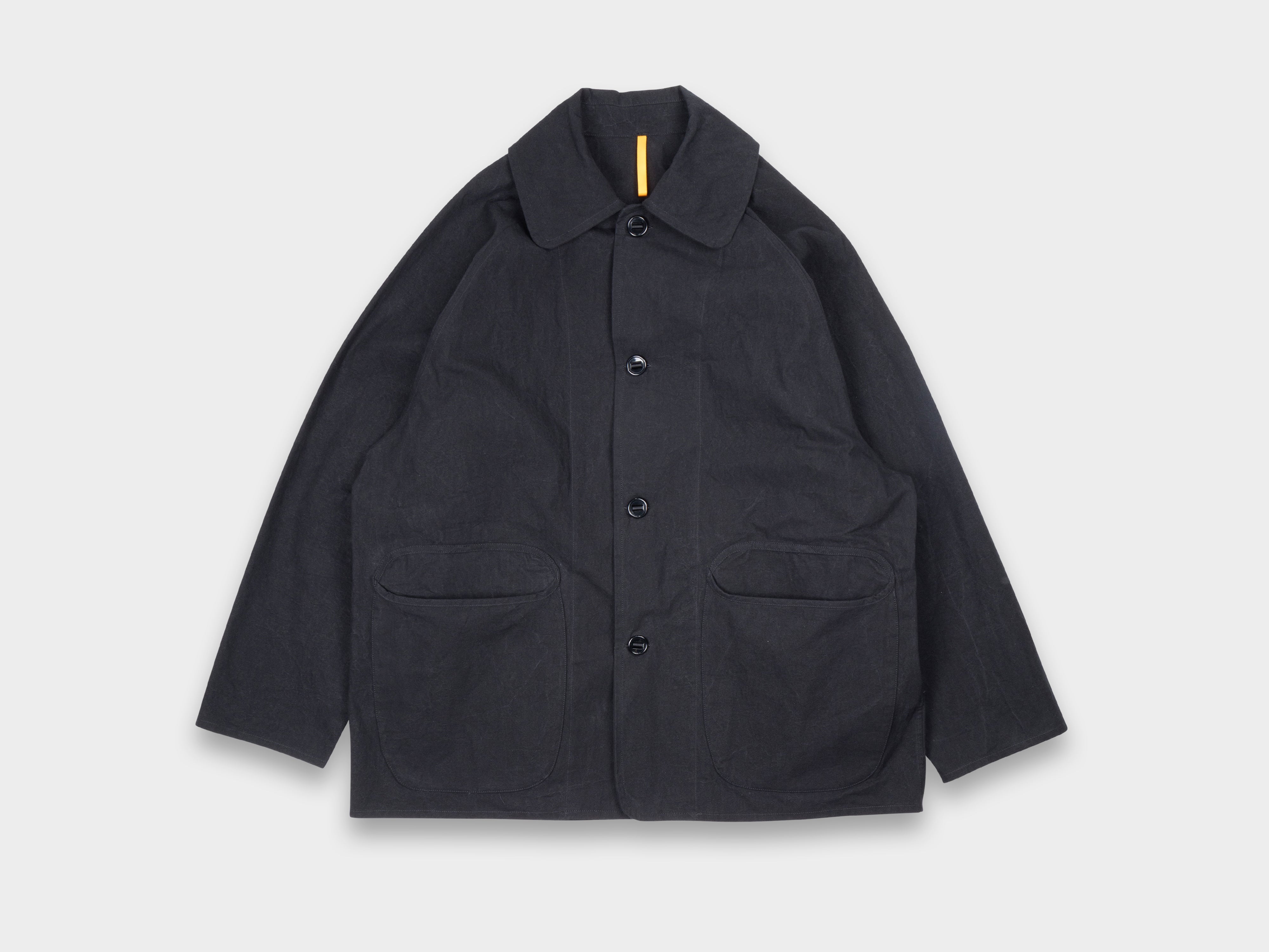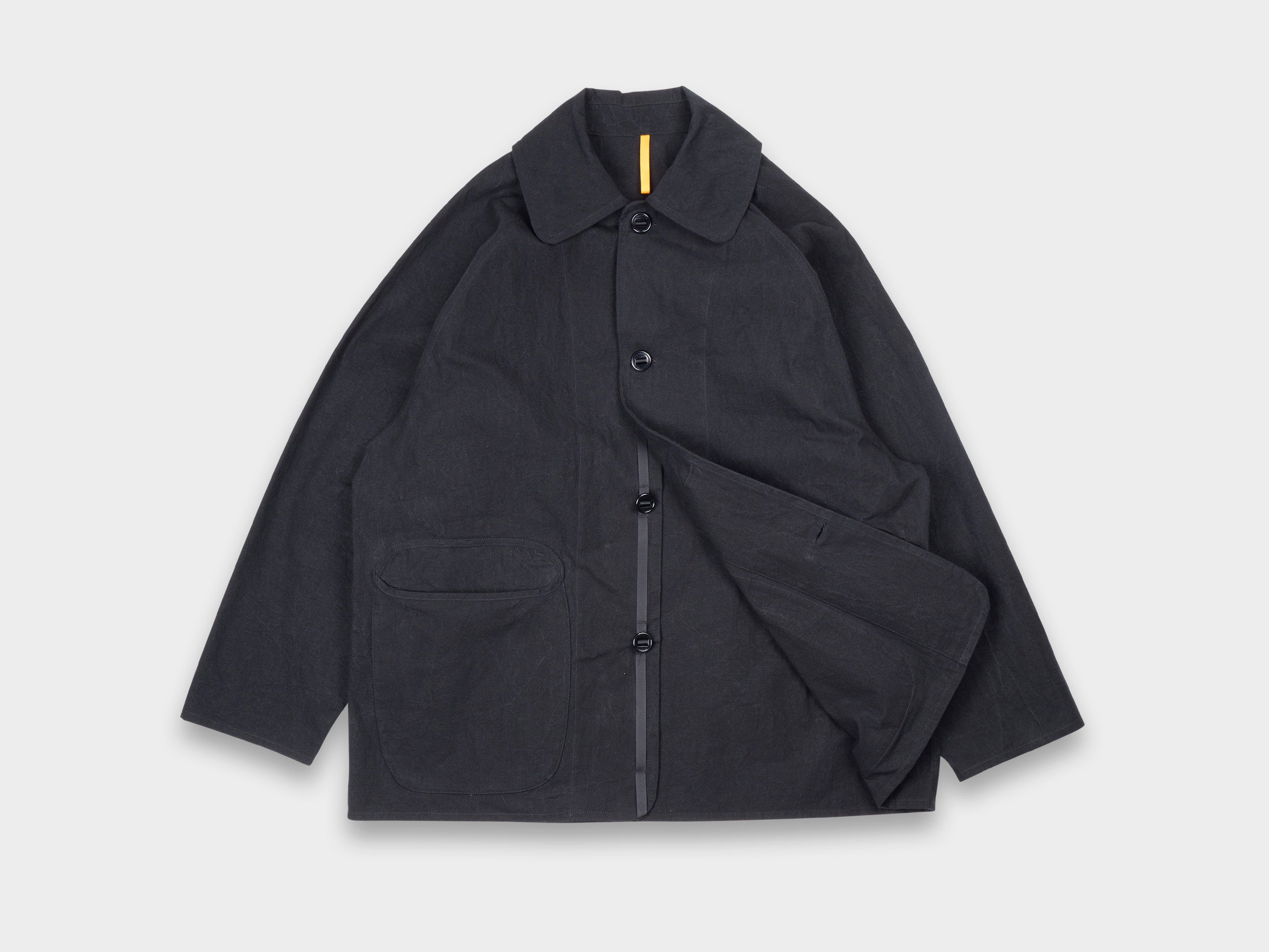 100% cotton with a paraffin wax coating. Yarn spun and dyed in Japan using cotton grown in Australia and the USA. Woven in Shizouka, then coated and baked in paraffin wax in Fukui. This original MAN–TLE cloth, MT-Wax, is designed to reveal new sound, colour, and texture over time. At first heavyweight and naturally stiff, it softens, fades, and changes form with washing and wear, becoming personal to the body it covers. Woven for MAN–TLE in Shizuoka, Japan.