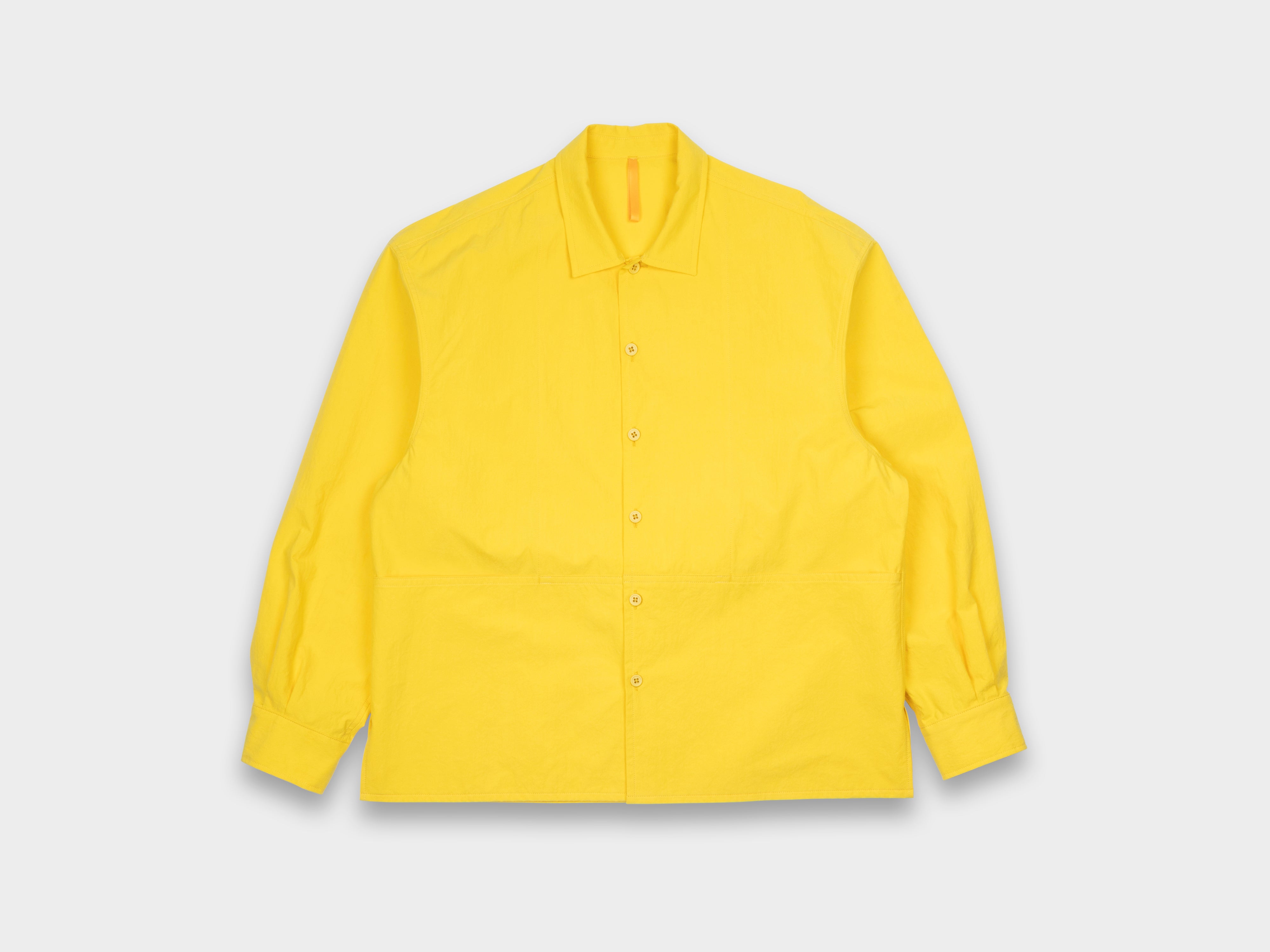 Boxy-fit overshirt with large, full-width front pockets. Generous sleeves, pleated cuffs with single button closure, pointed collar with hidden stand, side-seam vents. Made in Japan.