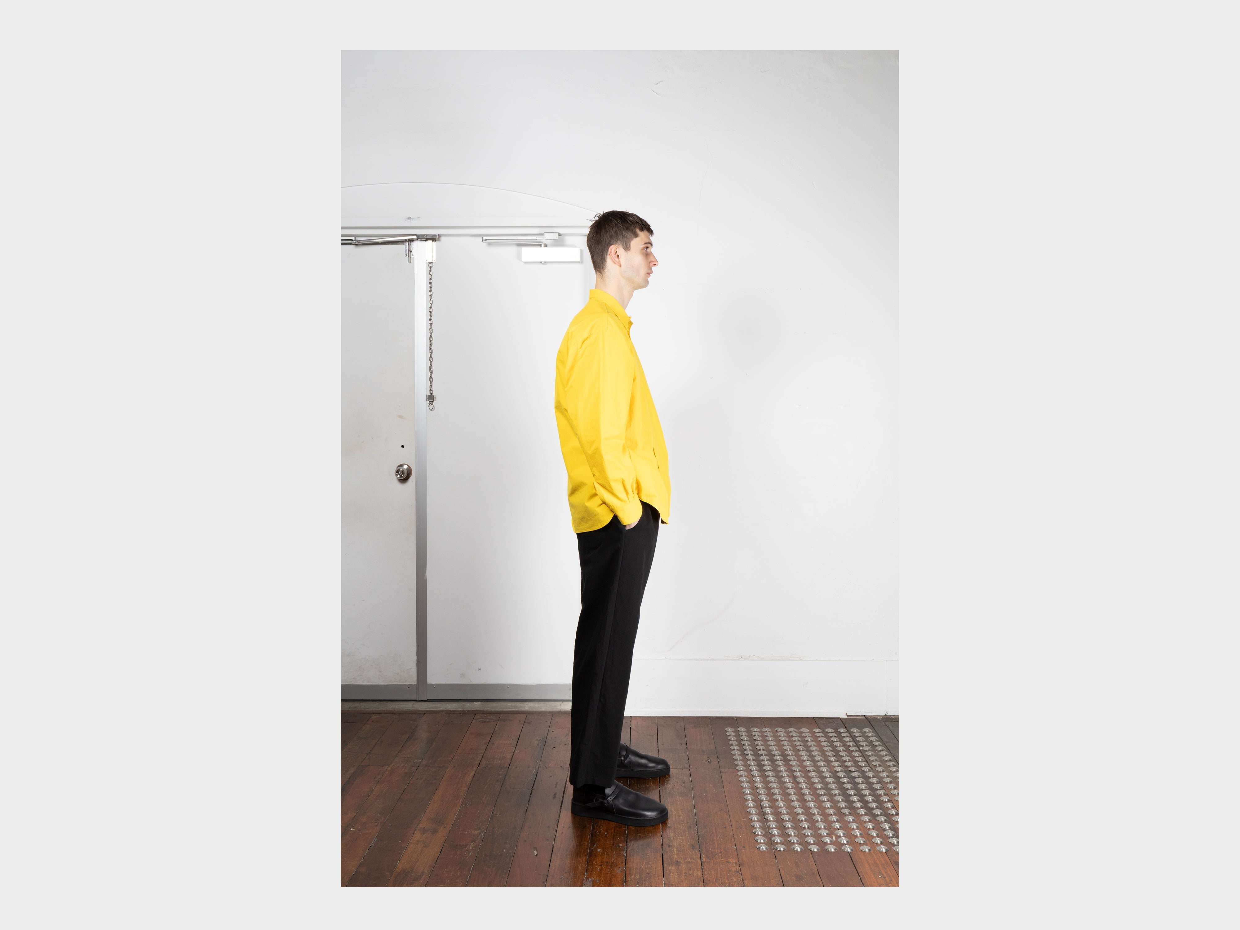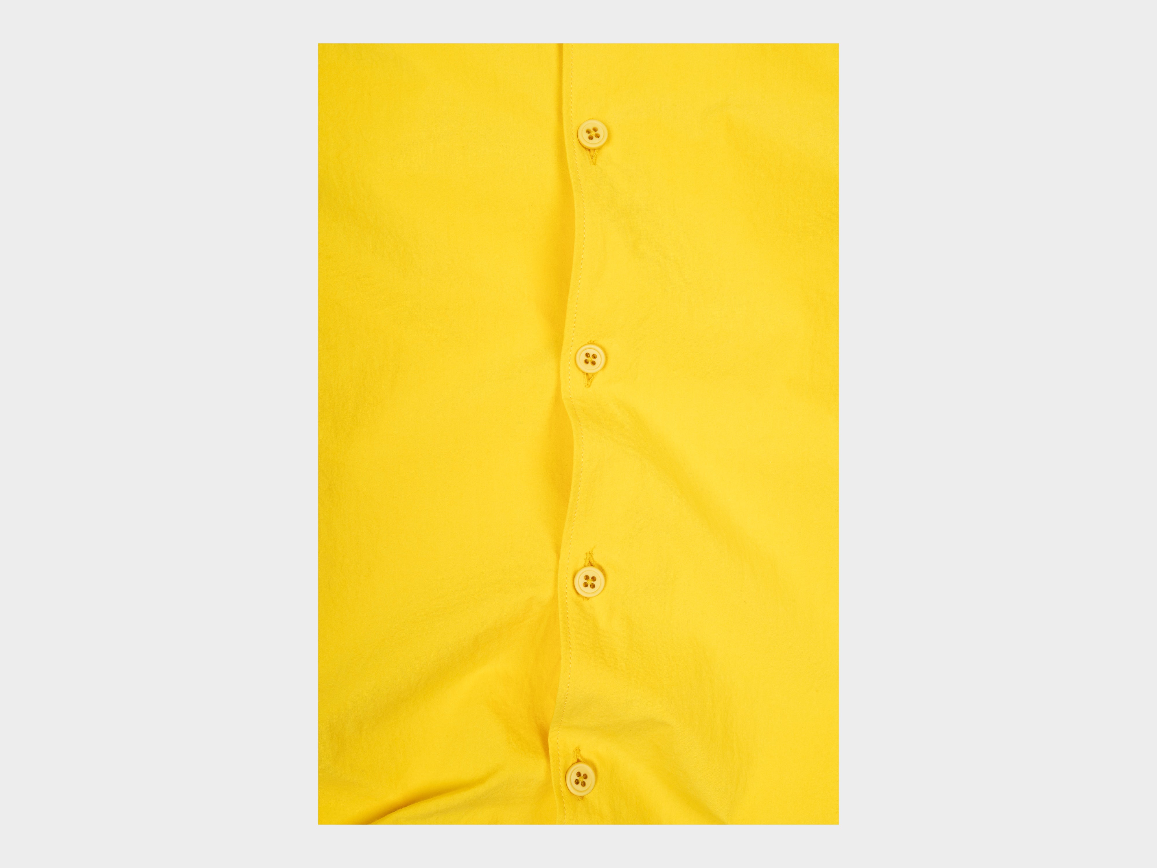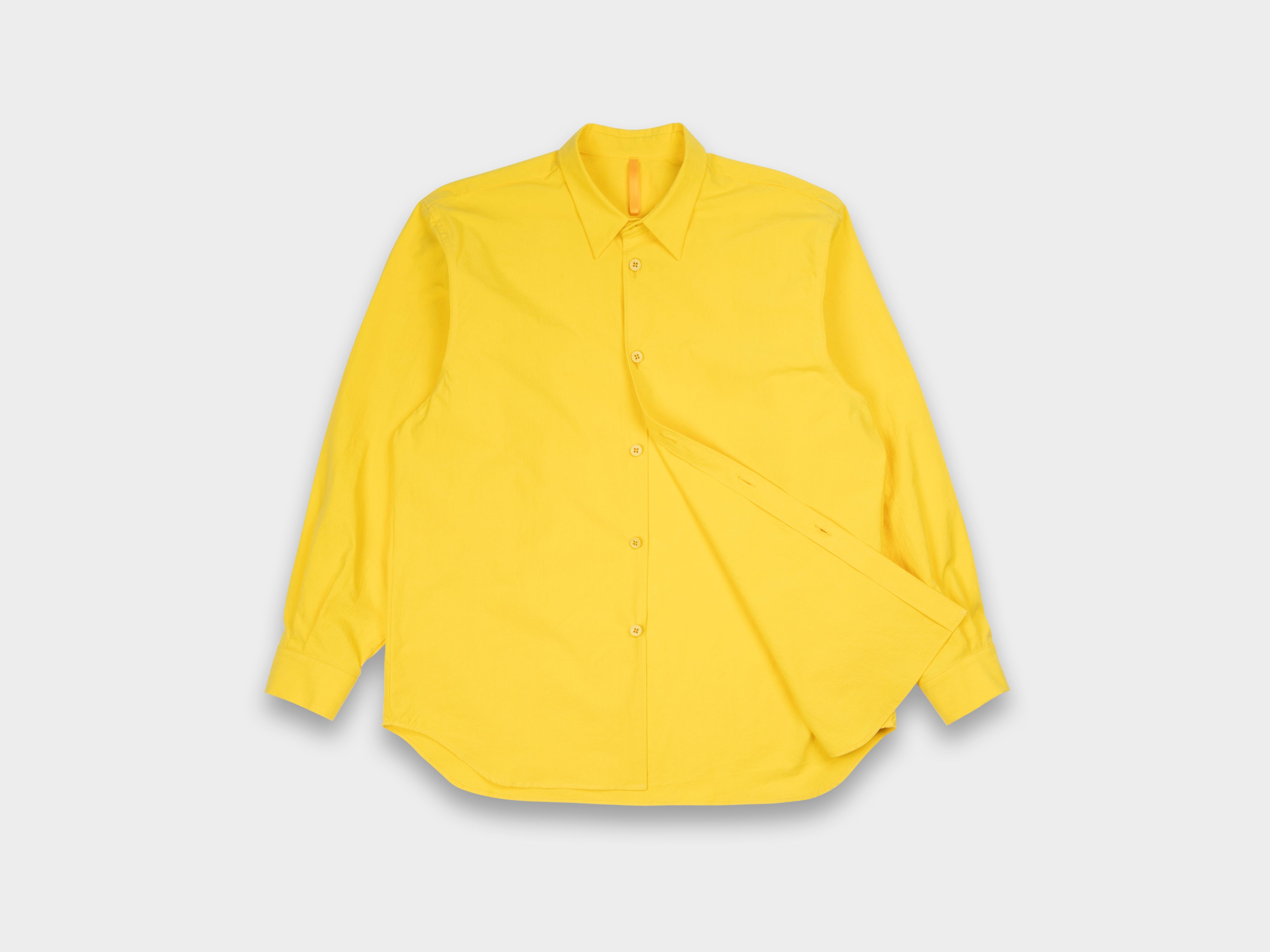 Loose-fitting shirt. Slightly dropped shoulders, relaxed sleeves, pleated cuffs with single-button closure, pointed collar, button front, curved hem. Made in Japan.