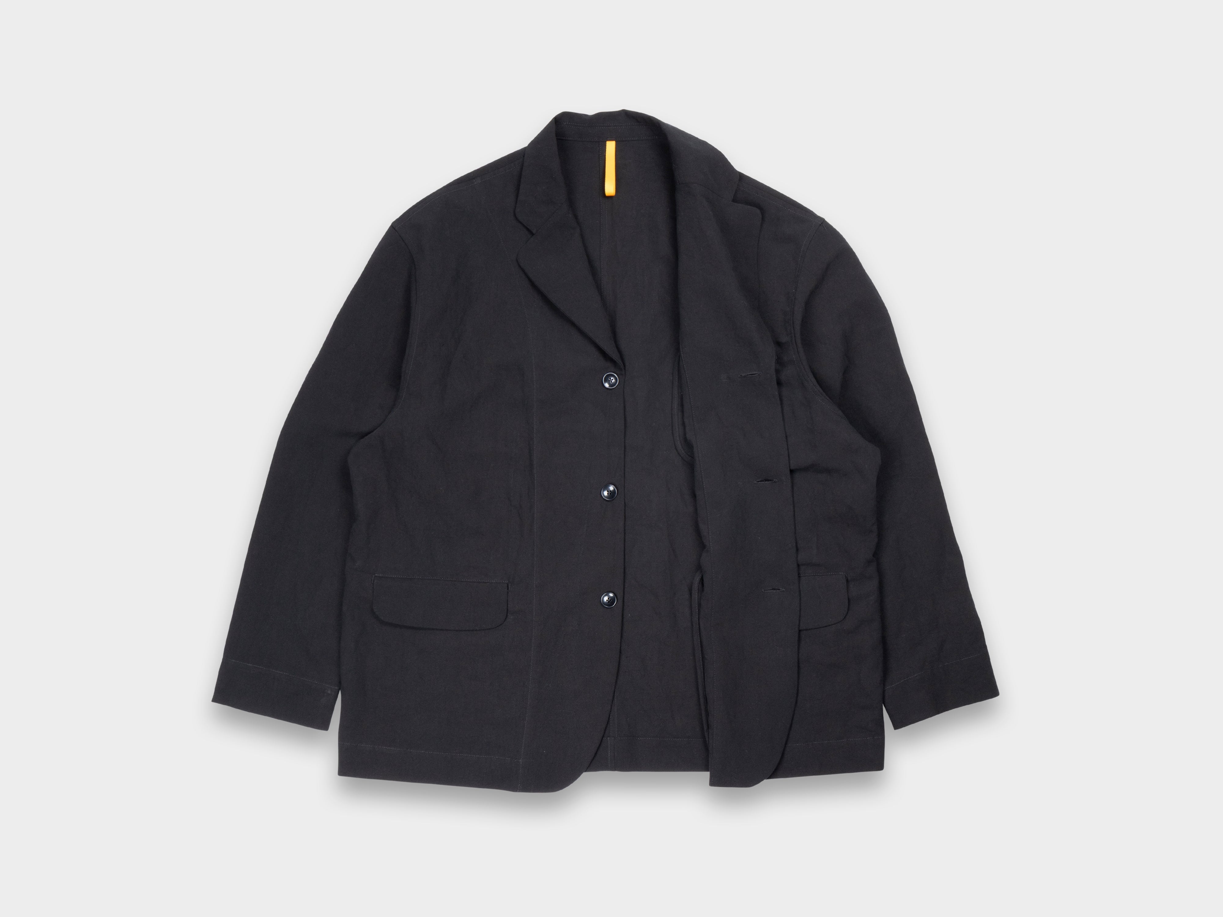 Loose fitting, boxy, wide-cut blazer. Notch lapel, top-stitched front facing, three single welt pockets with flap closures, slightly dropped shoulders. Made in Japan.