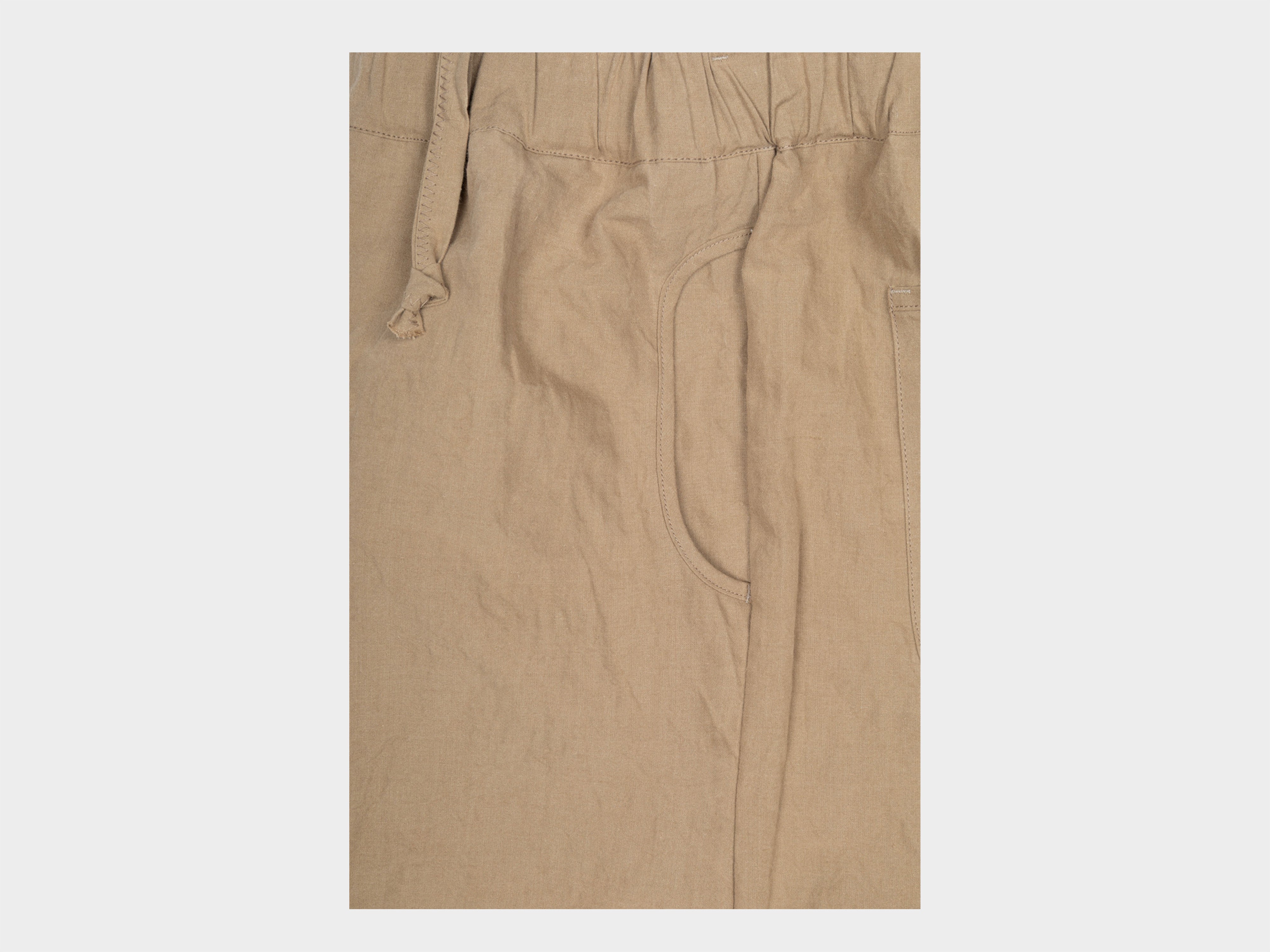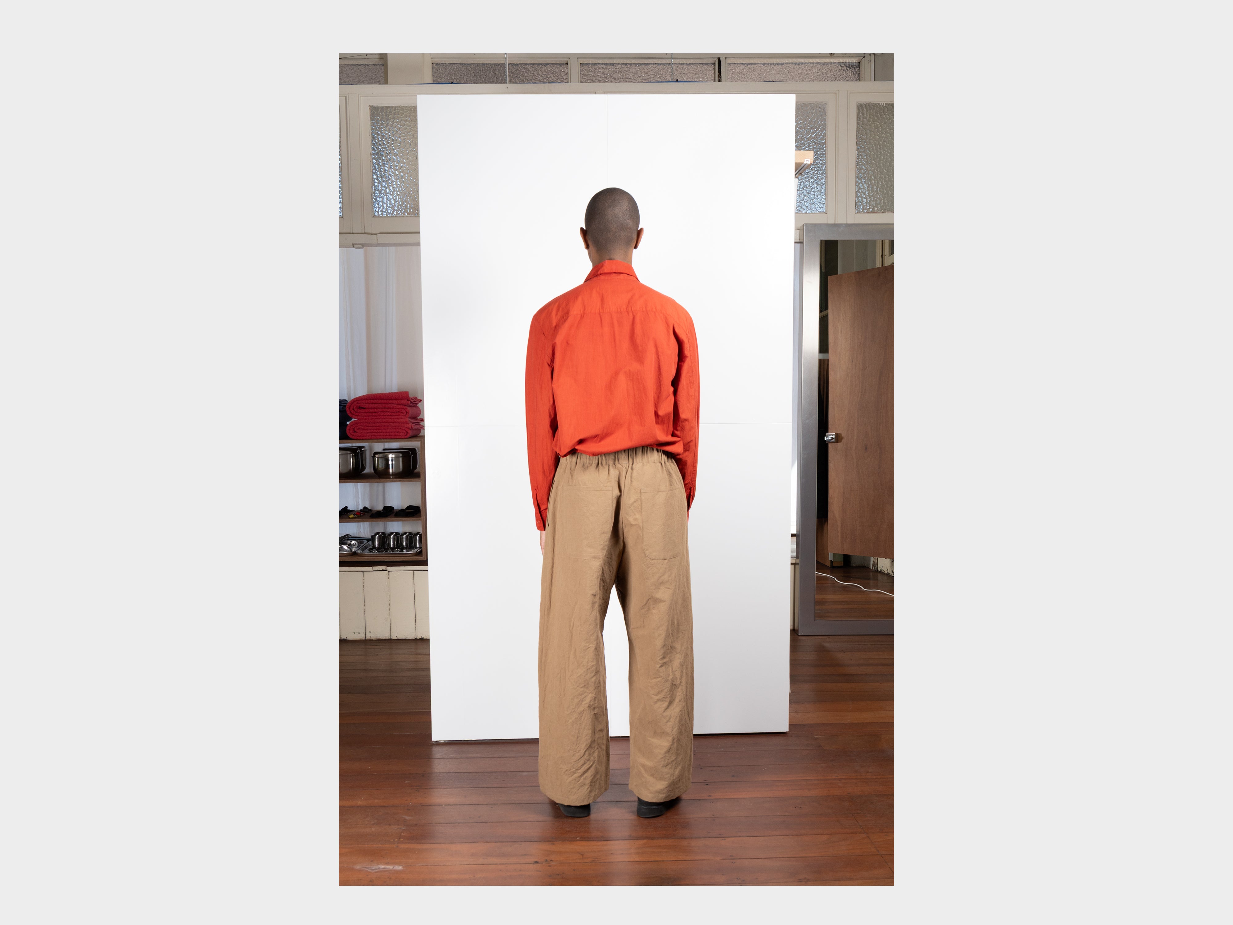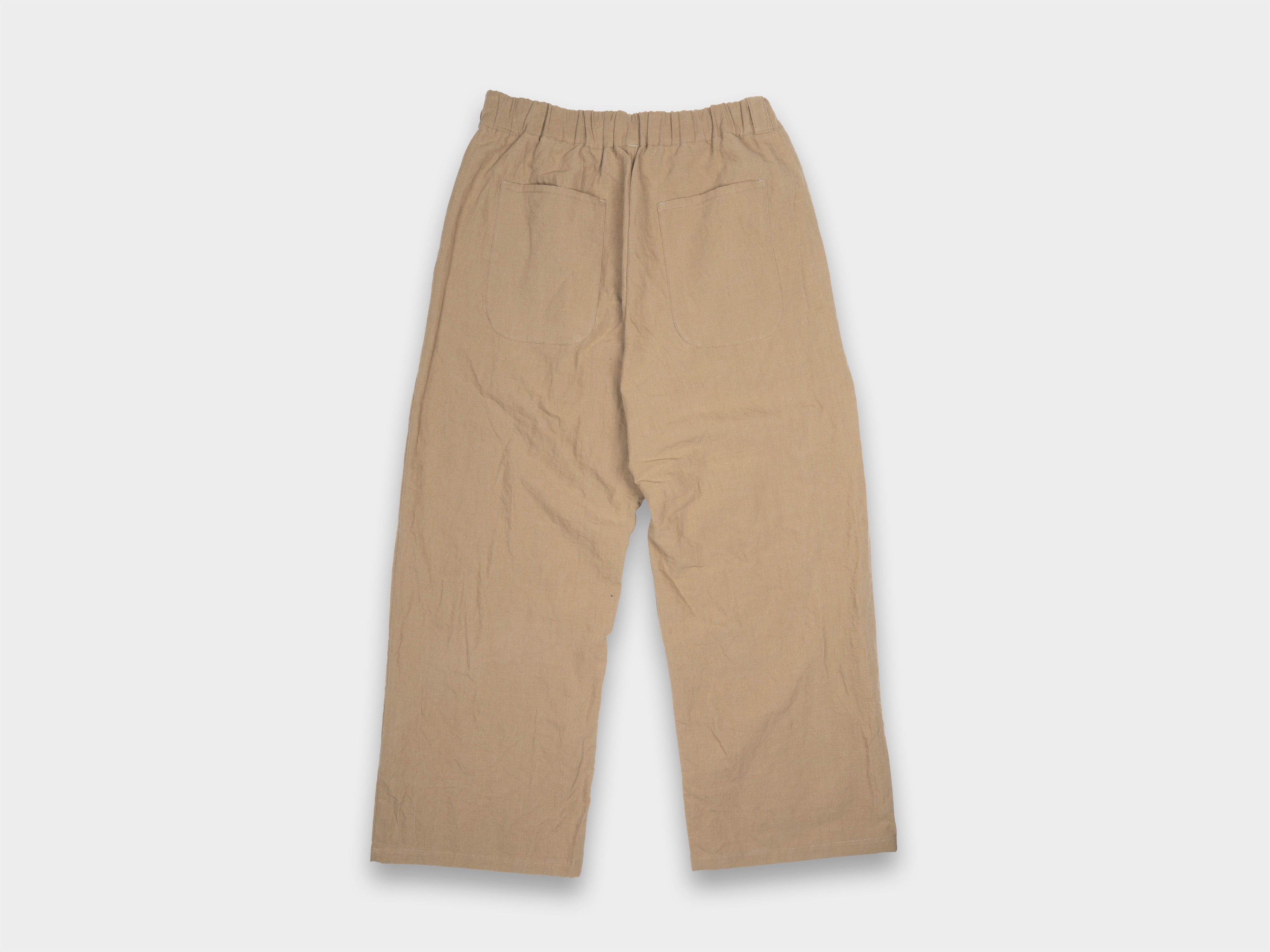 Relaxed-fit elastic waist trouser. Long rise with a loose, wide leg. Cut-away front pockets, rear patch pockets, drawstring waist. Made in Japan.