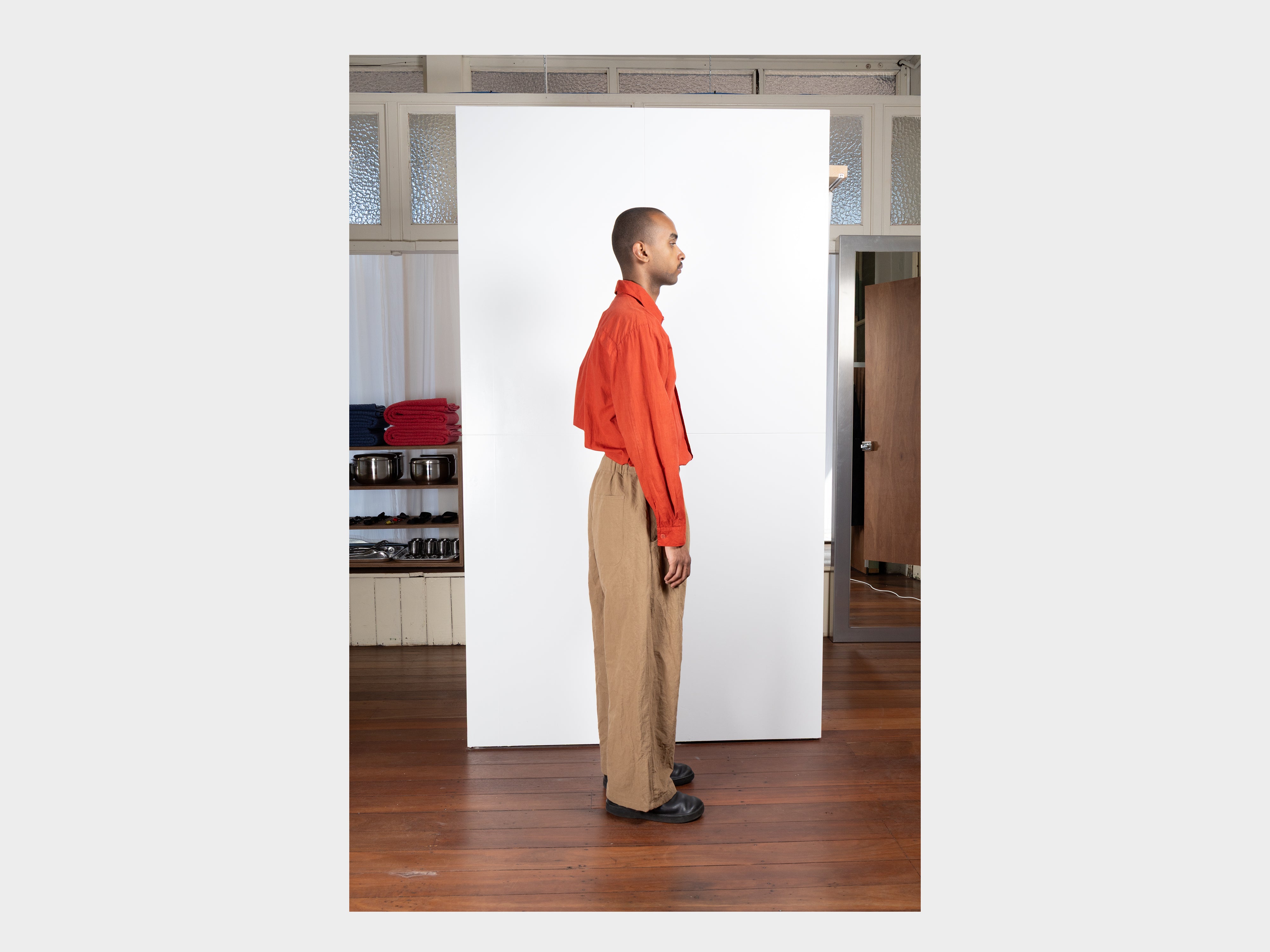 +60% cotton / 40% linen. Cotton grown in the USA, flax grown and spun into high-twist linen in China. High-density and midweight with a dry handle, this cloth is naturally stiff and lifts from the skin, allowing breathability. With washing and wear it becomes softer and lighter, suitable for year-round wear and best enjoyed in the warmer months. Woven for MAN–TLE in Shizuoka, Japan.