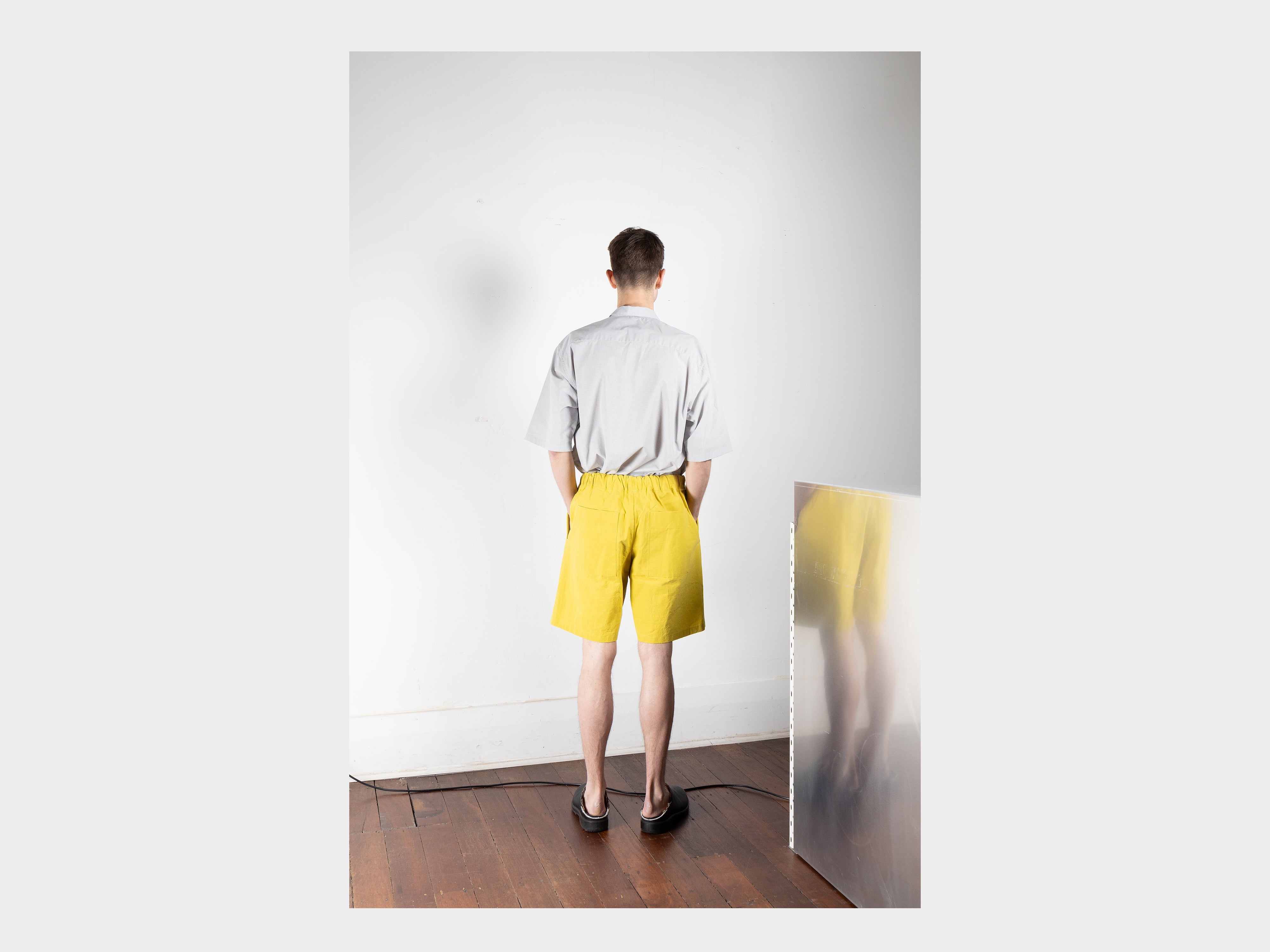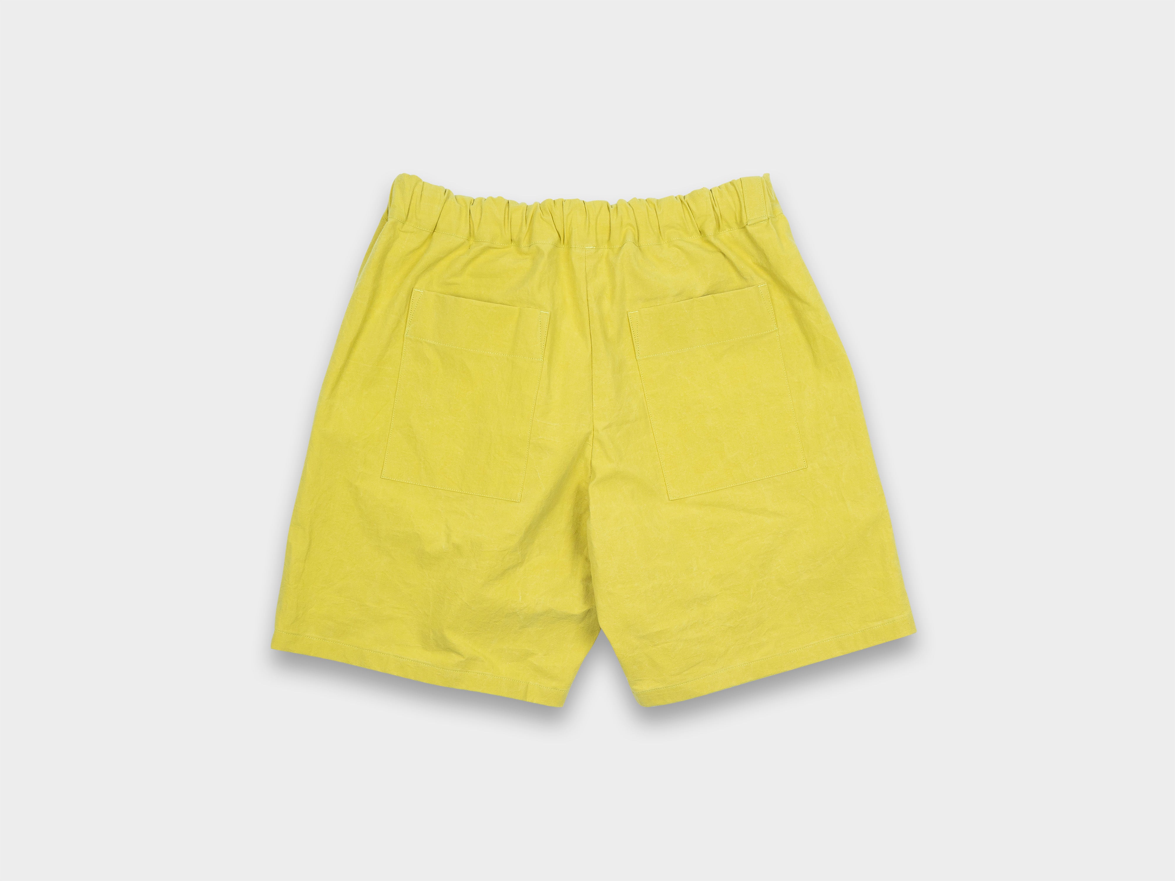 +Relaxed-fit elastic waist shorts. Long rise, cut-away front pockets, rear patch pockets, drawstring waist. Made in Japan.