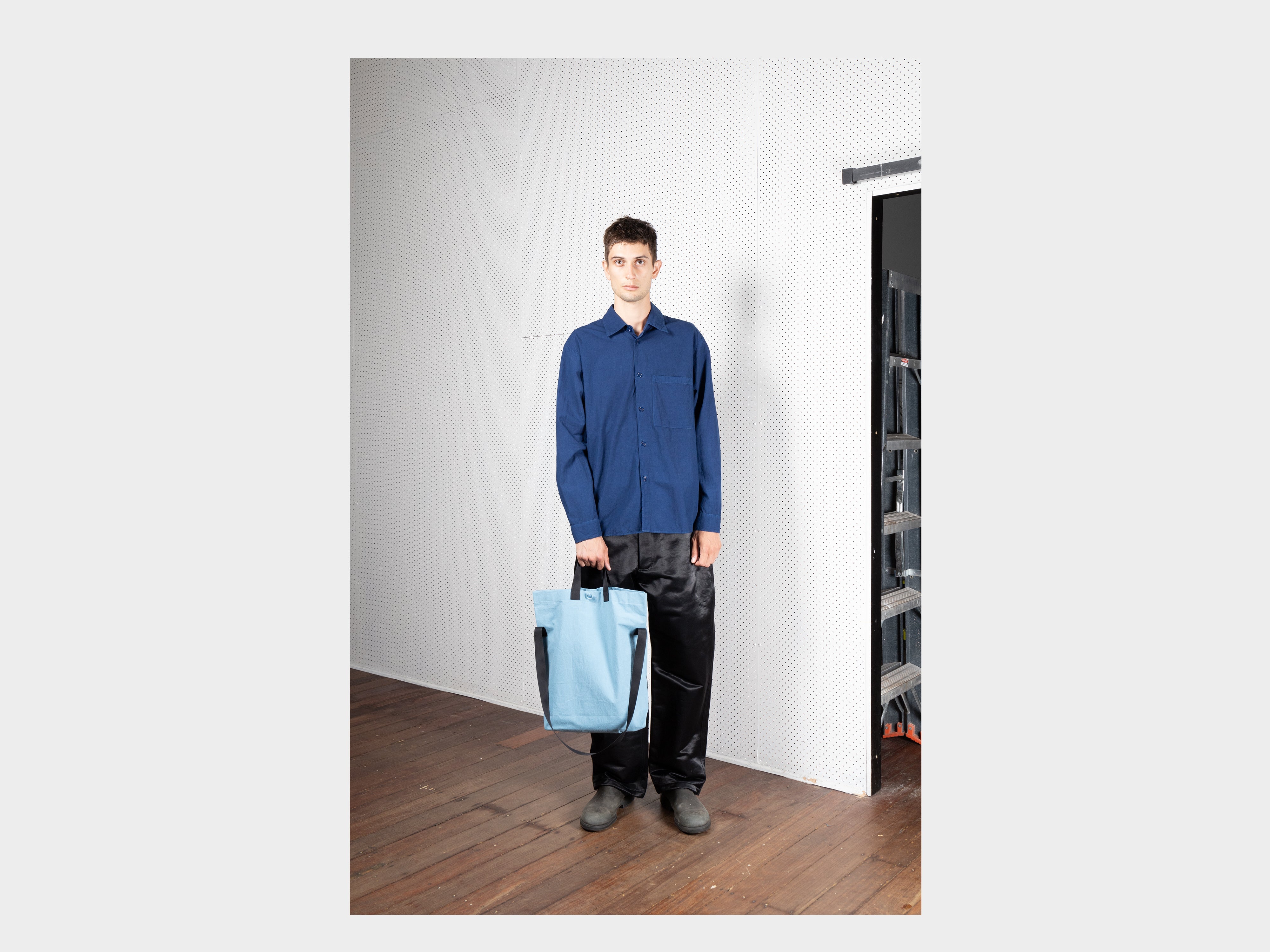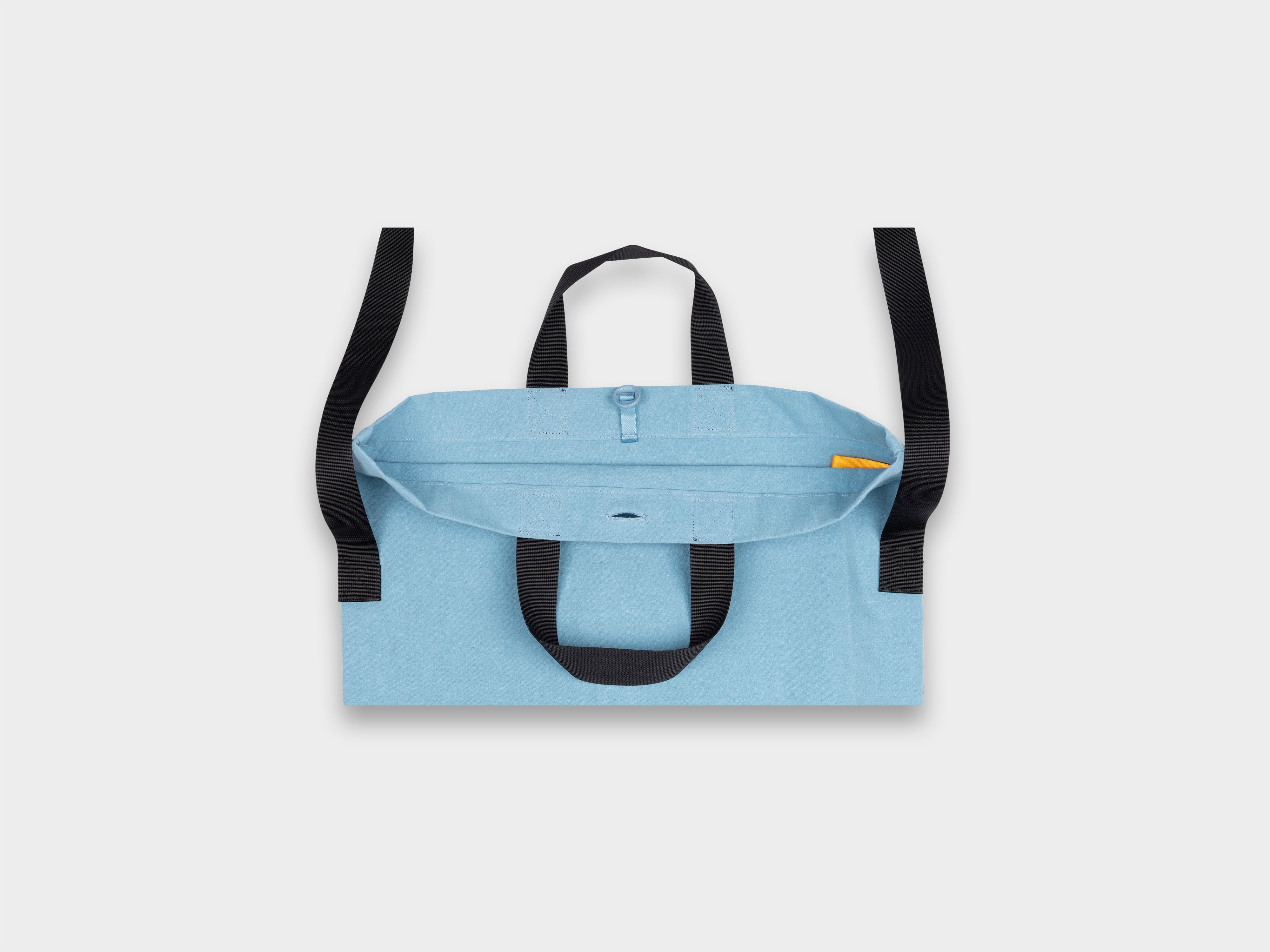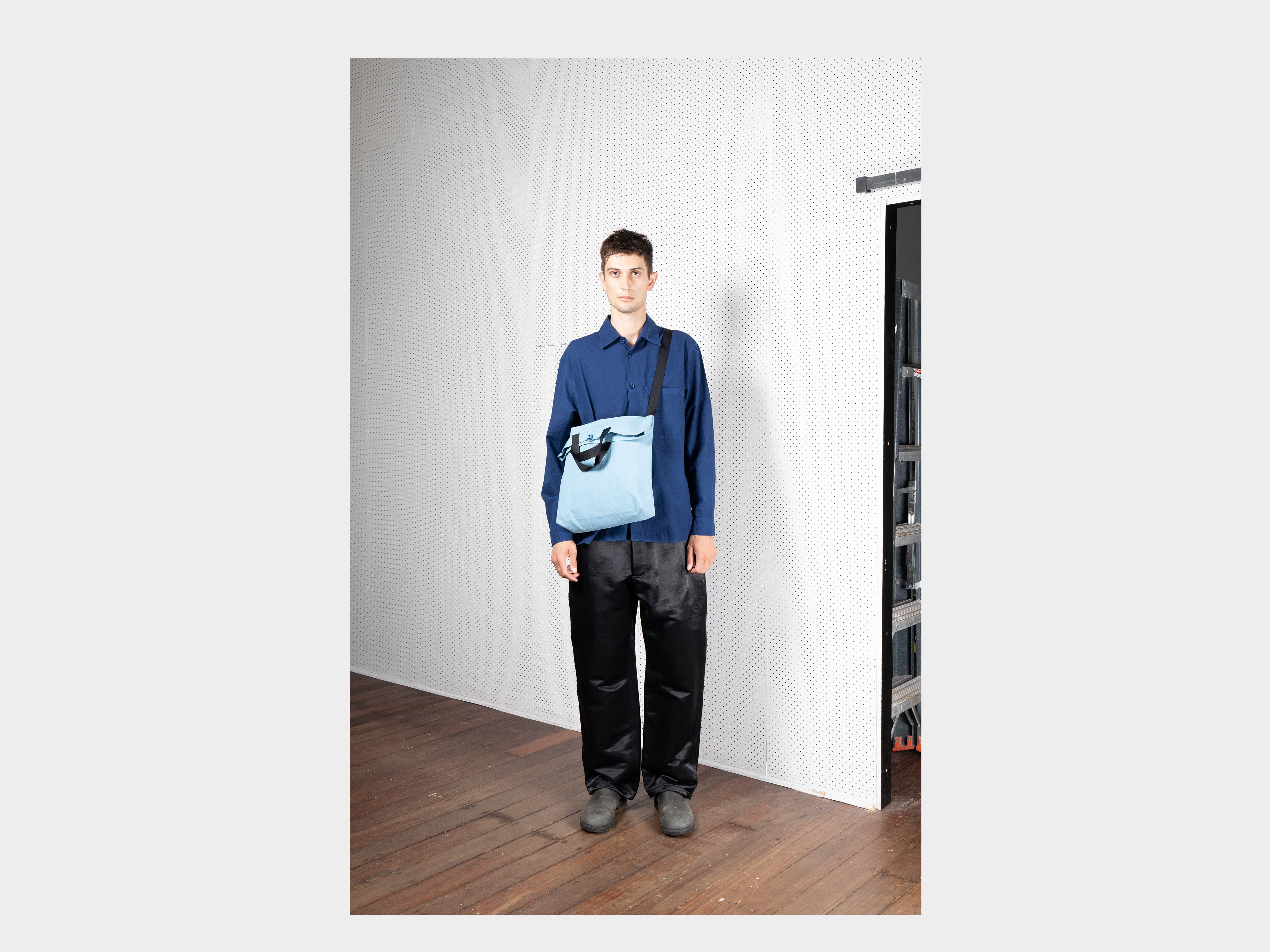 +Fold-over tote with taped slot button closure, two short handles, and single long shoulder strap designed to be worn crossbody. Made in Japan.
