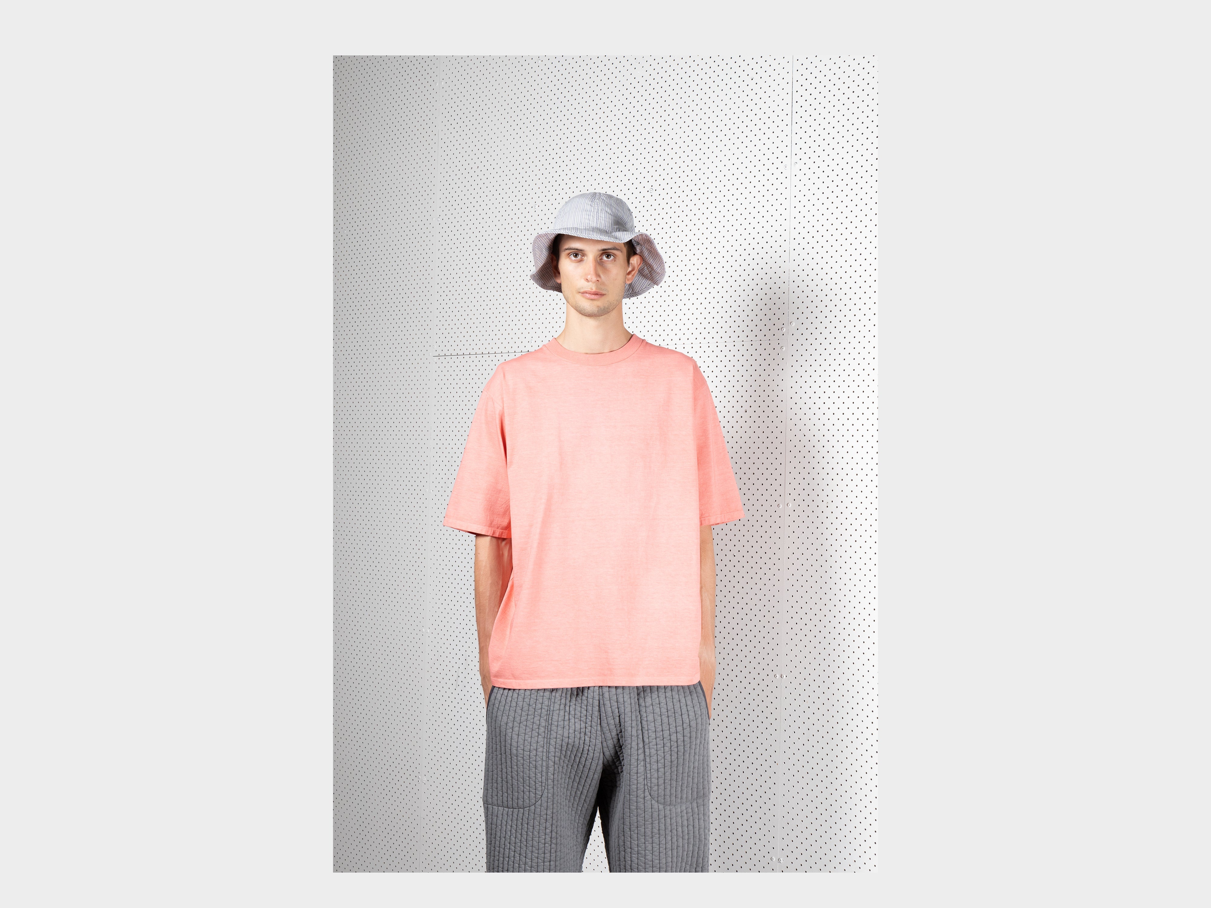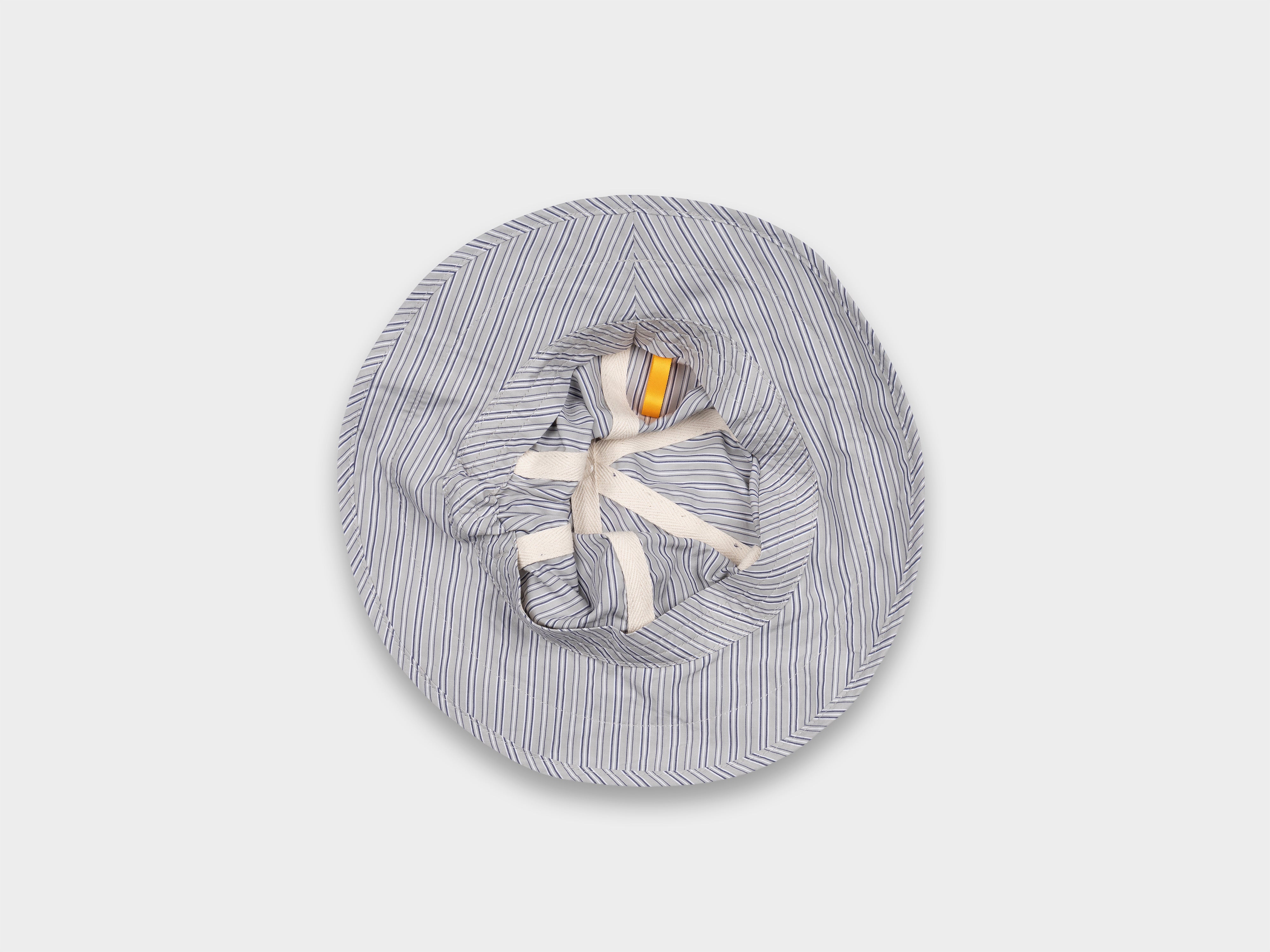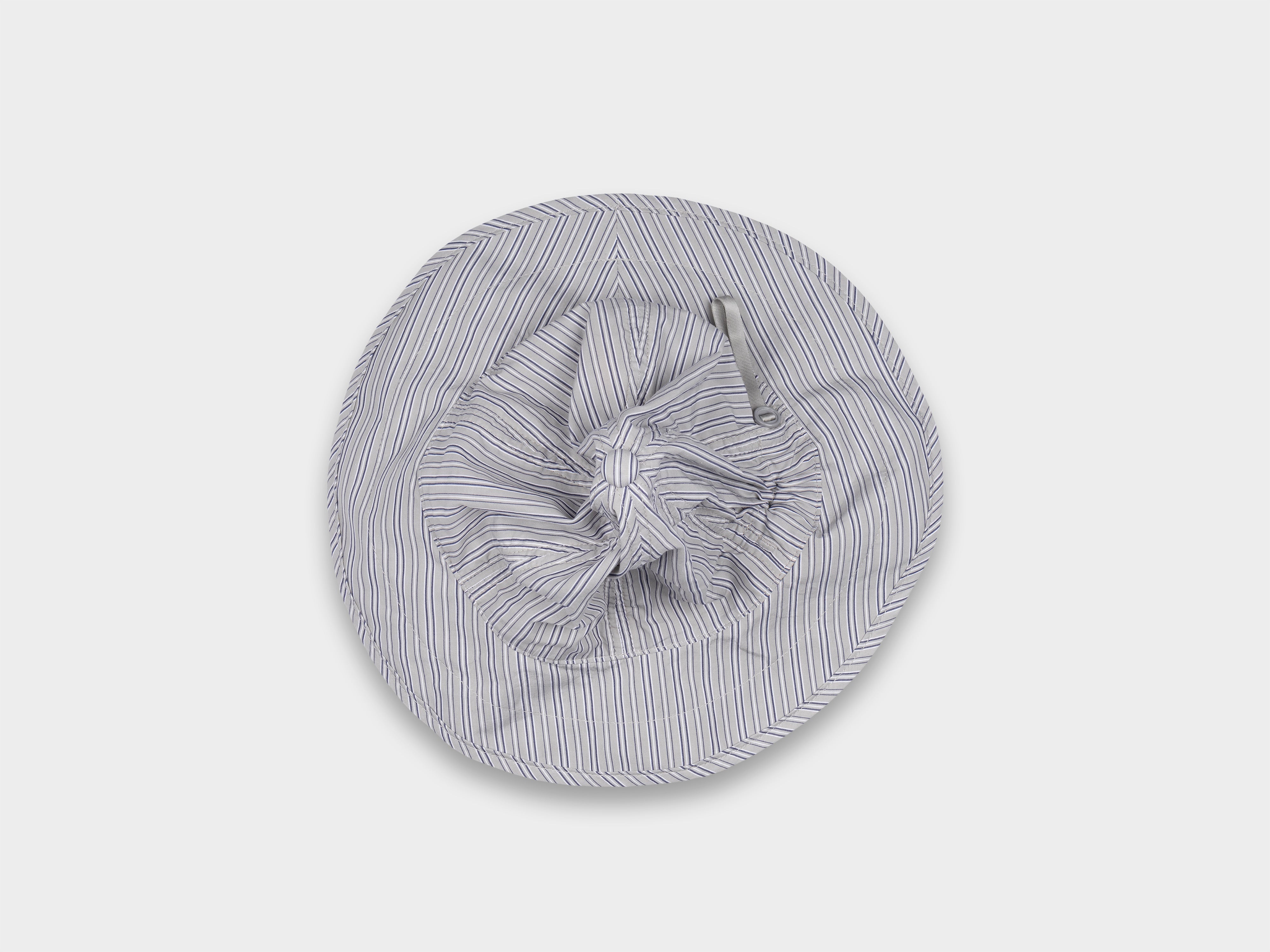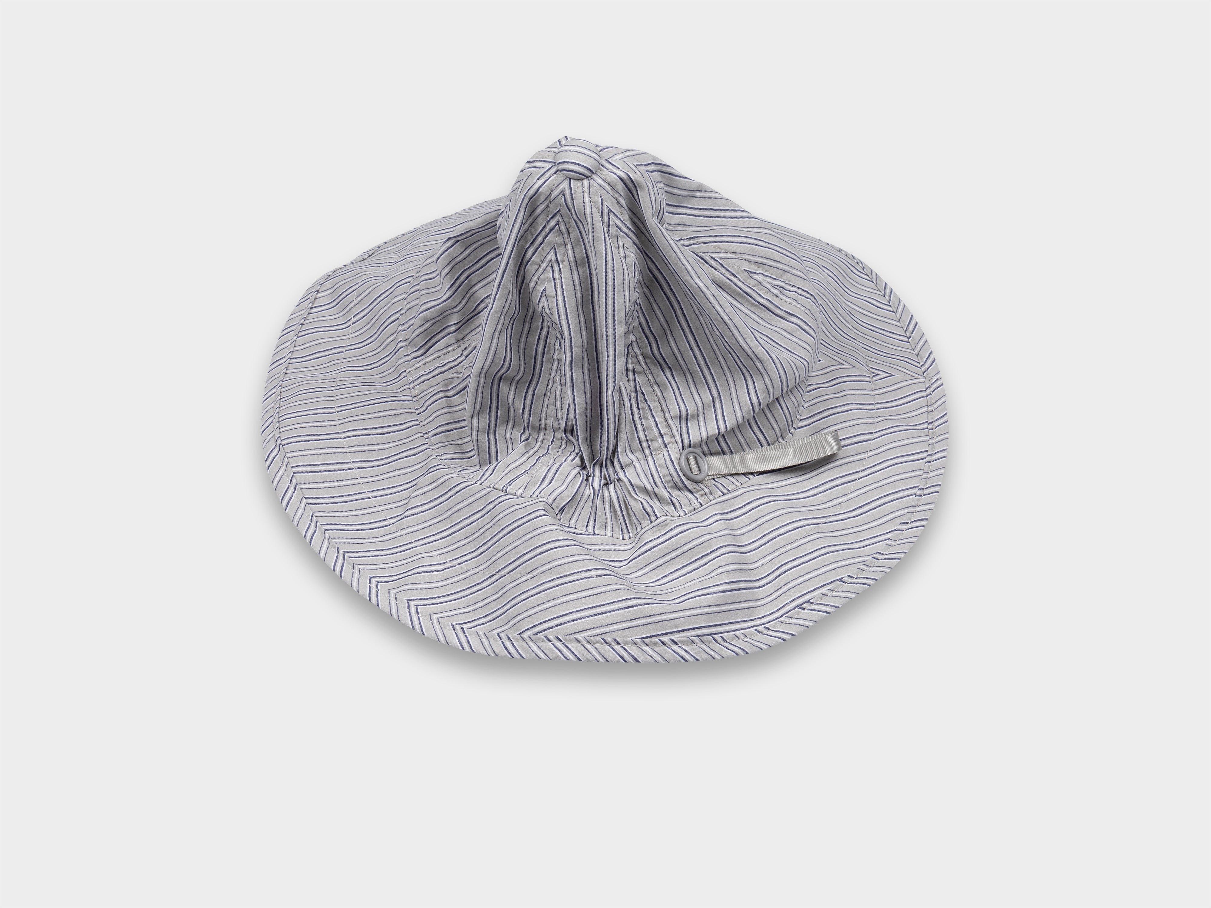 +Deep-cut six panel brim hat. Slot button threaded onto seatbelt tape, used to adjust size. Cinch to distort shape. Made in Japan.