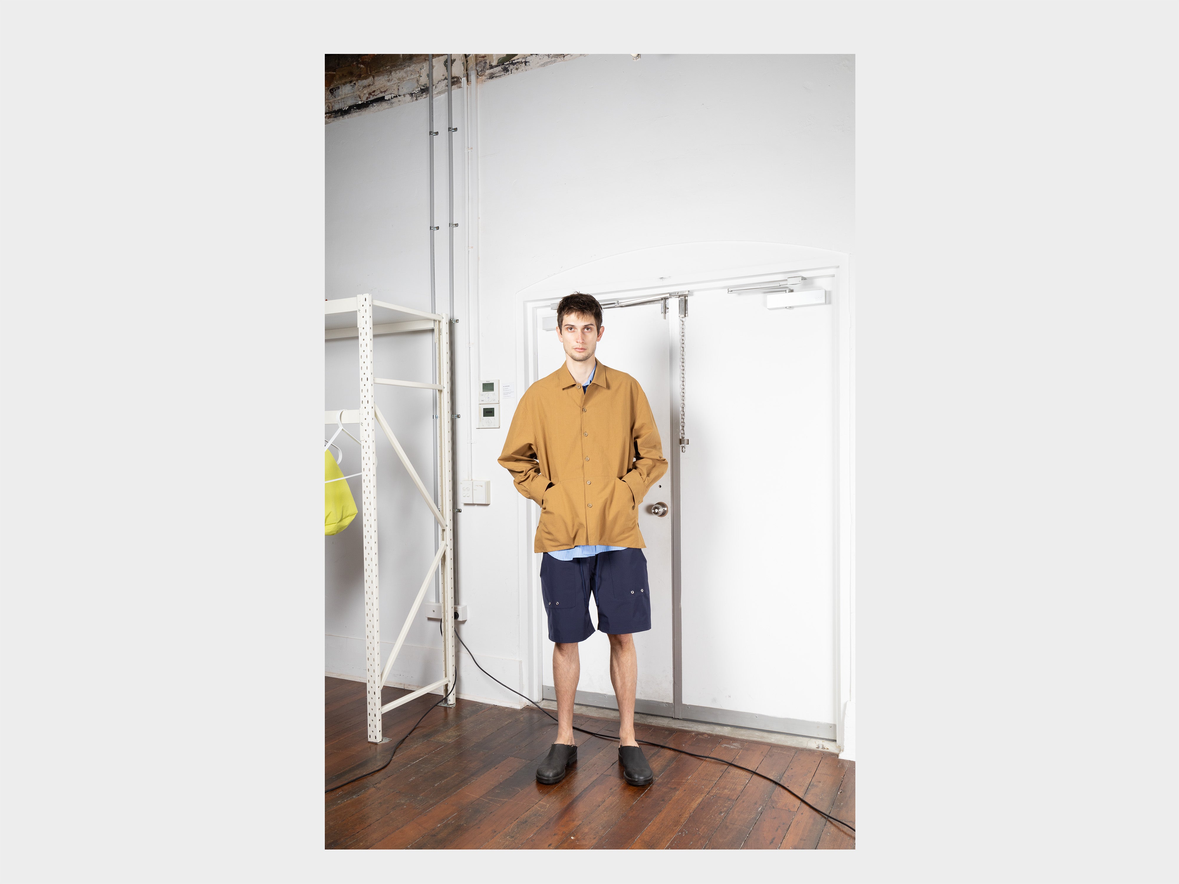 +Boxy-fit overshirt with large, full-width front pockets. Generous sleeves, pleated cuffs with single button closure, pointed collar with hidden stand, side-seam vents. Made in Japan.