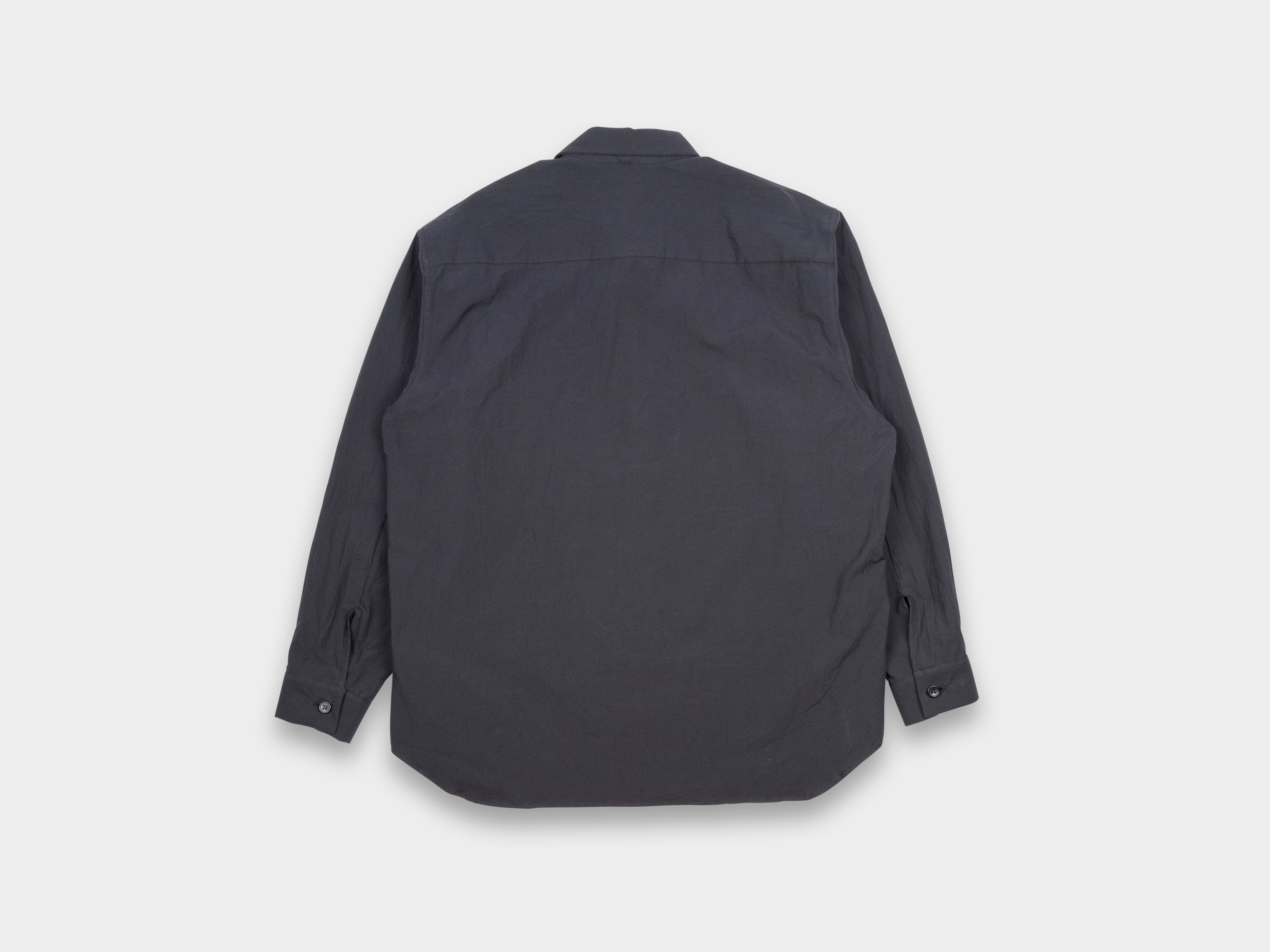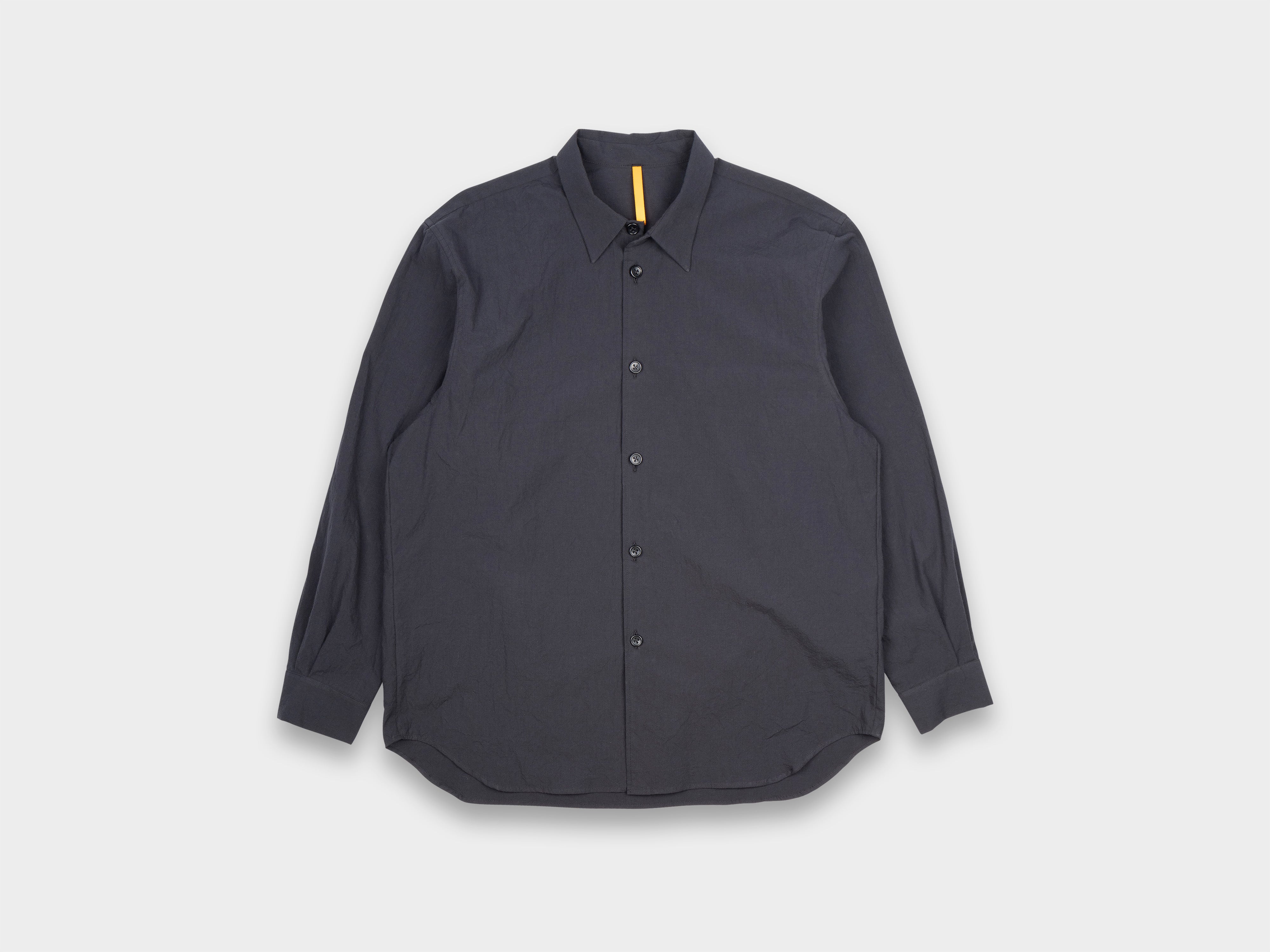 +Loose-fitting shirt. Slightly dropped shoulders, relaxed sleeves, pleated cuffs with single-button closure, pointed collar, button front, curved hem. Made in Japan.