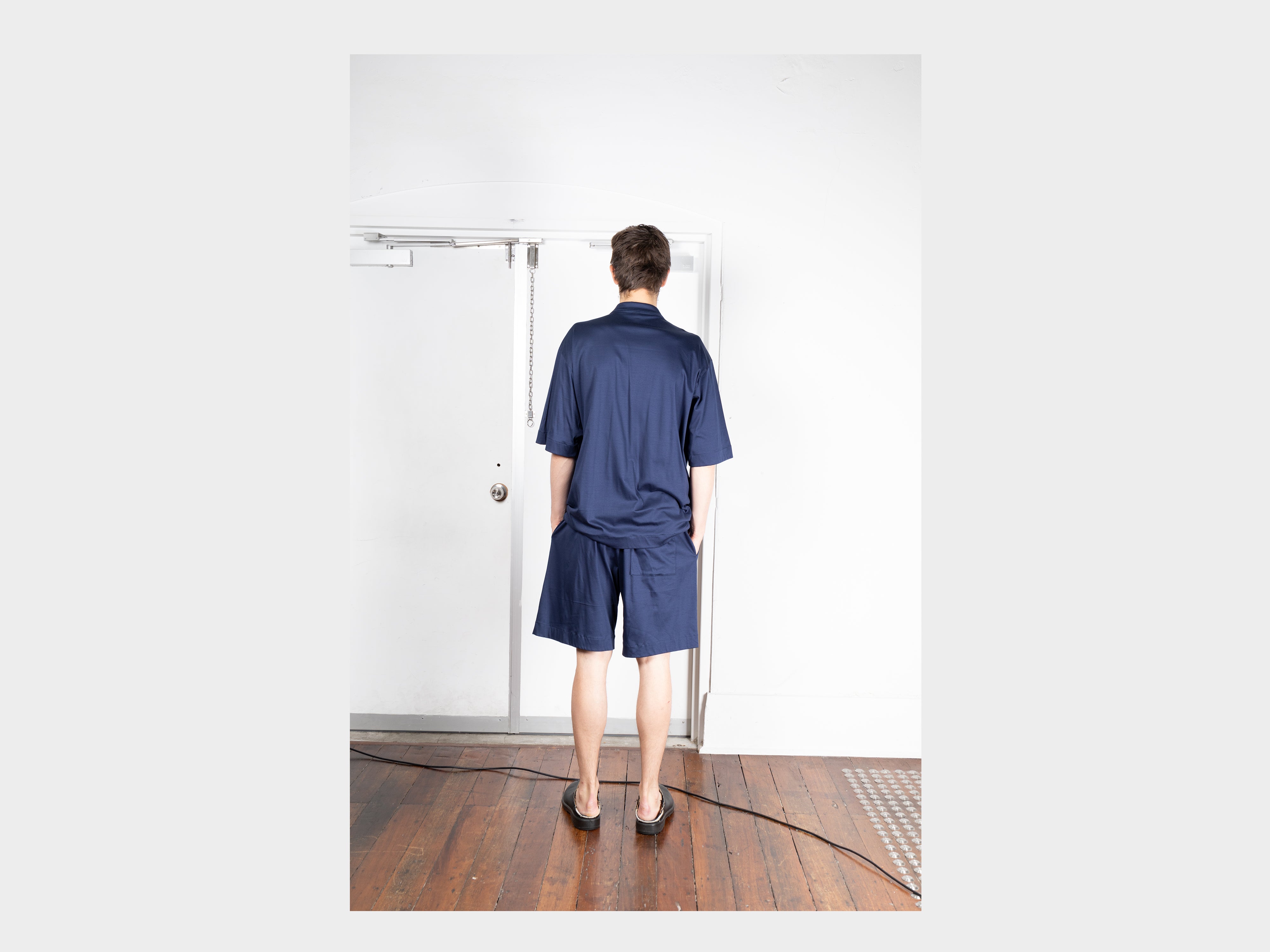 +Boxed set of sleepwear, cut and sewn in our Perth studio using MAN–TLE archival fabric. Relaxed-fit set features button front shirt with pointed collar and chest pocket, and elastic waist shorts with back patch pocket. Made in Australia.