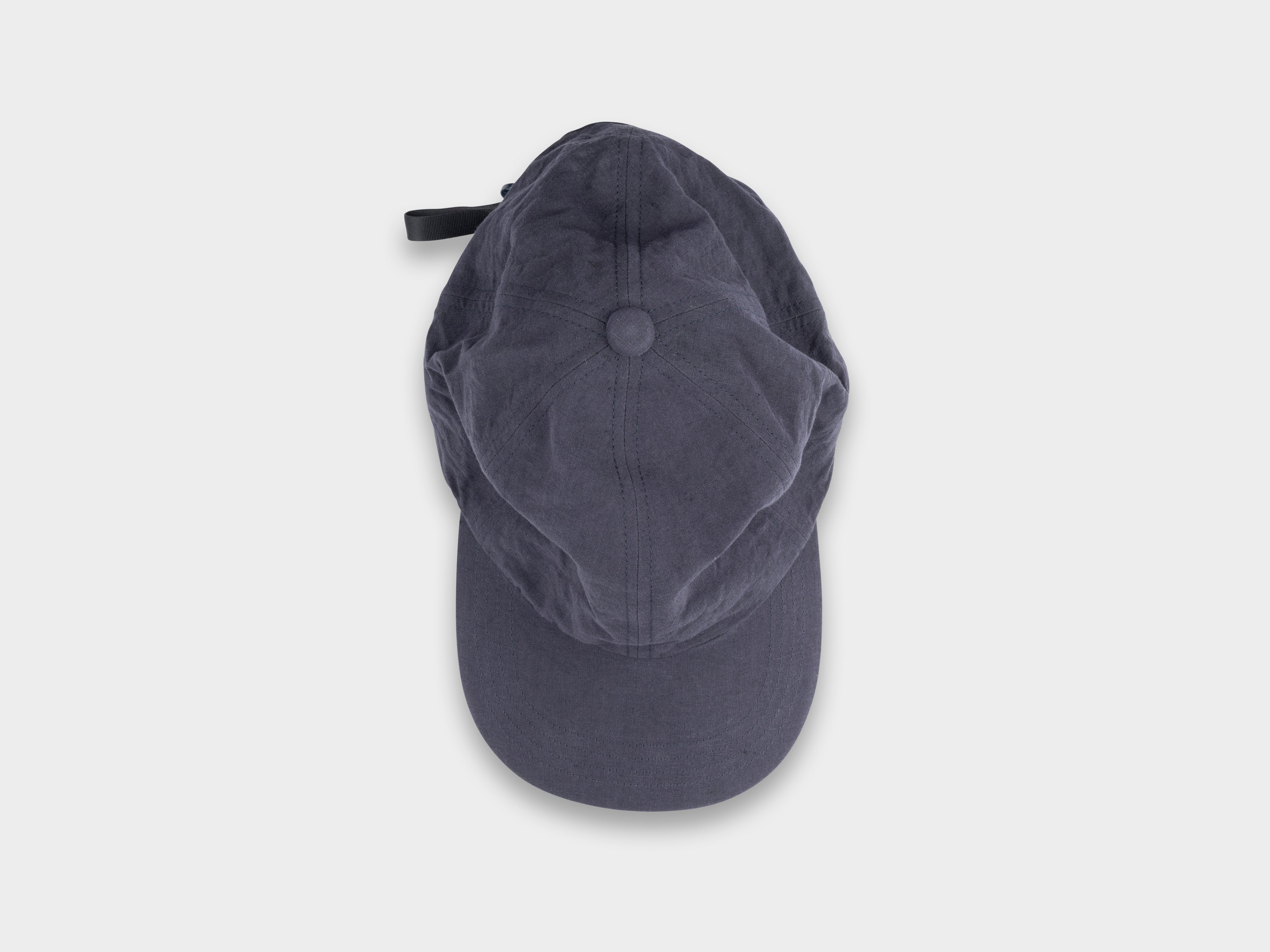 Deep-cut six panel cap. Slot button threaded onto seatbelt tape, used to adjust size. Made in Japan.