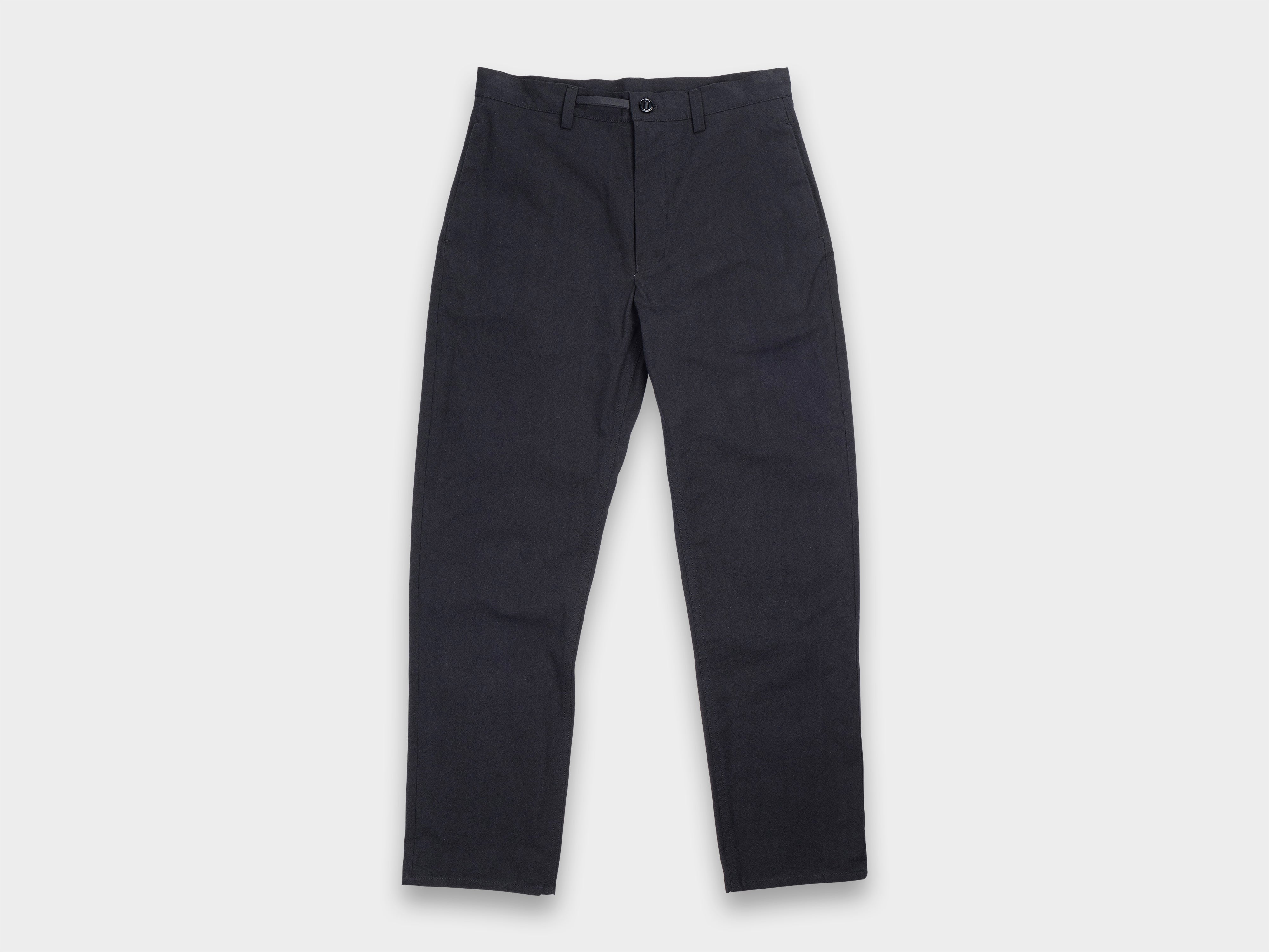 Relaxed straight-leg pants. Seat belt tape with adjustable button at the front, side-seam pockets and back patch pockets. Made in Japan.