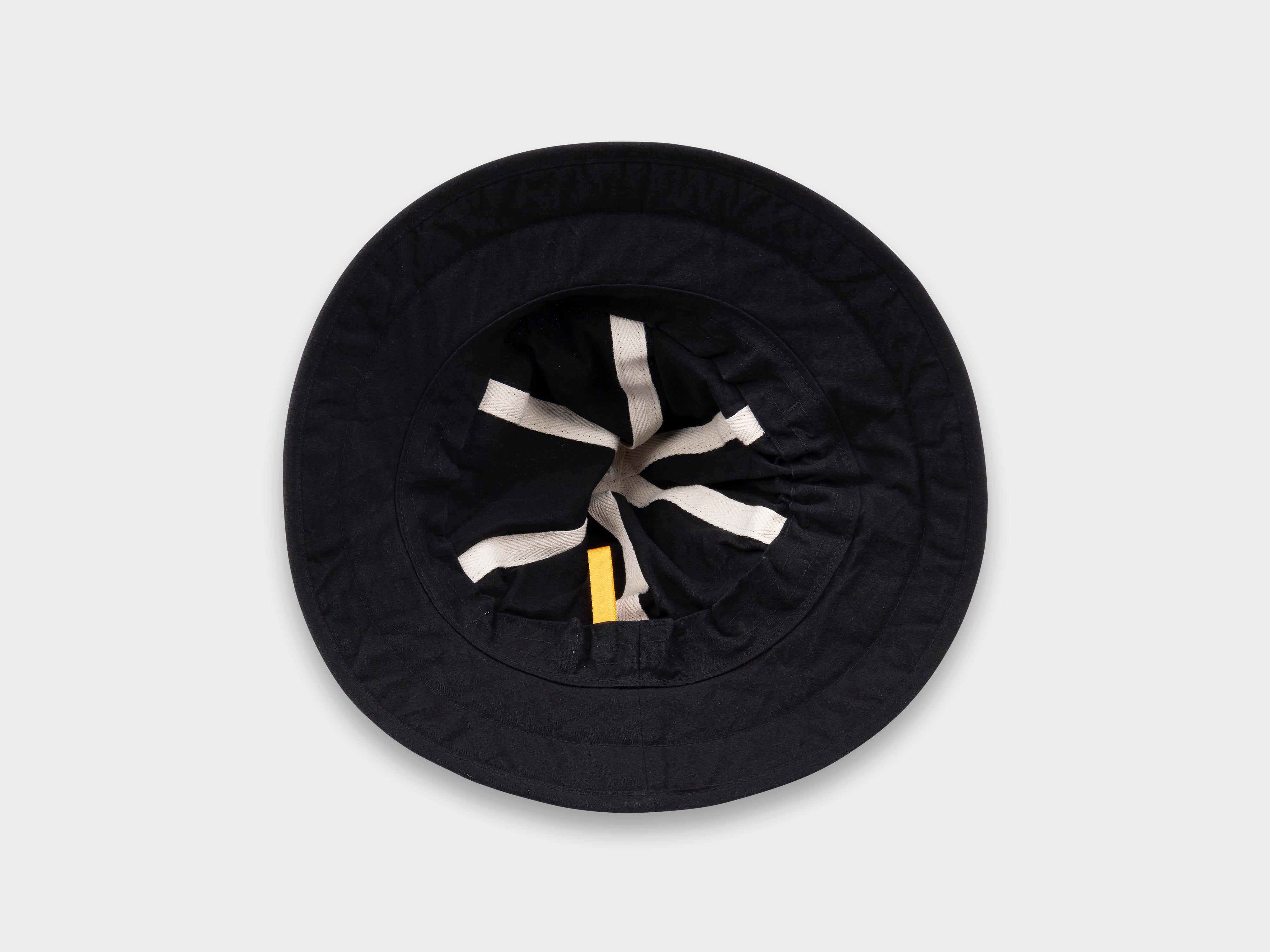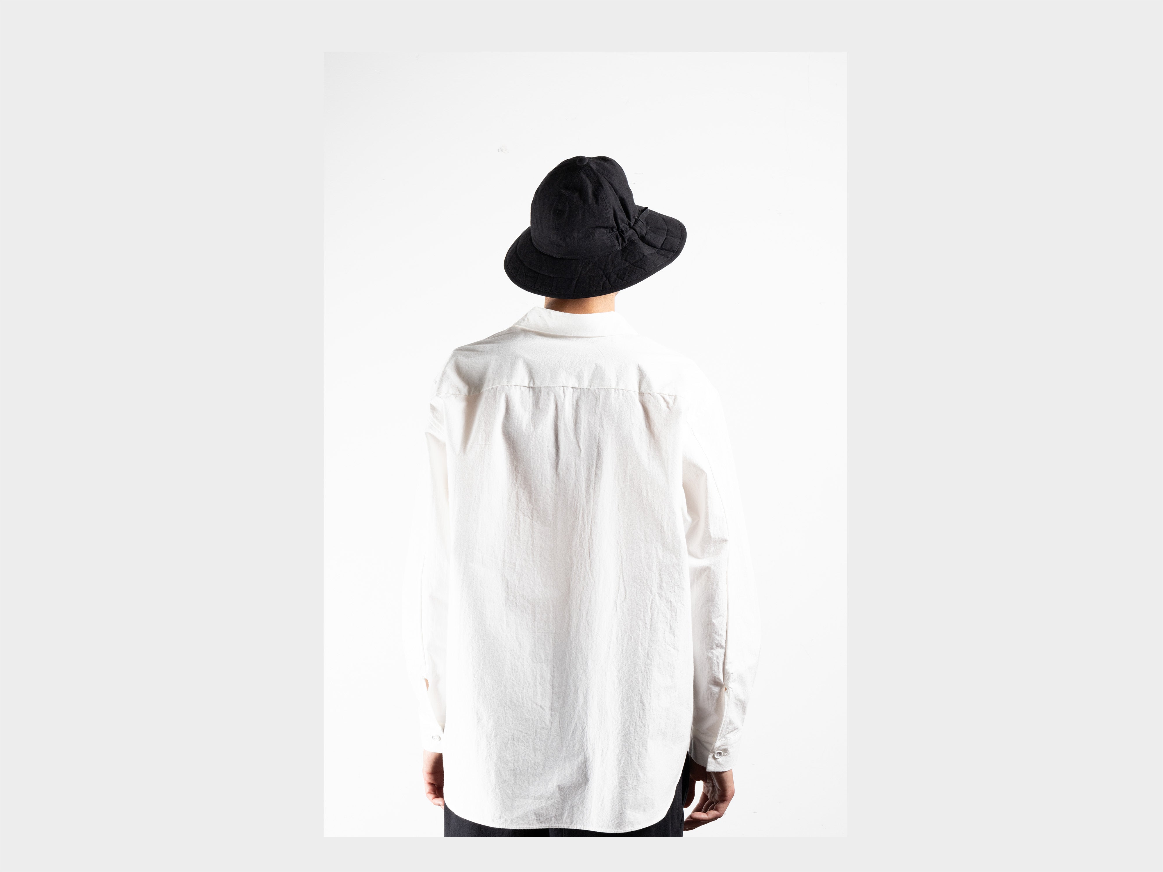 +Deep six panel hat with slot button threaded onto seatbelt tape, used to adjust the size. Cinching distorts shape and becomes defining feature. Made in Japan.