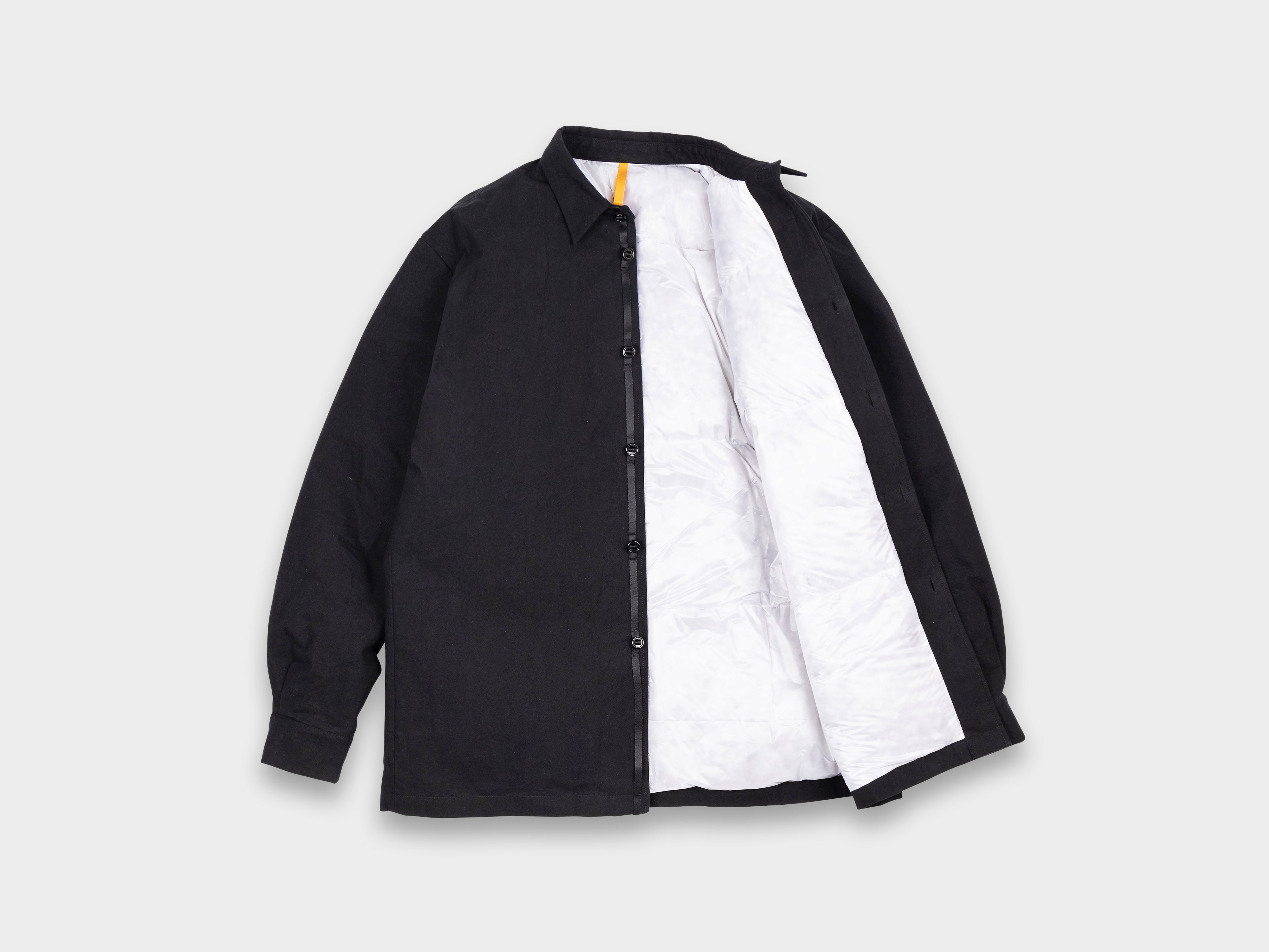 Insulated "Shirt 1", combining our most longstanding shirt with the technology and detail of our Down-Series. Relaxed-fit shirt filled with ethically farmed European silver goose down, cleaned and processed in Japan by Kawada Feather. This down retains its original mottled colour, as no bleach is used. To showcase its unique tone, the garment is lined with a transparent 100% nylon micro-ripstop developed by Toray. Slot buttons threaded onto seat belt tape, straight hem, pointed collar, pleated cuffs with single button closure. Comprising 90% down and 10% feather to reduce clumping, this product has a fill-power rating of 850. Read our Kawada Feather story here. Made in Japan.