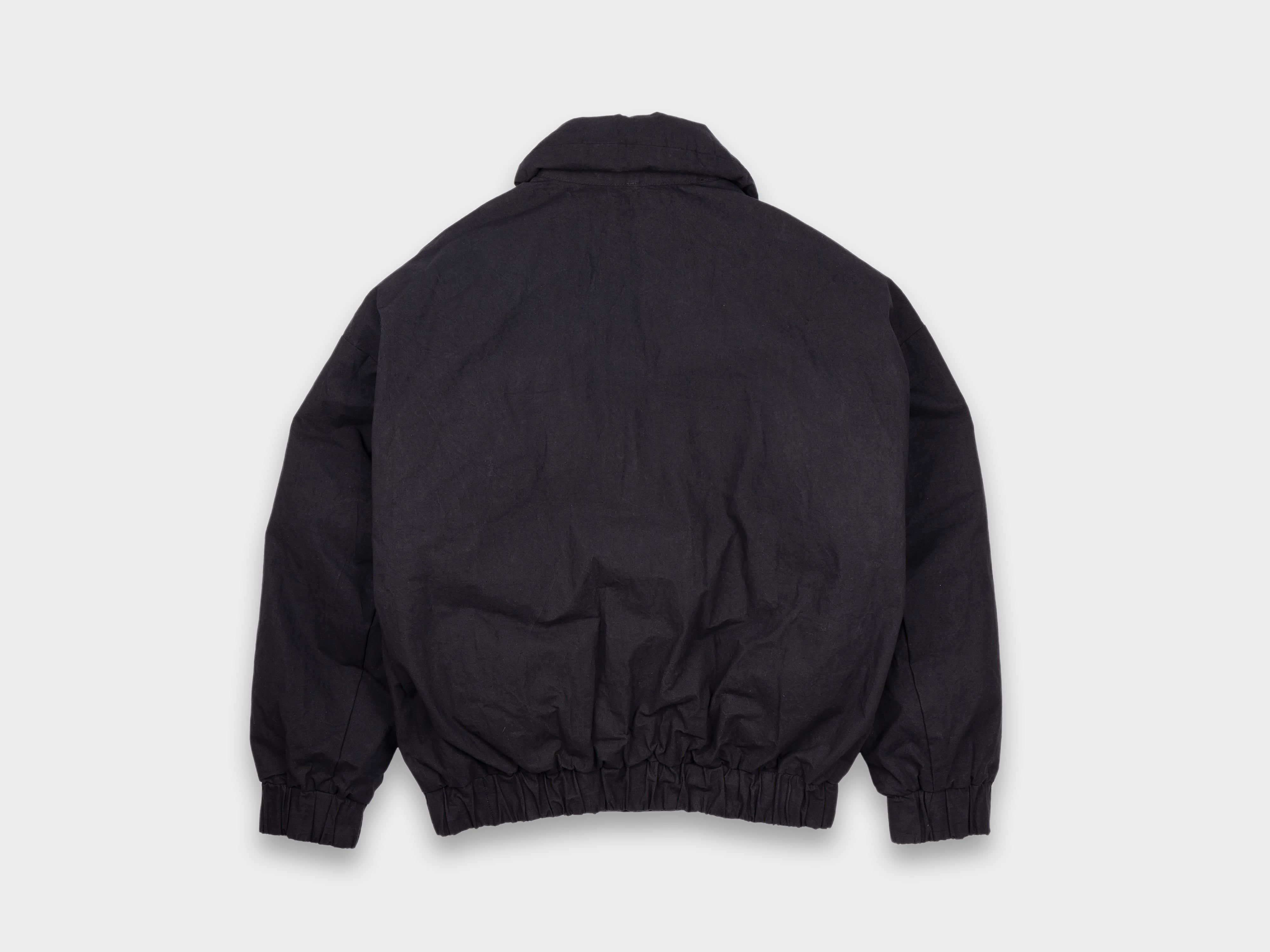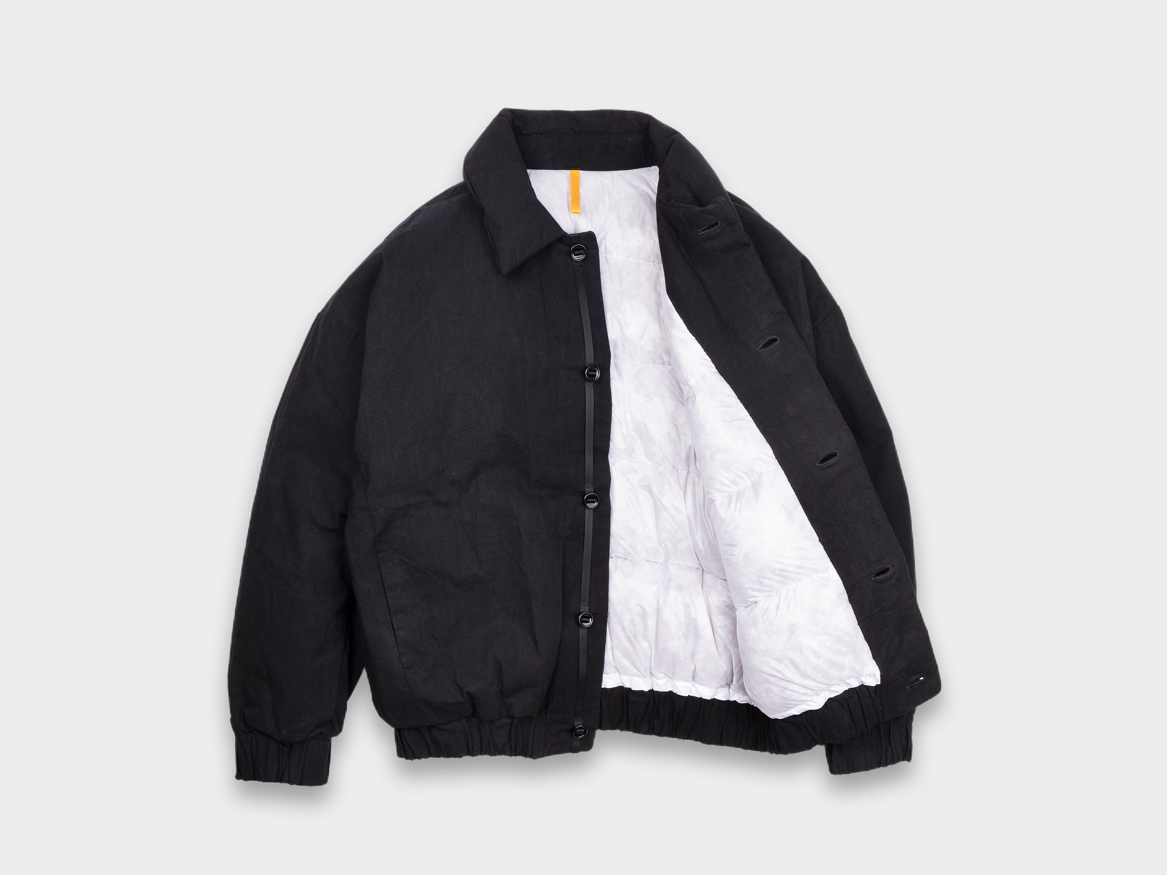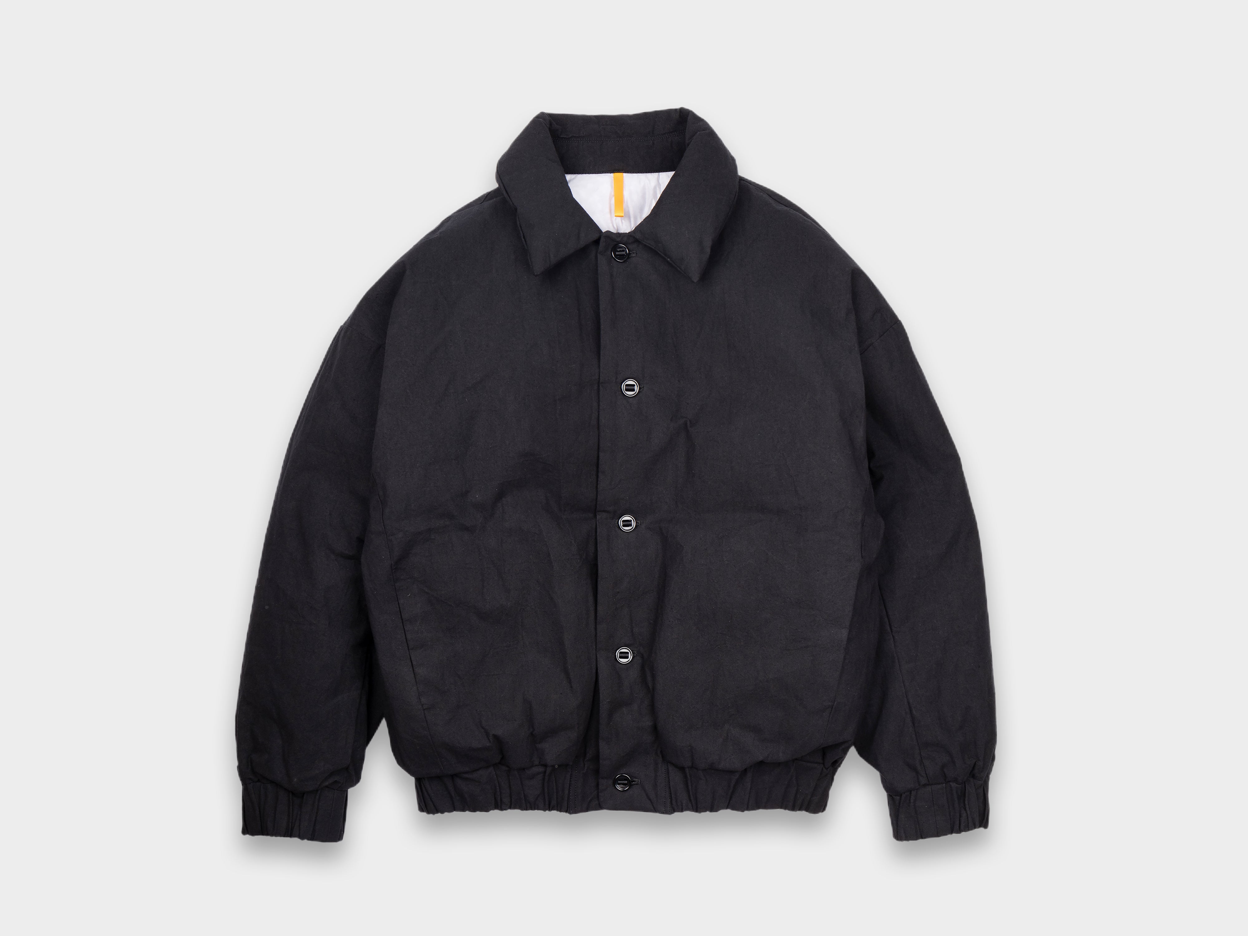Oversized down-filled blouson. Features ethically farmed European silver goose down, cleaned and processed in Japan by Kawada Feather. This down retains its original mottled colour, as no bleach is used. To showcase its unique tone, the garment is lined with a transparent 100% nylon micro-ripstop developed by Toray. Comprising 90% down and 10% feather to reduce clumping, this product has a fill-power rating of 850. Slot buttons threaded onto seat belt tape, dropped shoulders, elastic cuffs and hem, generous sleeve and body. Read our Kawada Feather story here. Made in Japan.
