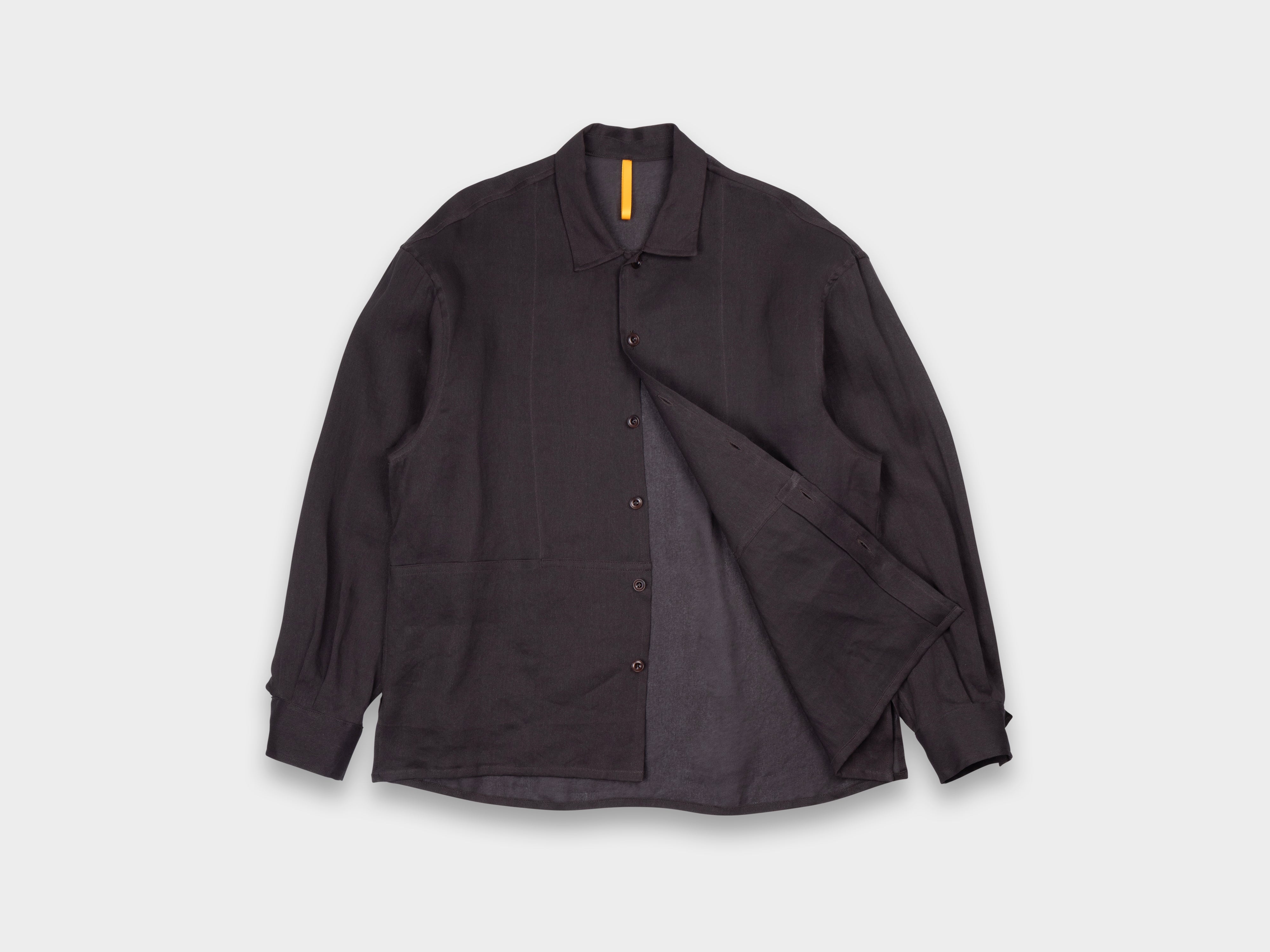 Boxy-fit overshirt with large, full-width front pockets. Generous sleeves, pleated cuffs with single button closure, pointed collar with hidden stand, side-seam vents. Made in Japan.