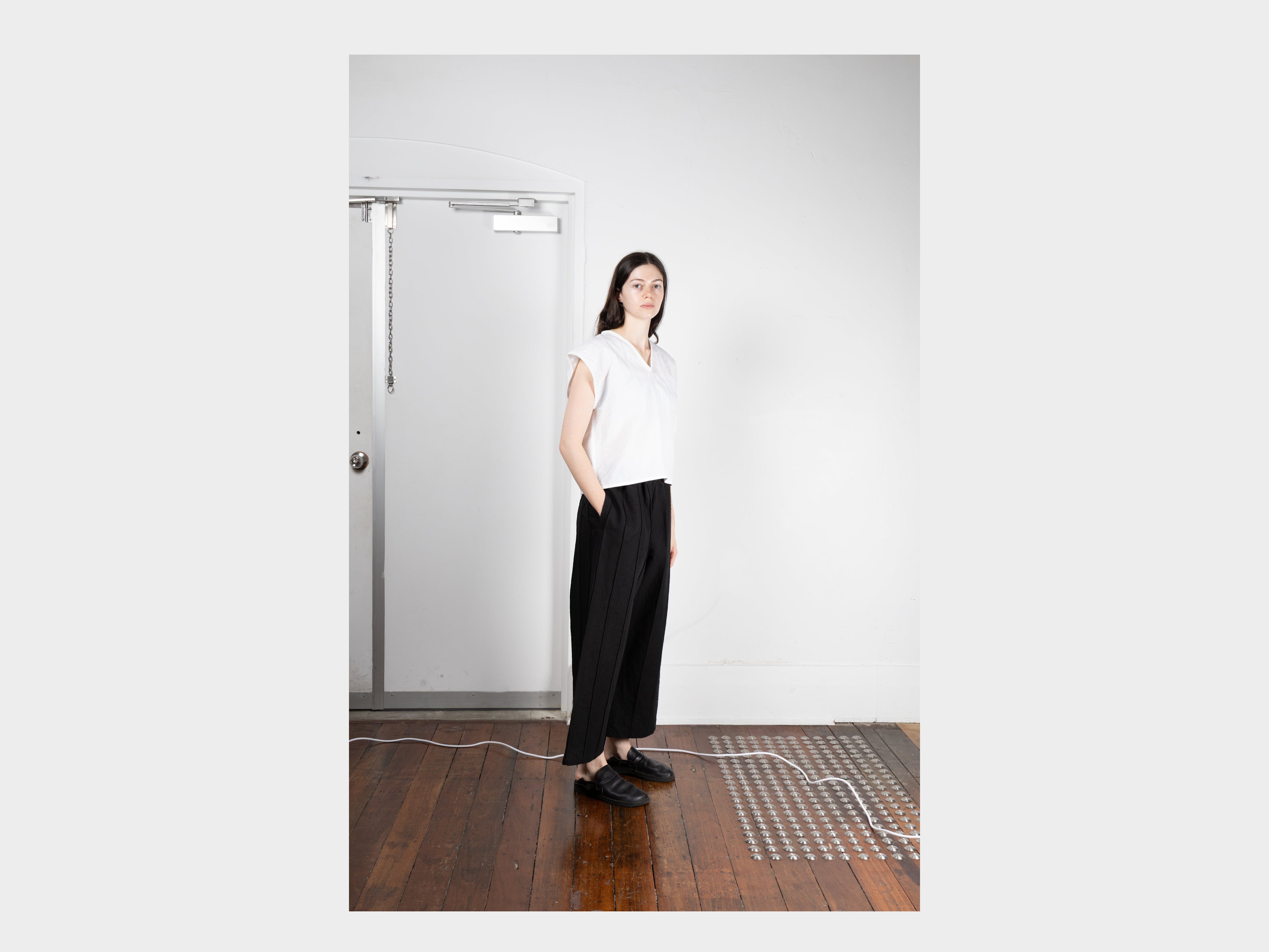 +Pullover top, made from a square block for a boxy fit. V-neck, centre back and centre front seams, bound edges and flat seams. Made in Japan.