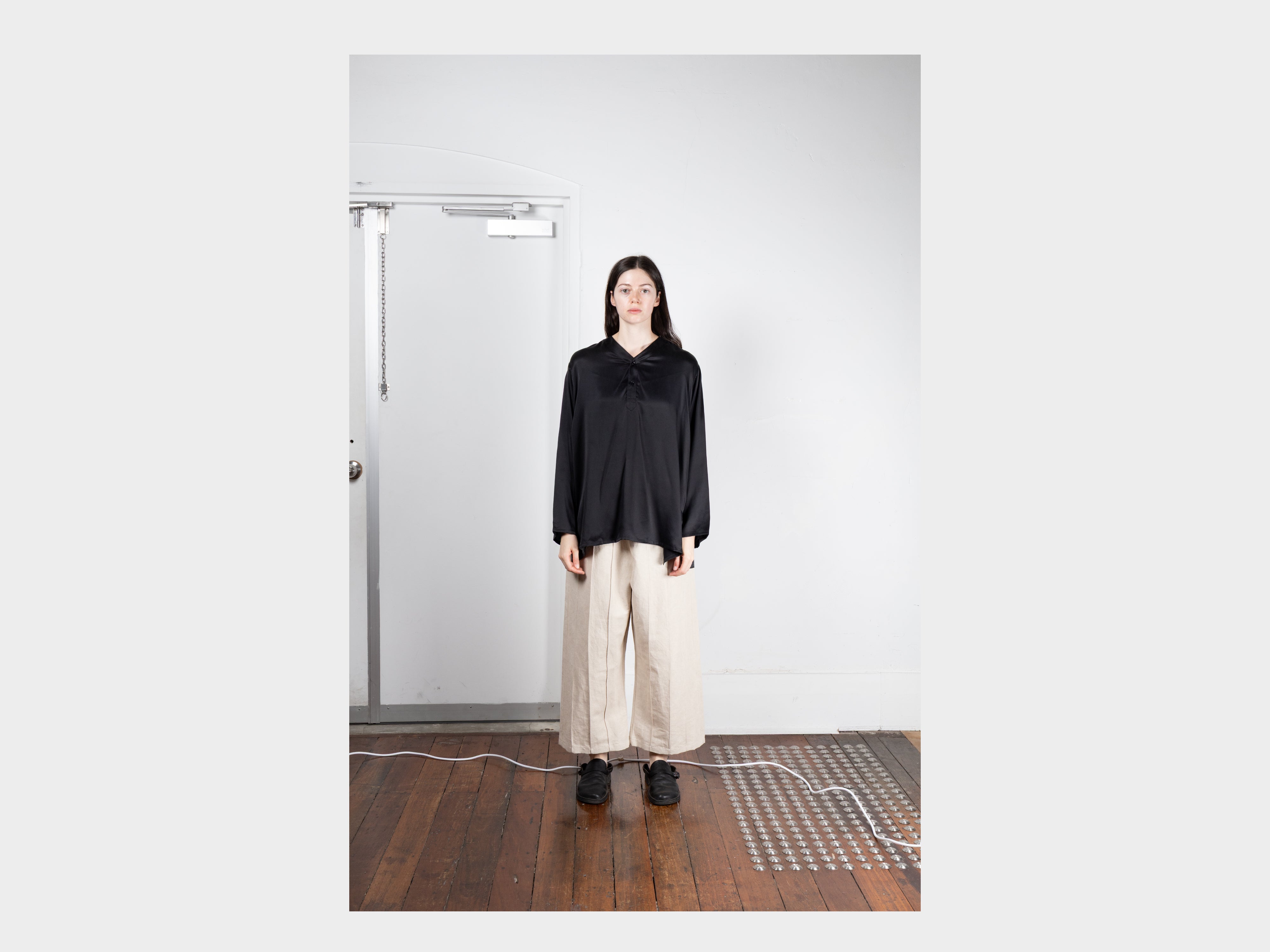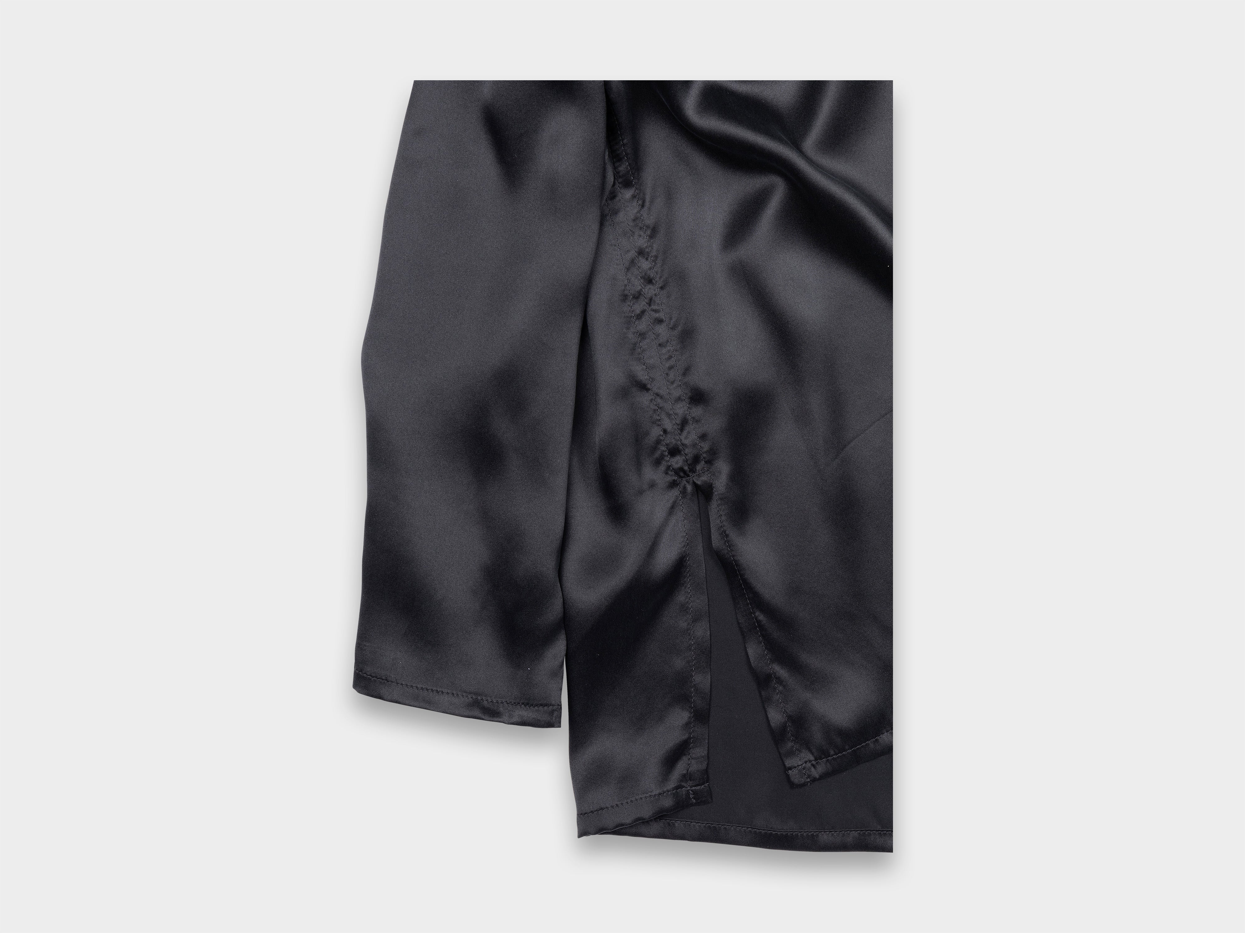 +100% silk satin. Sand-washed for a soft matte handle, this cloth is lightweight and drapes across the skin. Woven in South Korea.