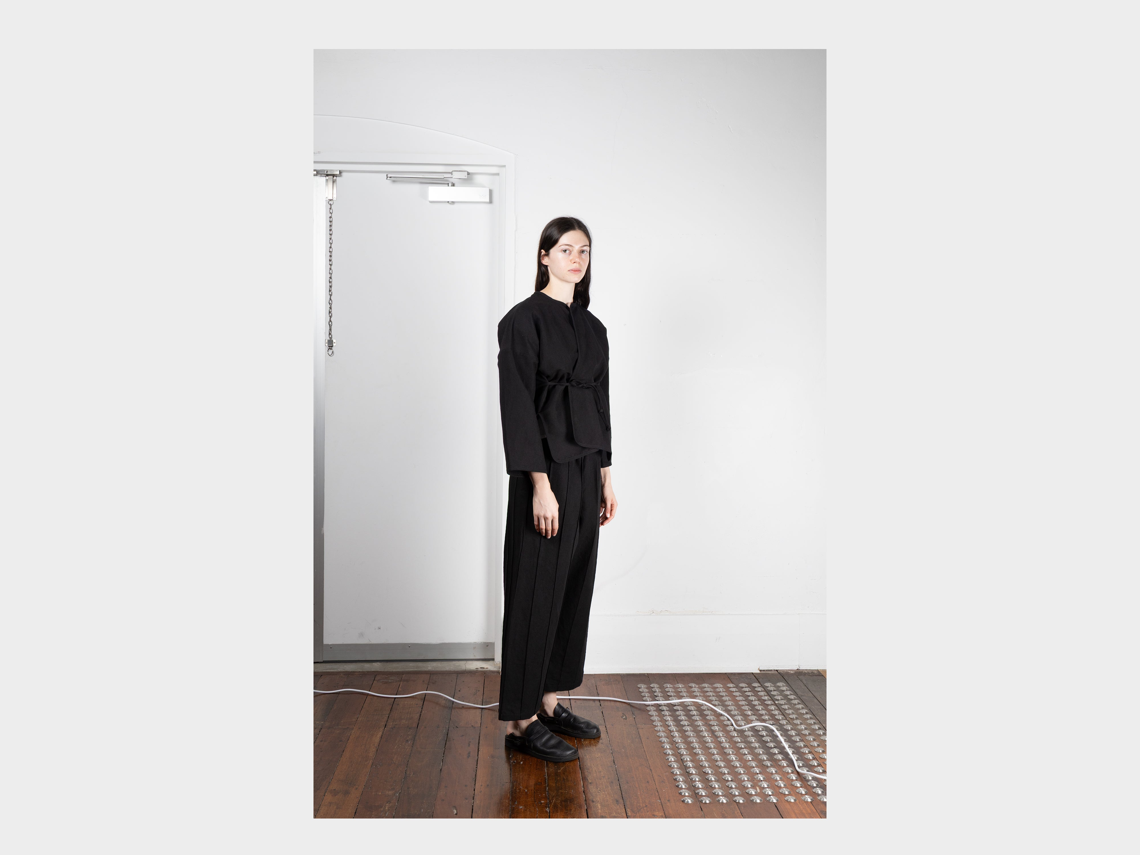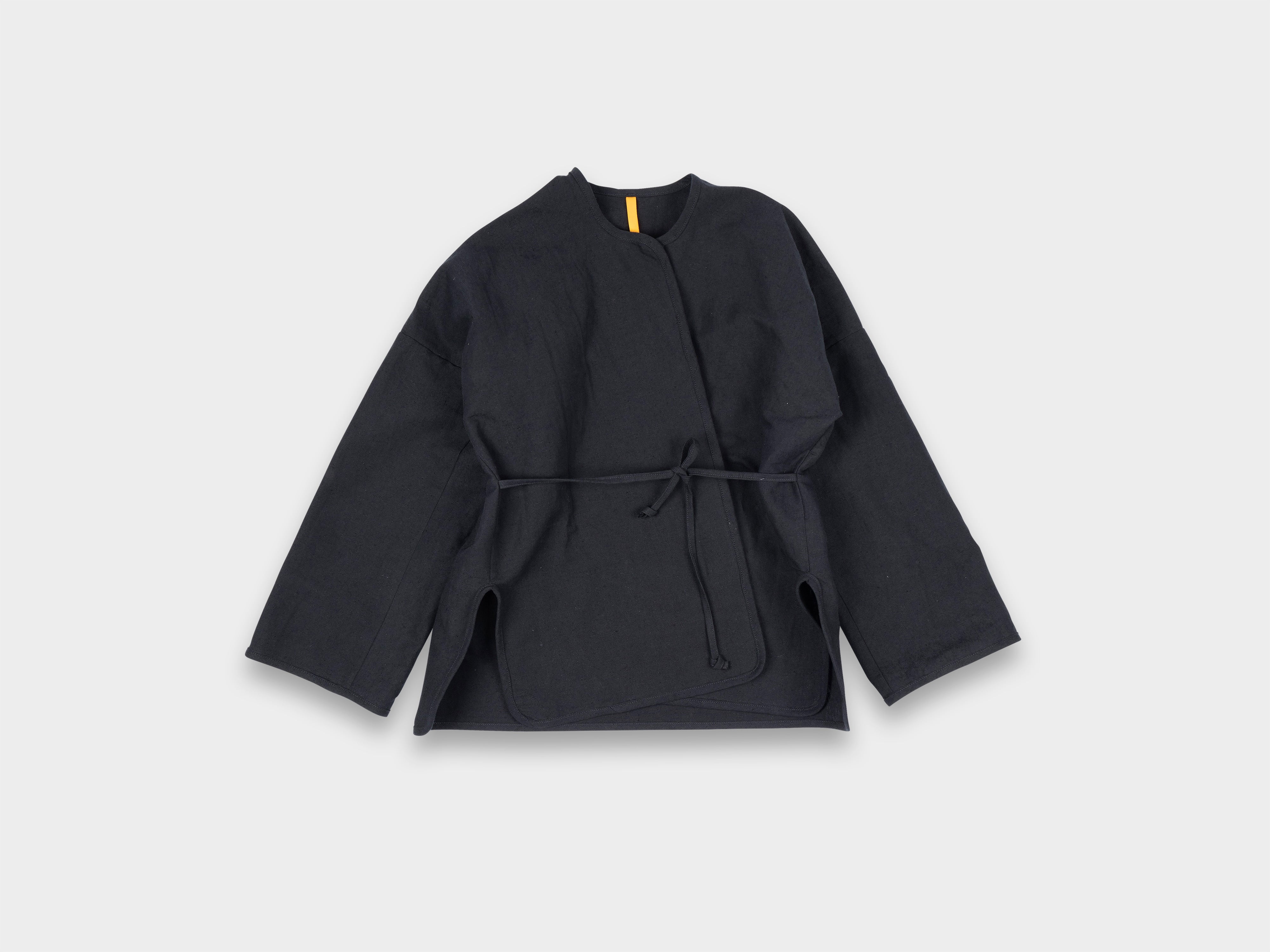 +Wrap cardigan with ties. Made from rounded square panels for geometric structure. Made in Japan.