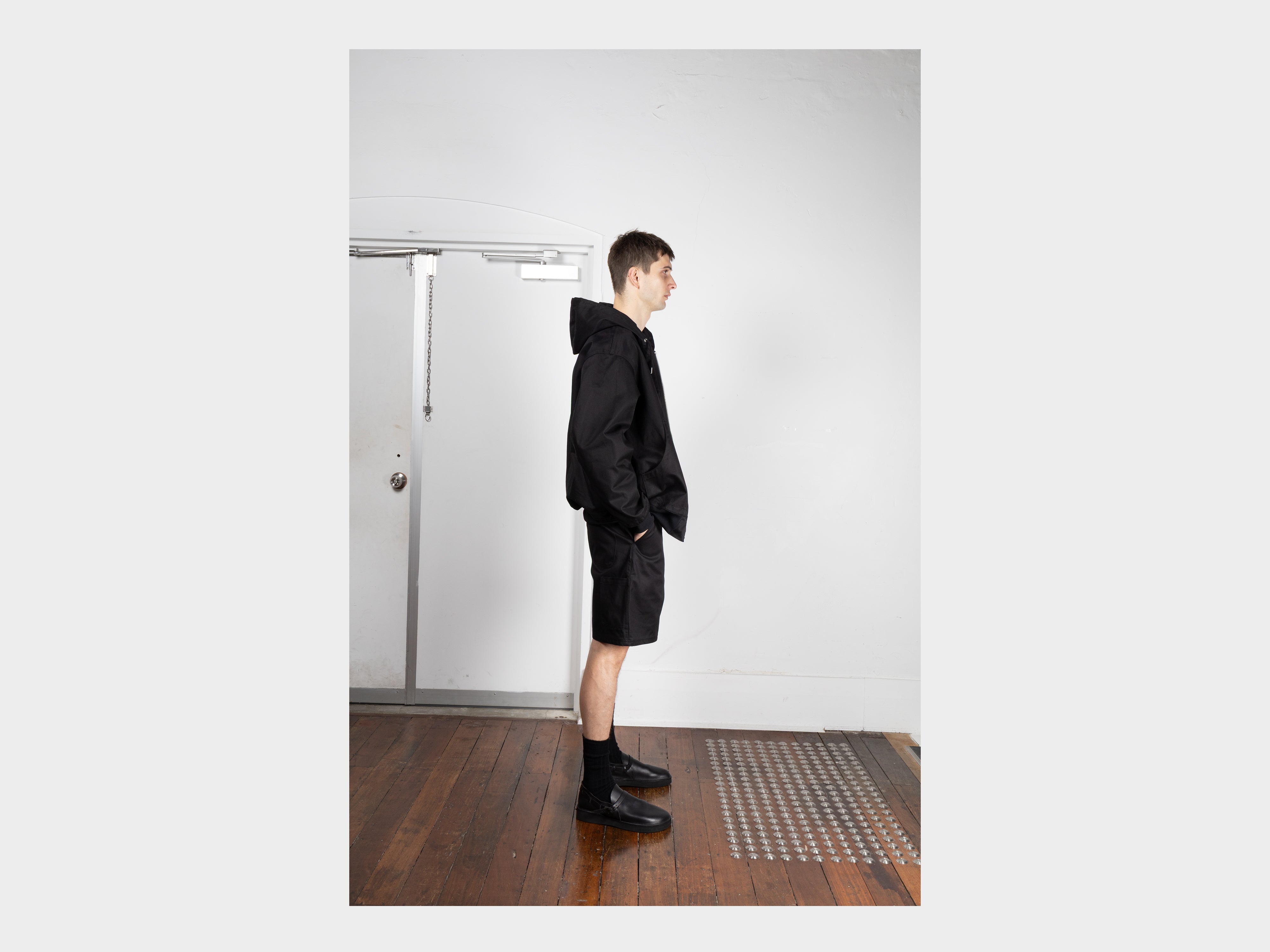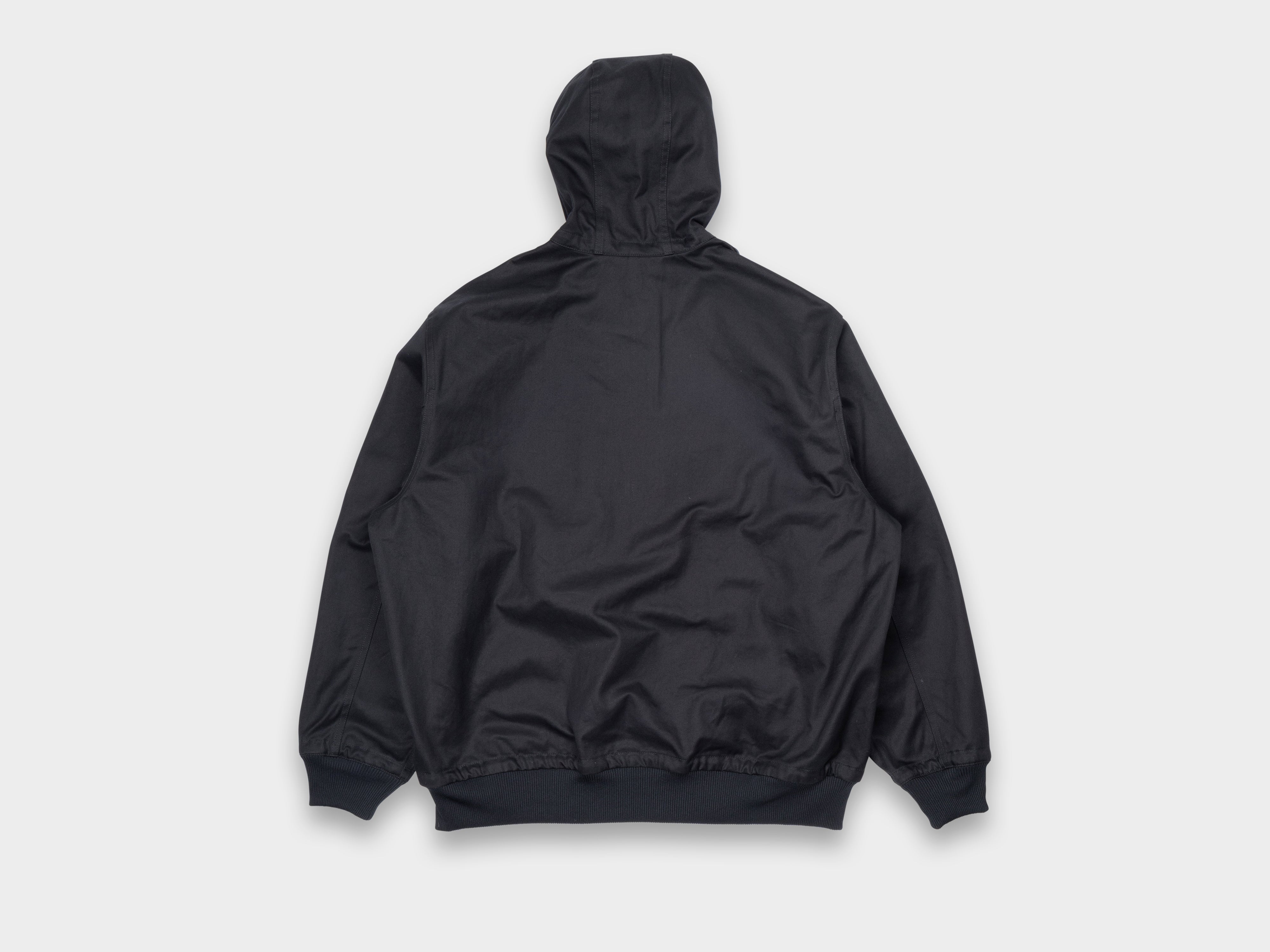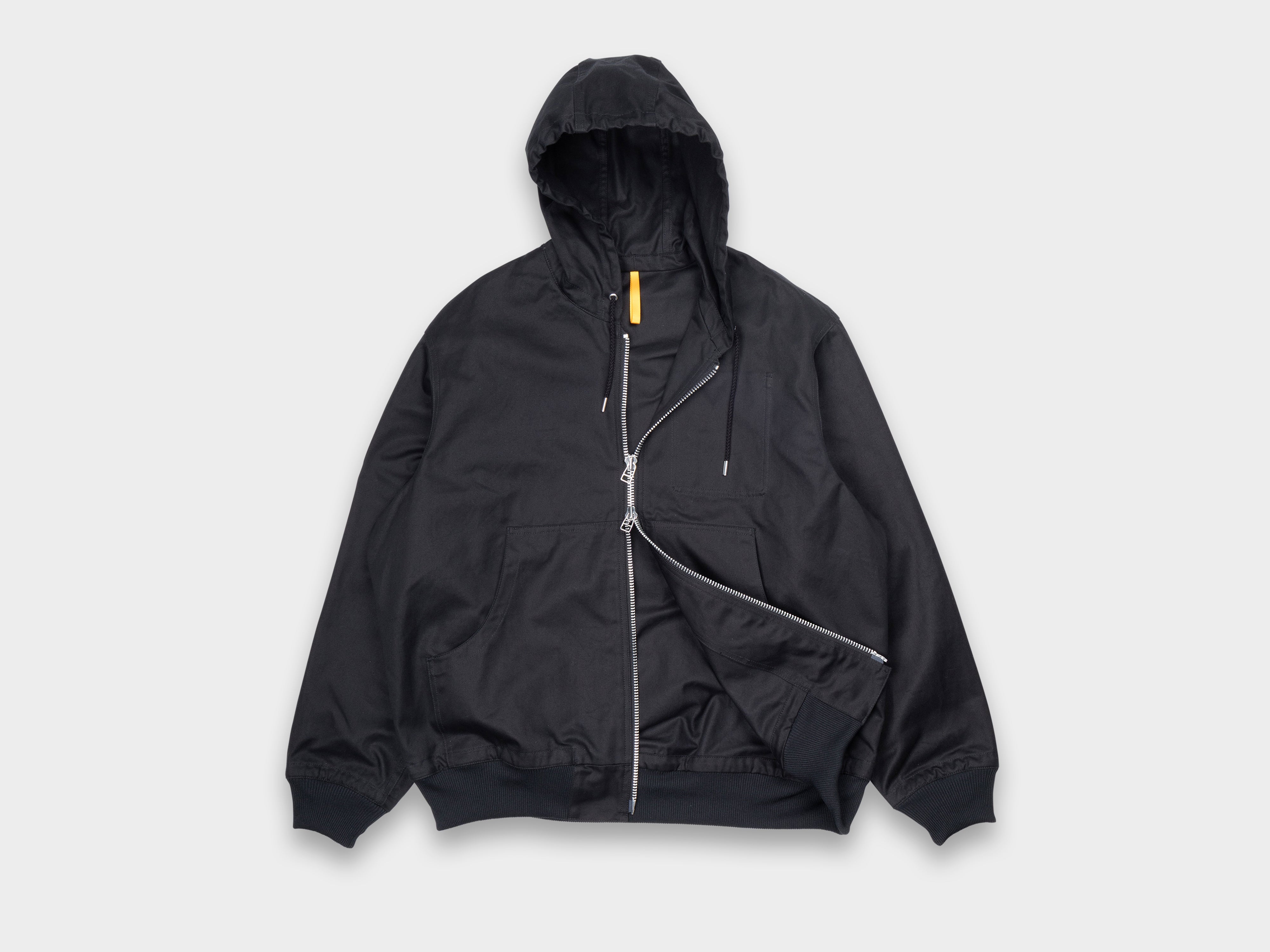 Oversized zip-up shell with drawstring hood. Wide-cut with generous room through the sleeves, large double-ended zipper, internal left chest pocket, dual hand pockets, ribbed cuffs and hem. Topstitched front facings, double-stitched welted seams. Made in Japan.