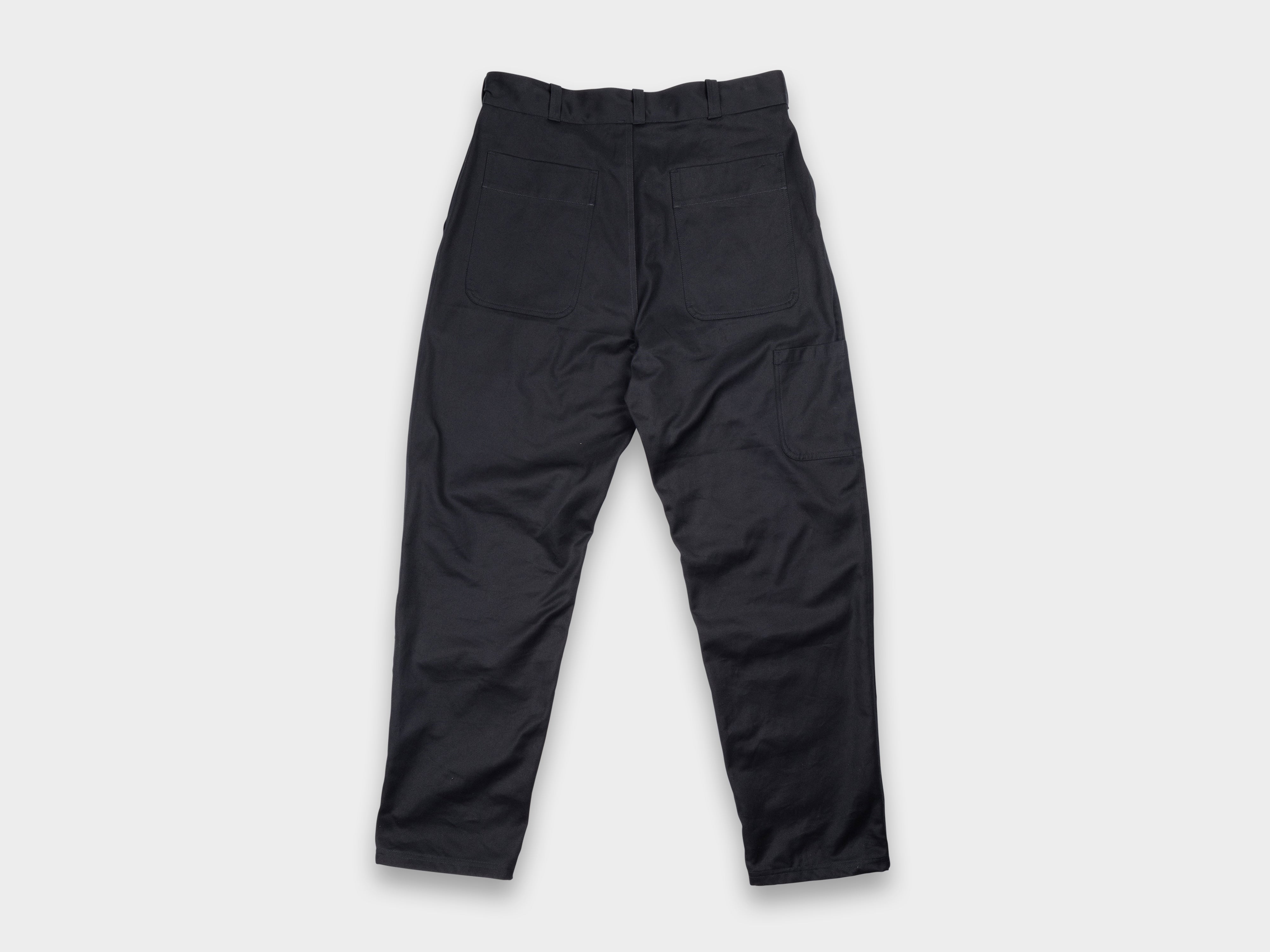 Jebok work trouser with a slimmer fit through the leg. Suitable for industry. Room in the crotch and thigh for ease of movement, slightly tapered leg, deep side-seam pockets, large back patch pockets, single utility patch pocket at thigh. Double-stitched welted seams. Made in Japan.