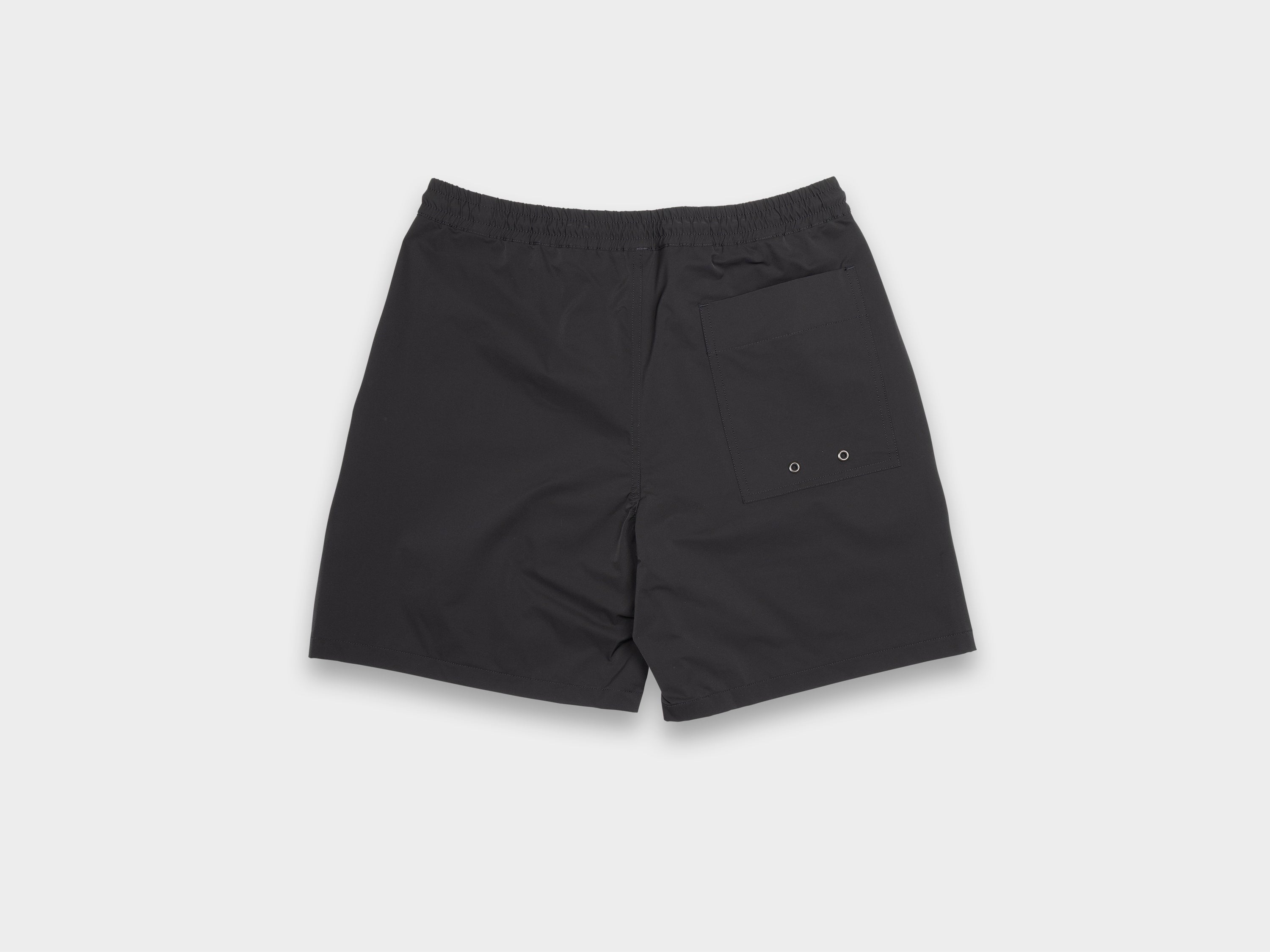 Relaxed swim short. Front and back patch pockets with coated, tonal eyelets for drainage. Waistband is both elasticated and contains a drawstring. Made in Japan.