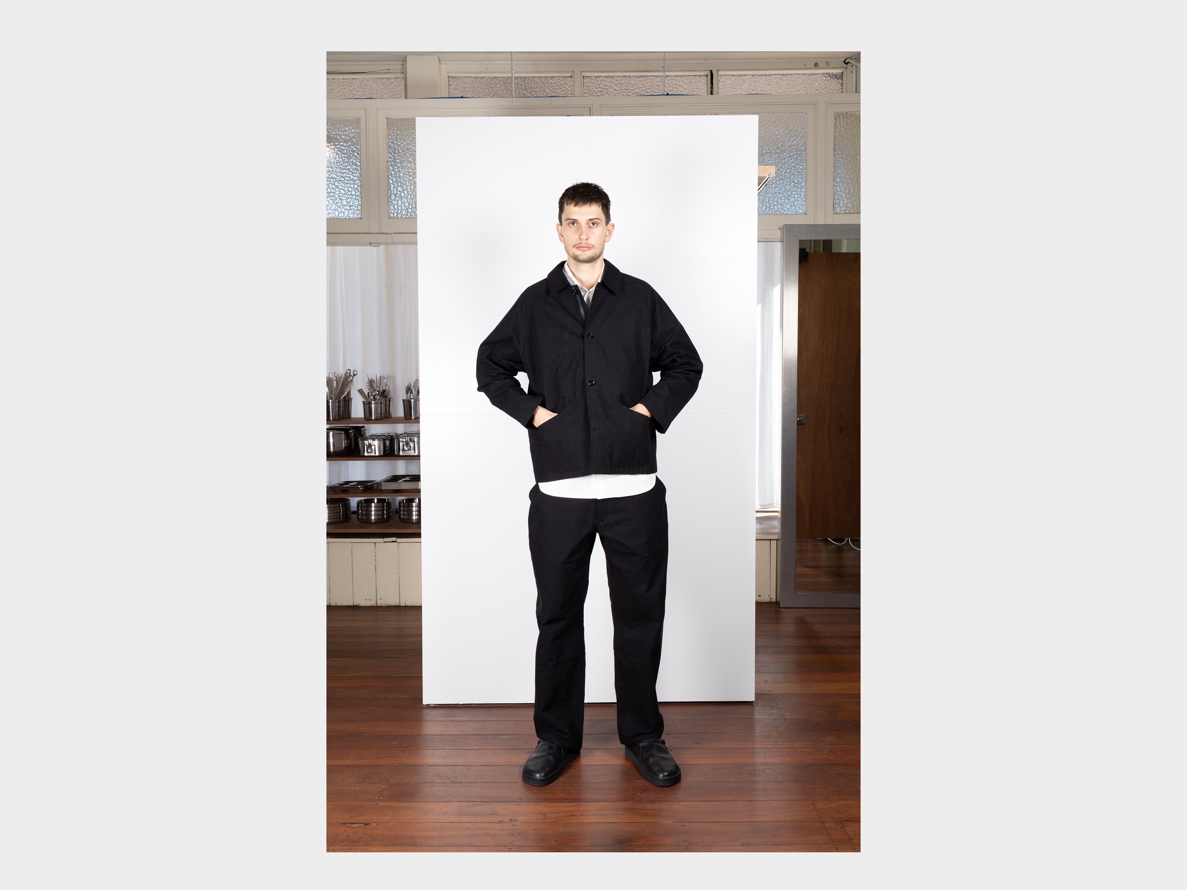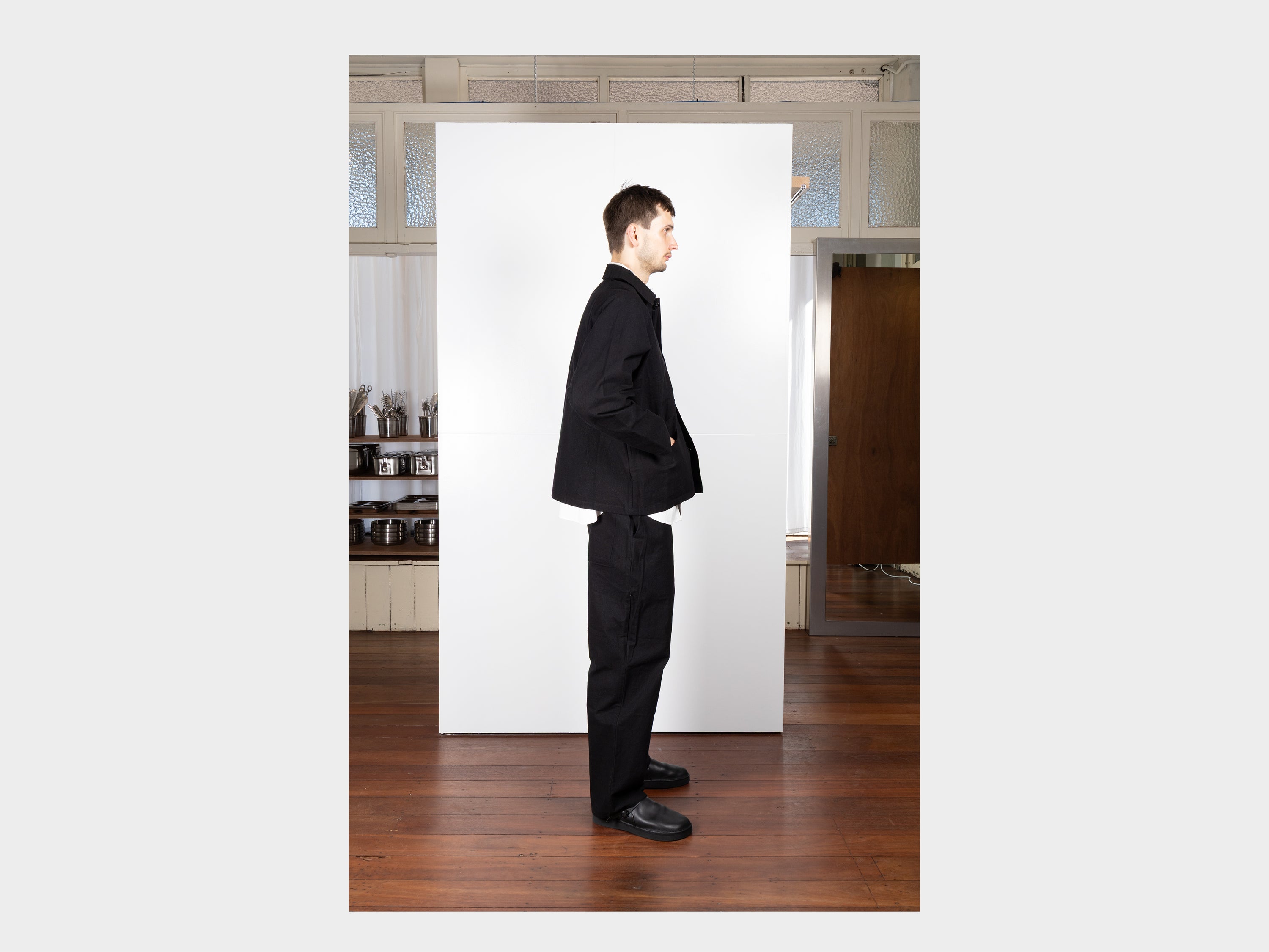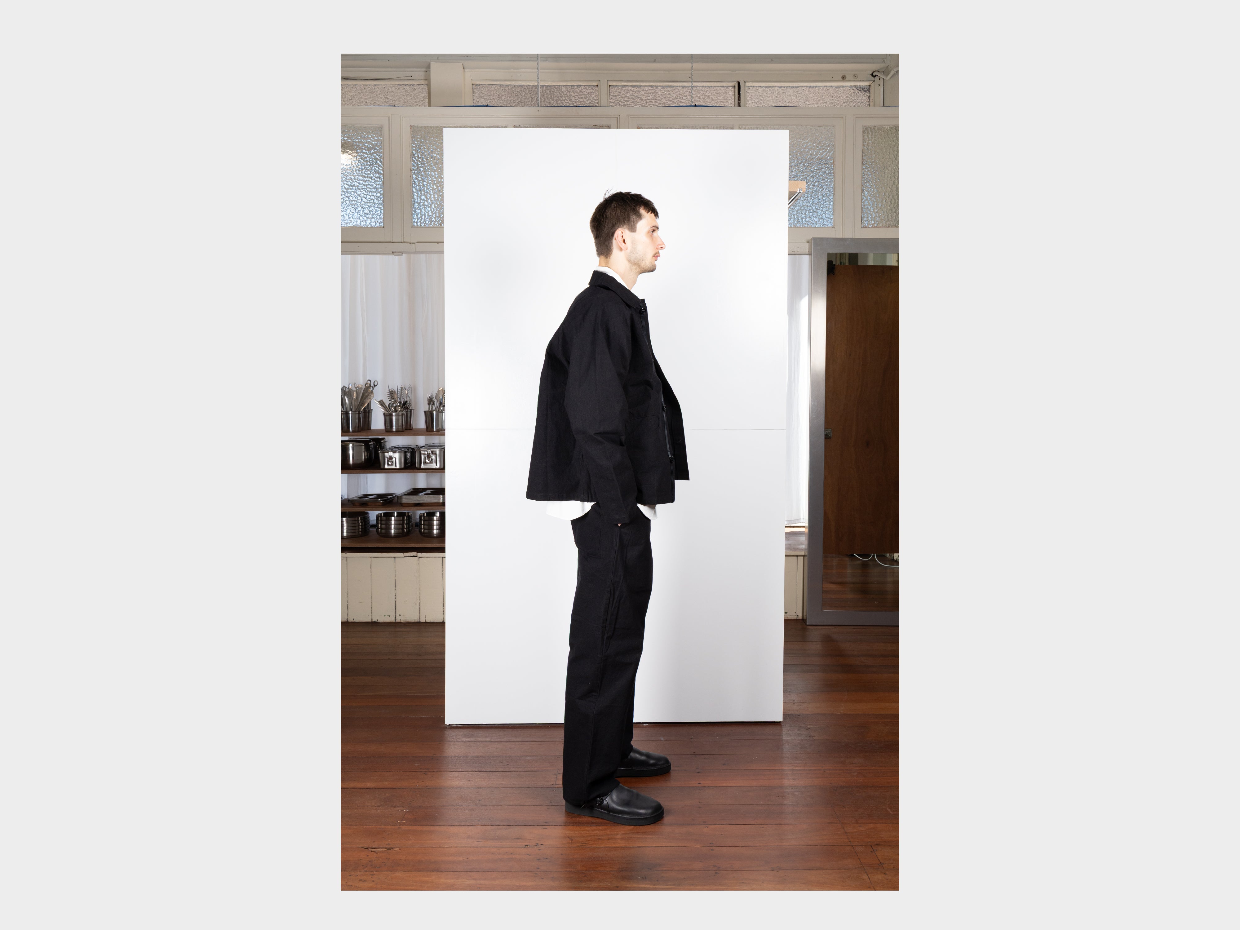 100% cotton with a paraffin wax coating. Yarn spun and dyed in Japan using cotton grown in Australia and the USA. Woven in Shizouka, then coated and baked in paraffin wax in Fukui. This original MAN–TLE cloth, MT-Wax, is designed to reveal new sound, colour, and texture over time. At first heavyweight and naturally stiff, it softens, fades, and changes form with washing and wear, becoming personal to the body it covers. Woven for MAN–TLE in Shizuoka, Japan.