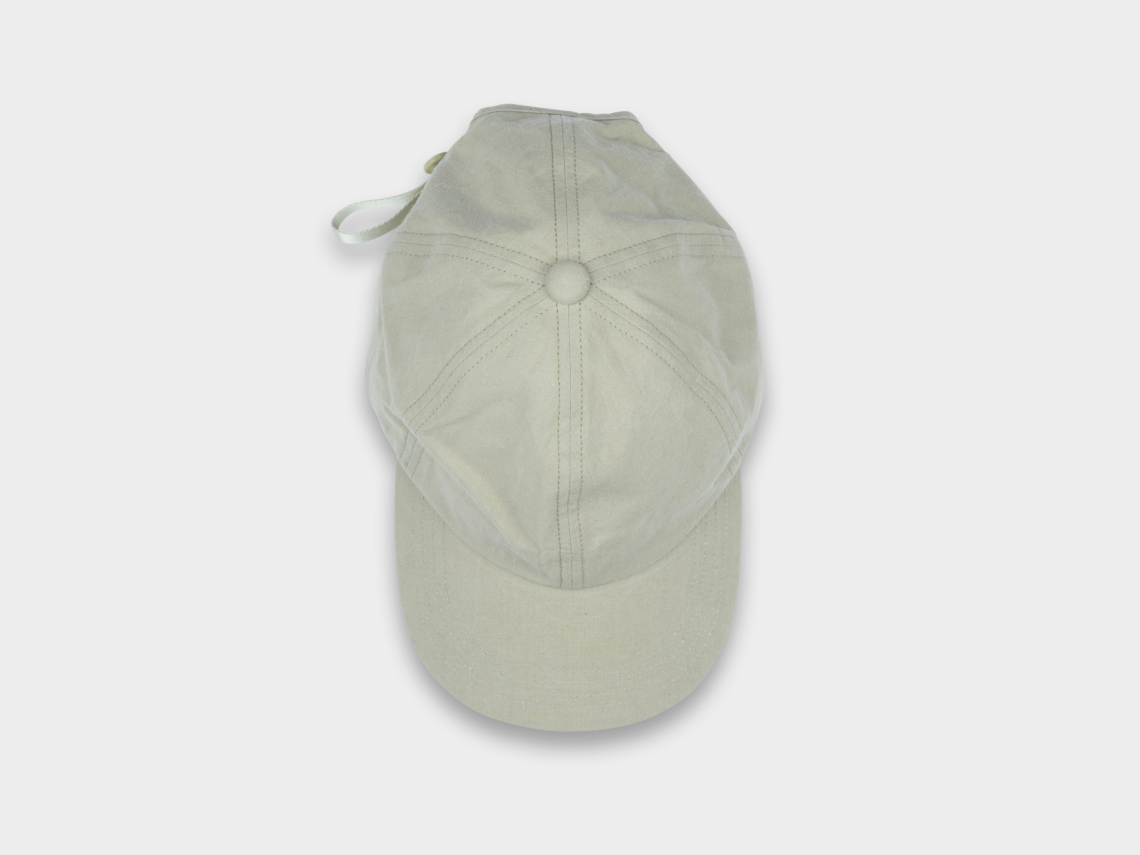 +Shallow-cut six panel cap. Slot button threaded onto seatbelt tape, used to adjust size. Made in Japan.