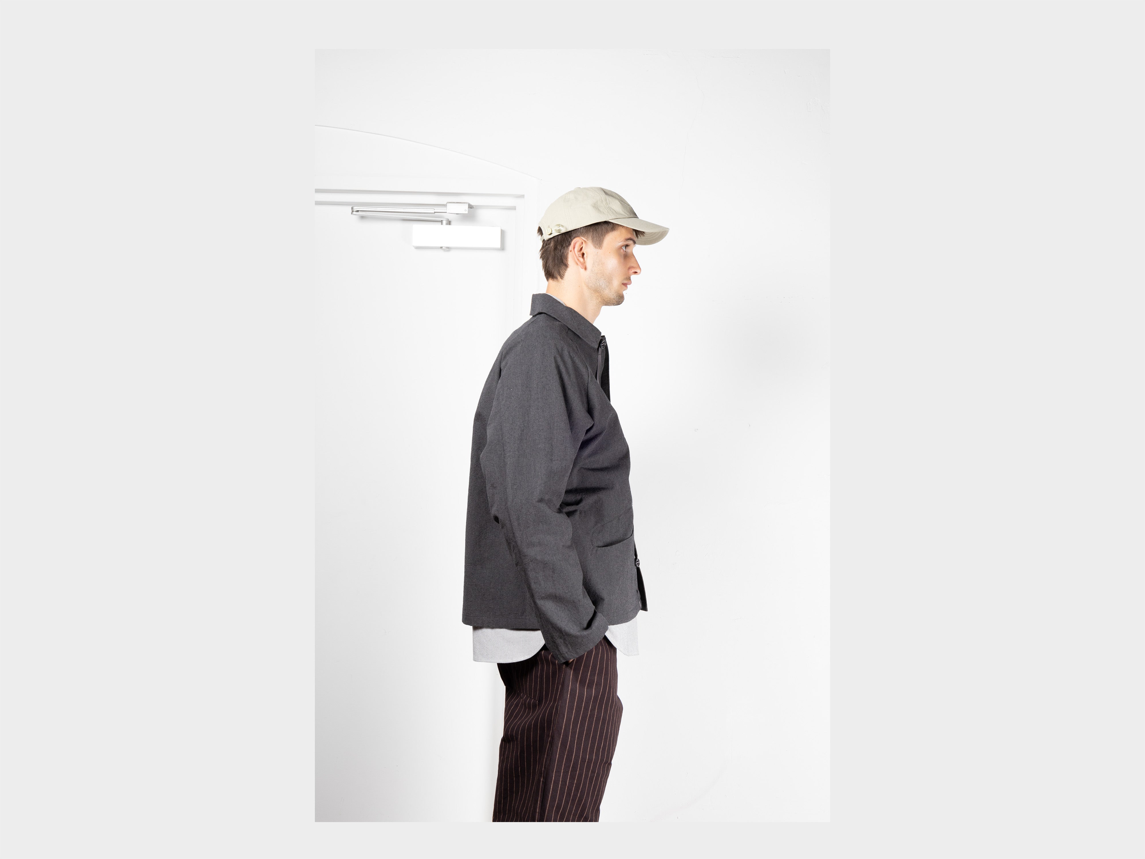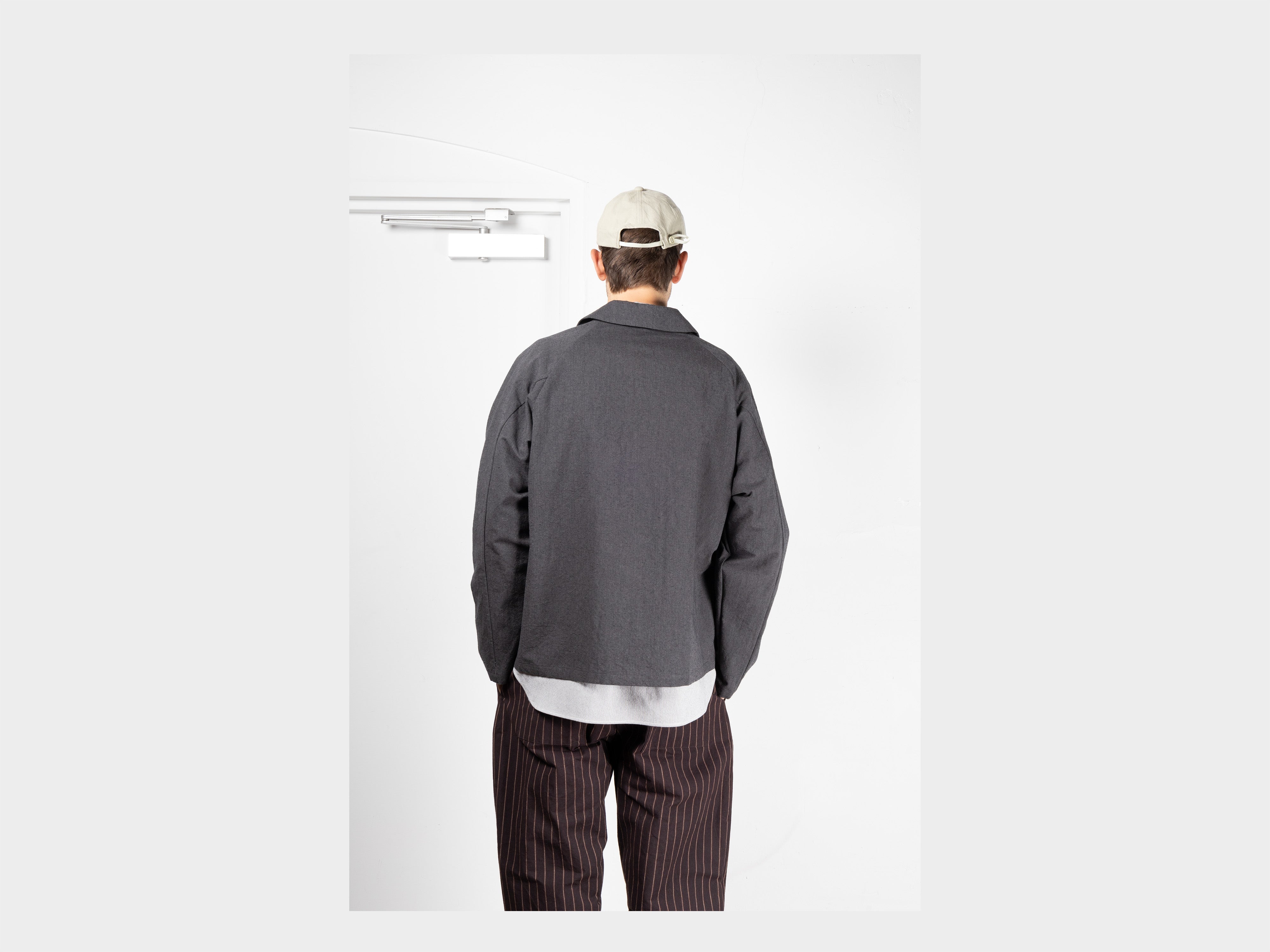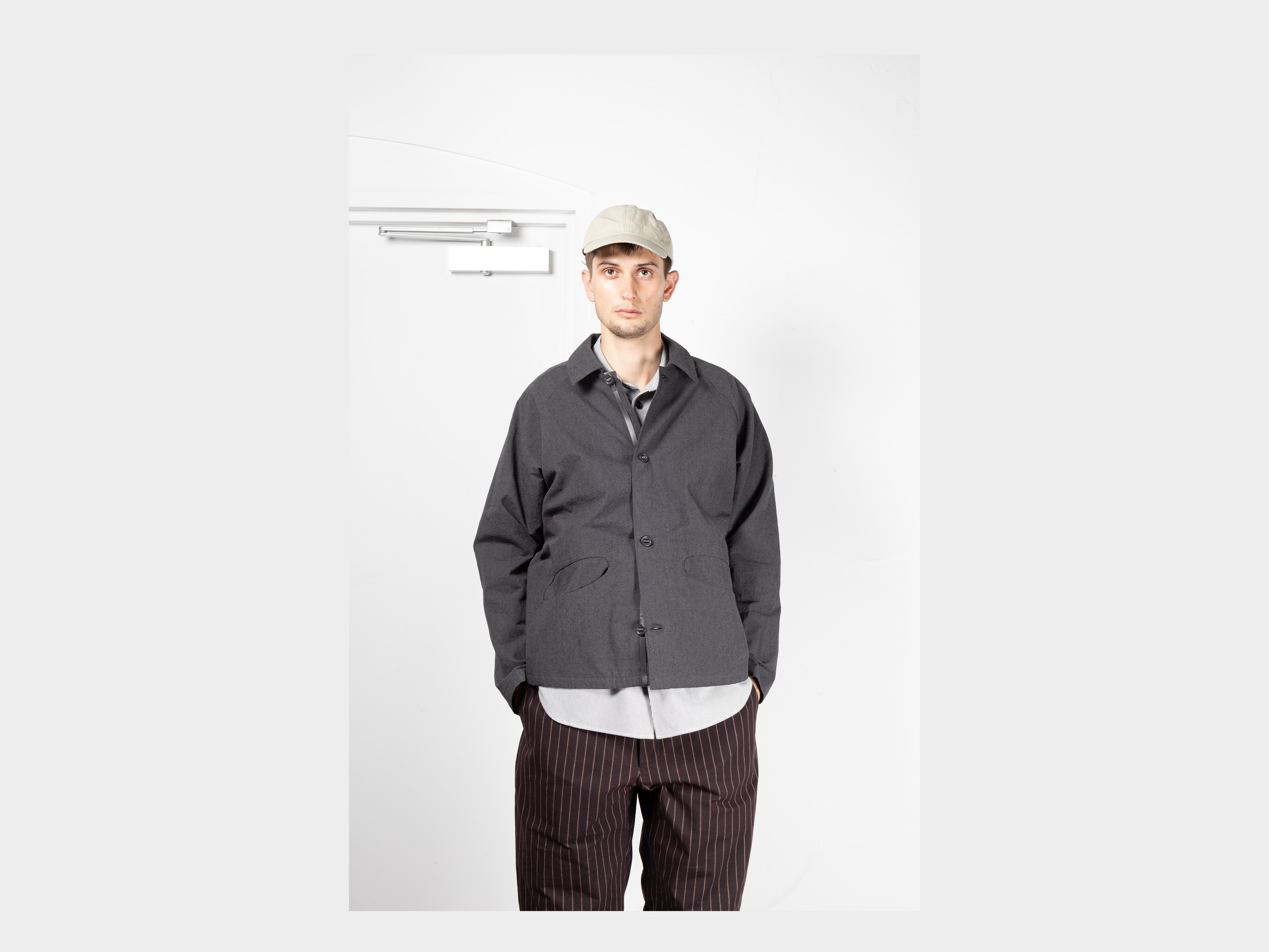 +100% cotton with a paraffin wax coating. Yarn spun and dyed in Japan using cotton grown in Australia and the USA. Woven in Shizouka, then coated and baked in paraffin wax in Fukui. This original MAN–TLE cloth, MT-Wax, is designed to reveal new sound, colour, and texture over time. At first heavyweight and naturally stiff, it softens, fades, and changes form with washing and wear, becoming personal to the body it covers. Woven for MAN–TLE in Shizuoka, Japan.