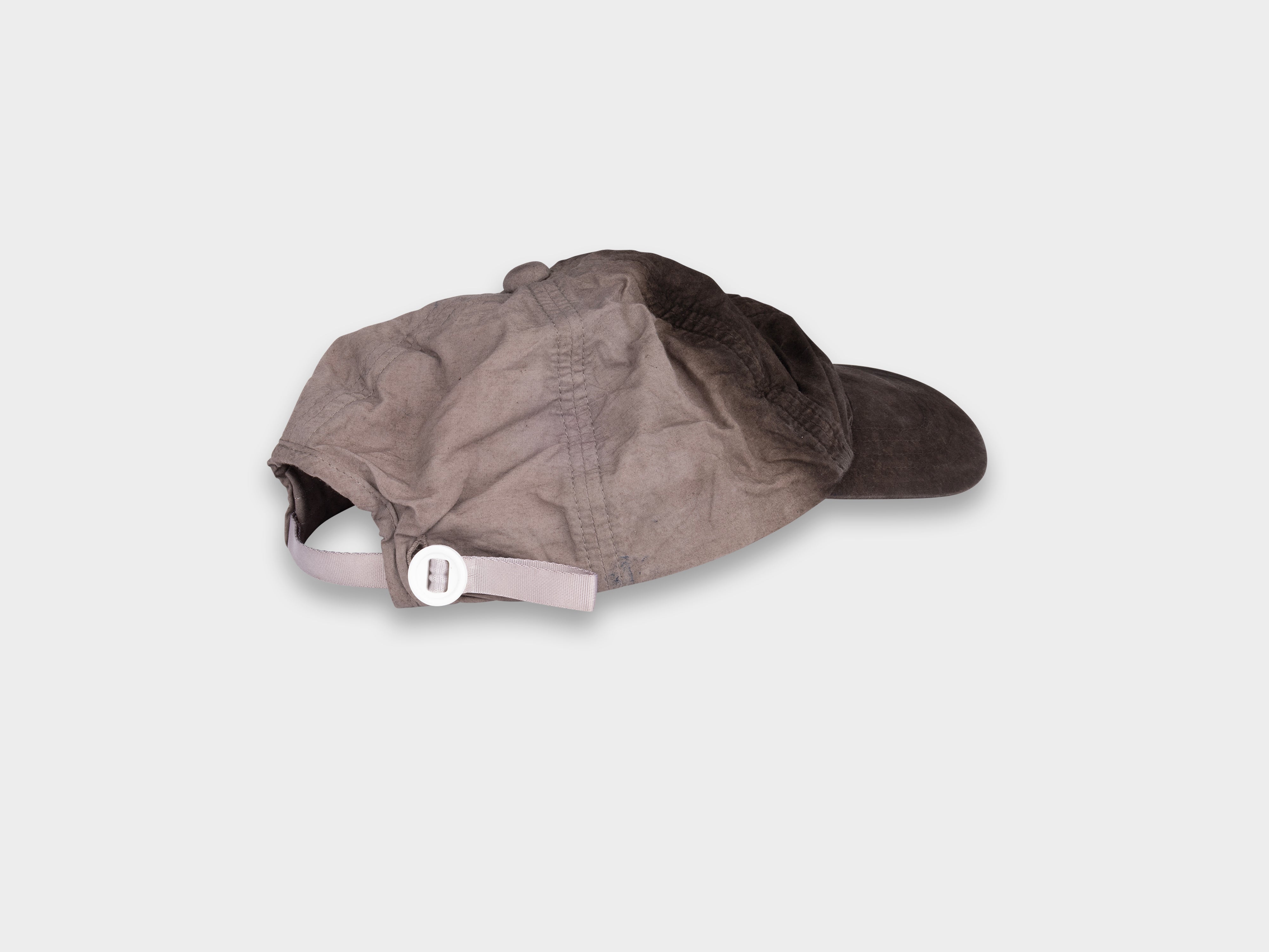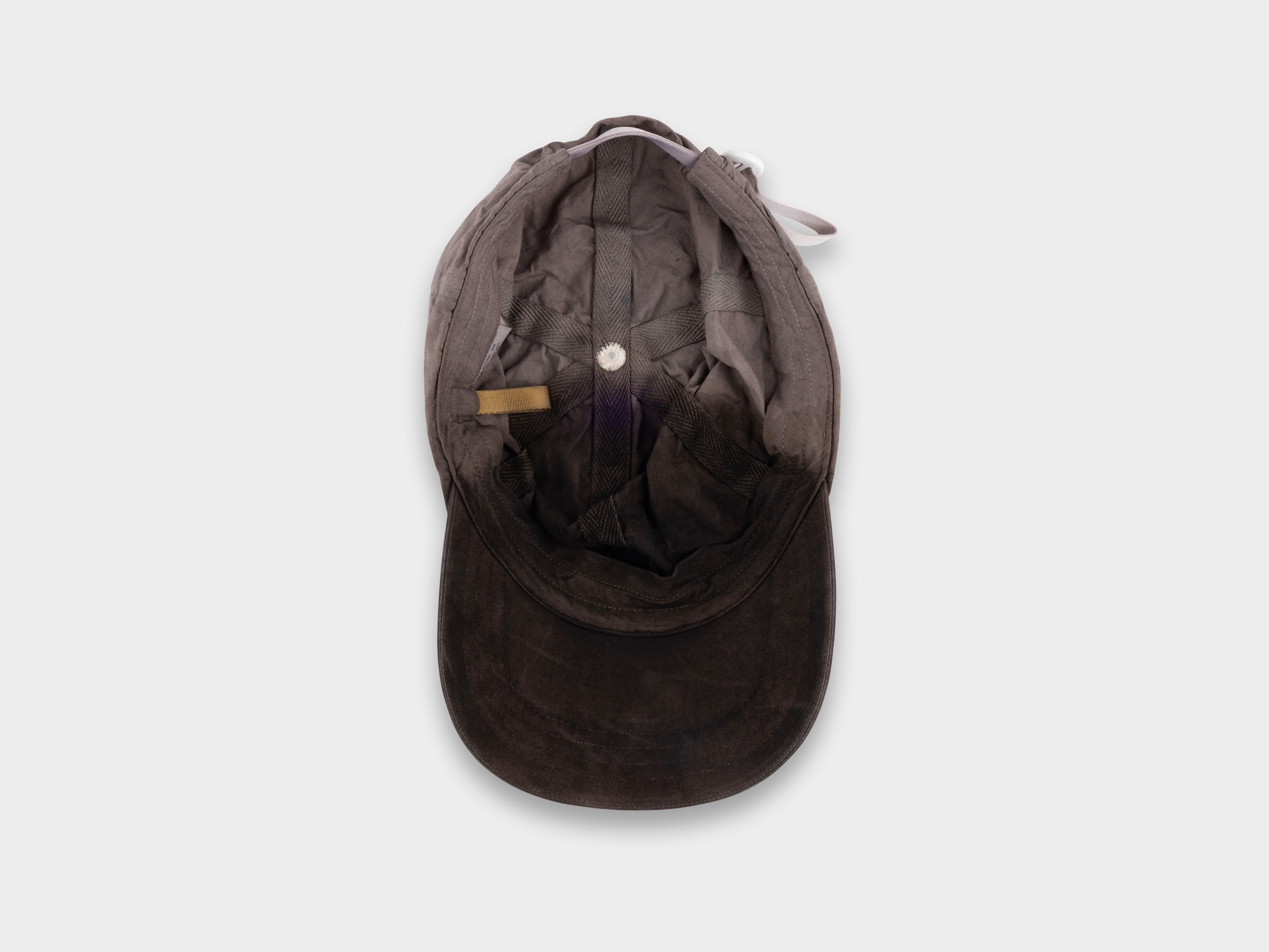 +Deep-cut six panel cap. Slot button threaded onto seatbelt tape, used to adjust size. Dyeing commissioned to iconic mud works Kanai Kougei, based in Amami-Ōshima. Master craftsman Yukihito Kanai preserves the ancient Dorozome techniques of the island, while expressing his fascination with gradation and exploring new combinations of colour using materials within reach. Exclusive item produced for retailer; Pan’s Dance in Seoul, South Korea. Made in Japan.