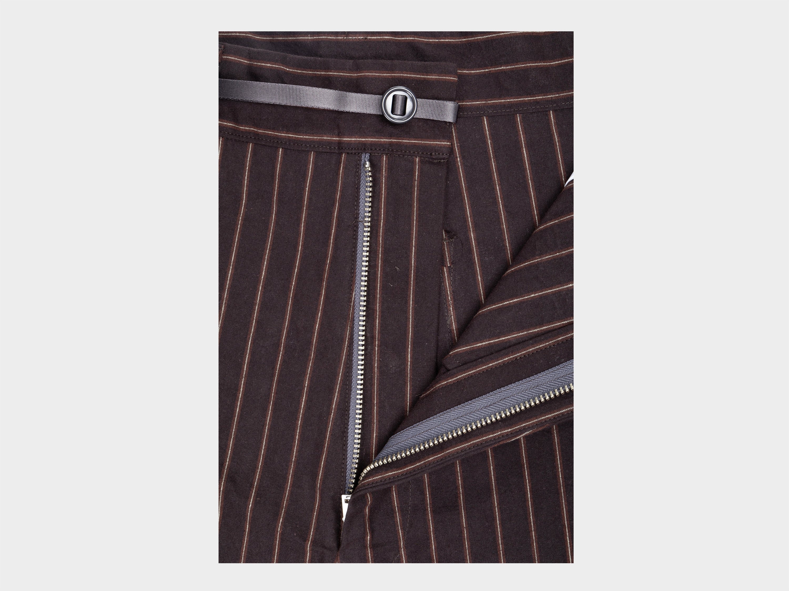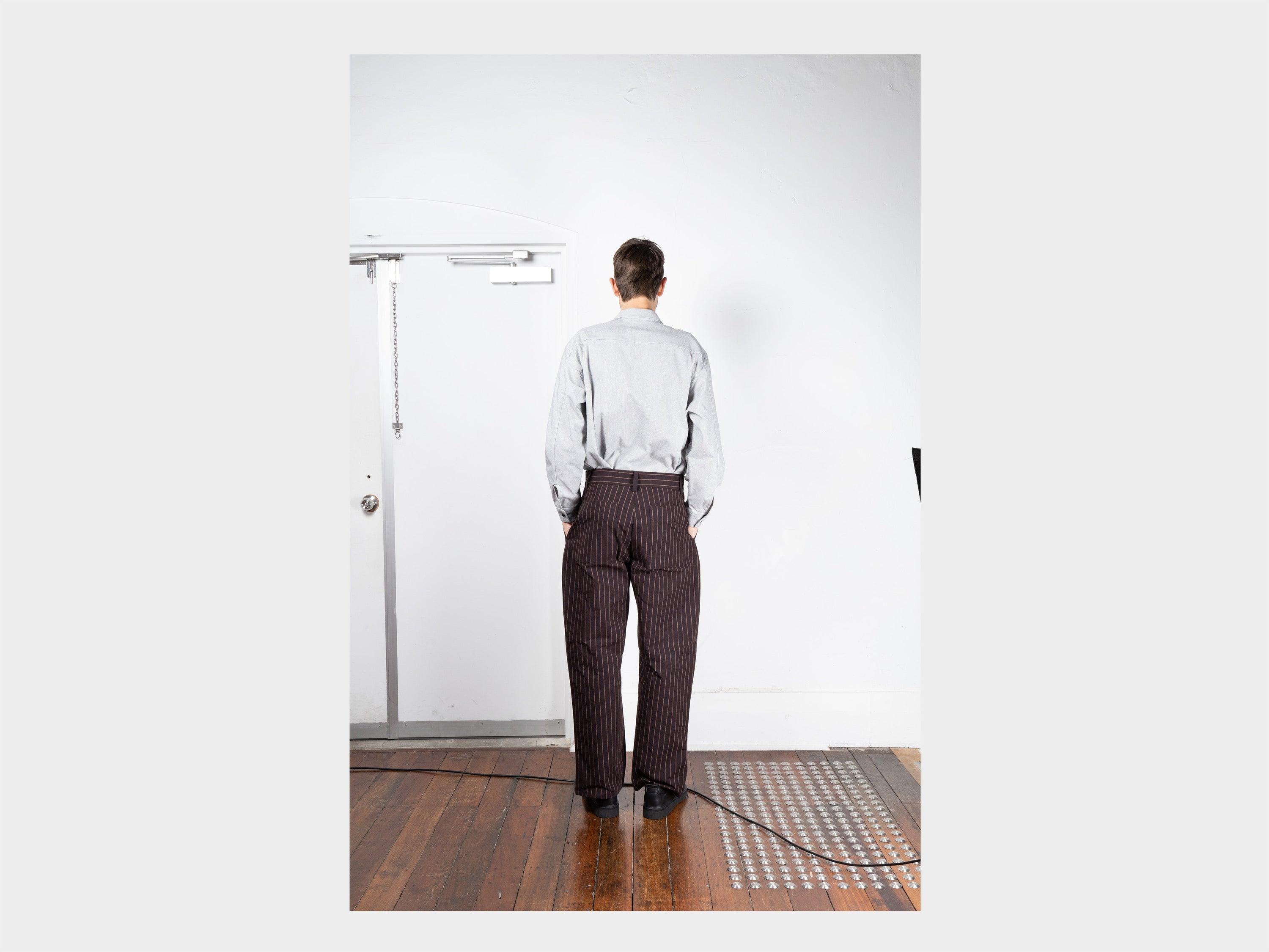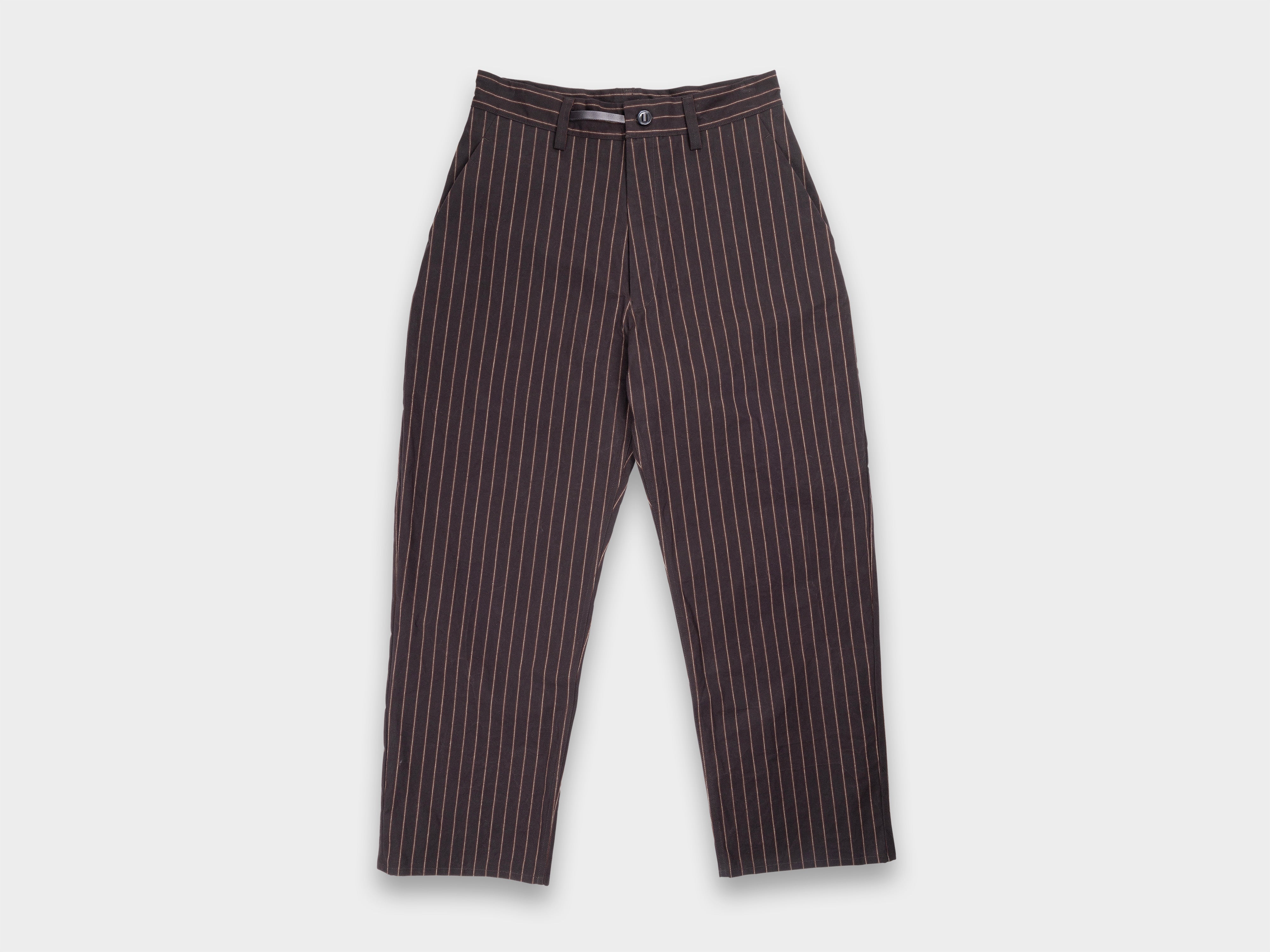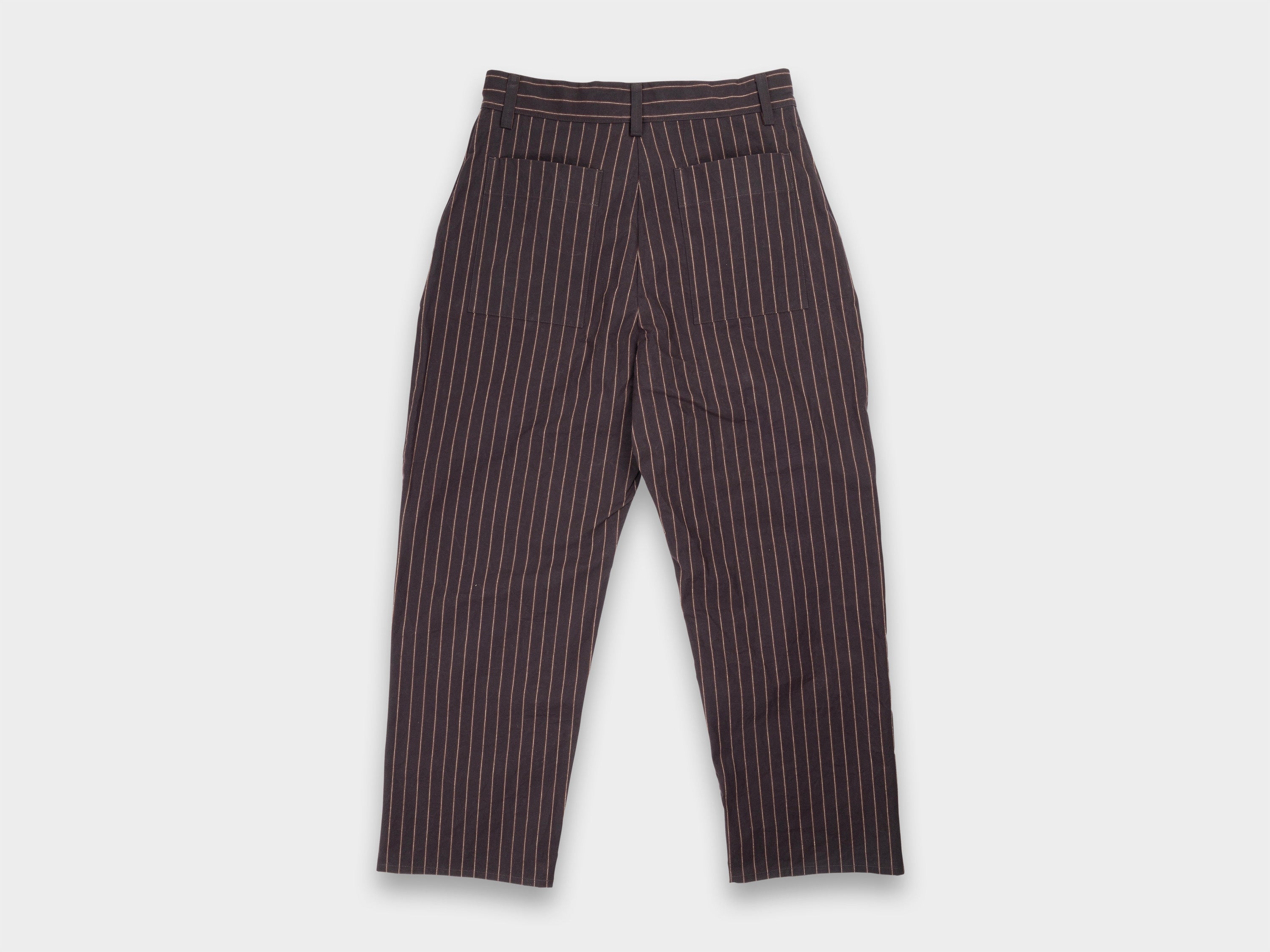 Relaxed wide-leg pants. Long rise and generous room in the hips. Seat belt tape with adjustable button at the front, side-seam pockets and back patch pockets. Made in Japan.