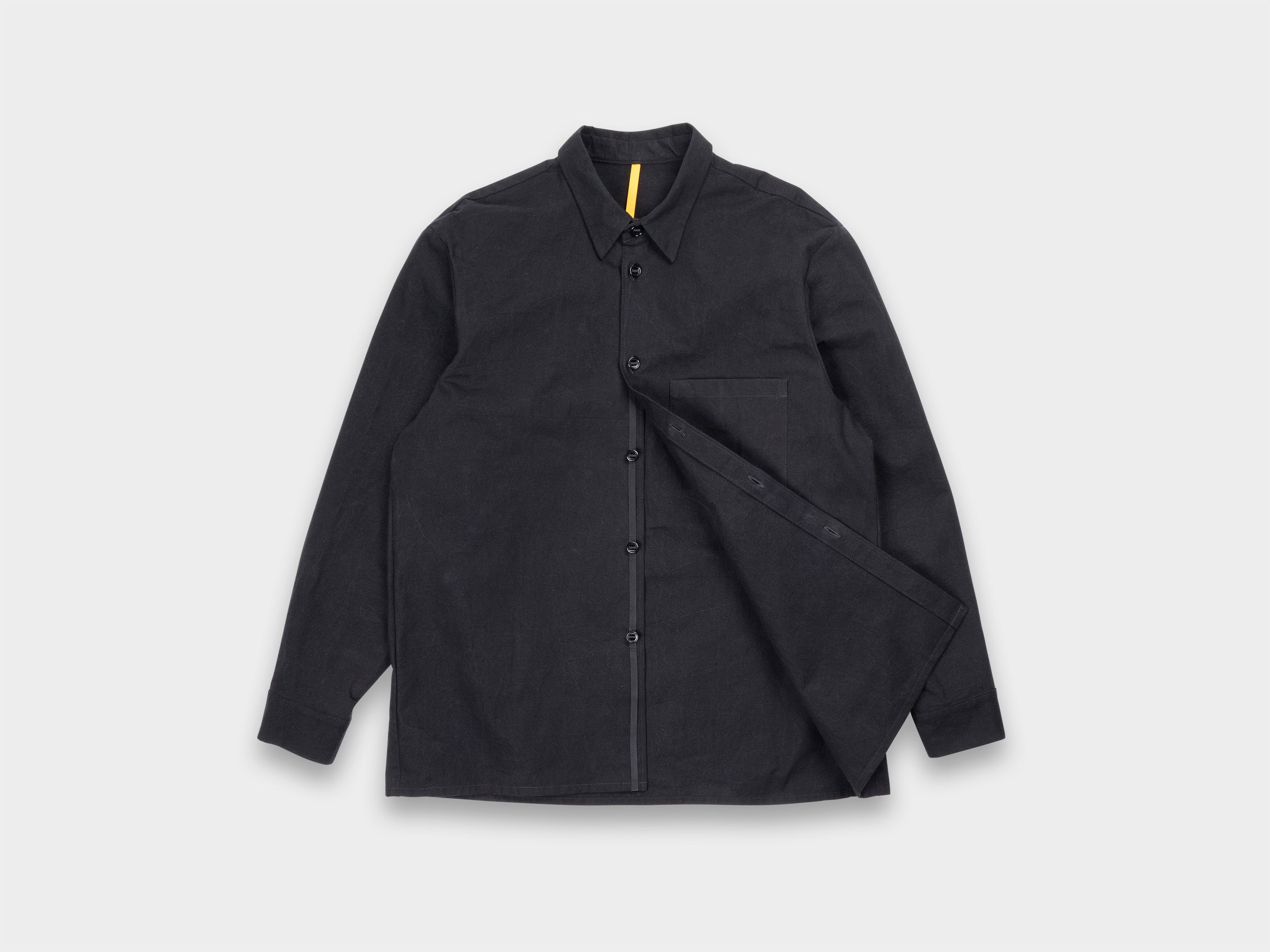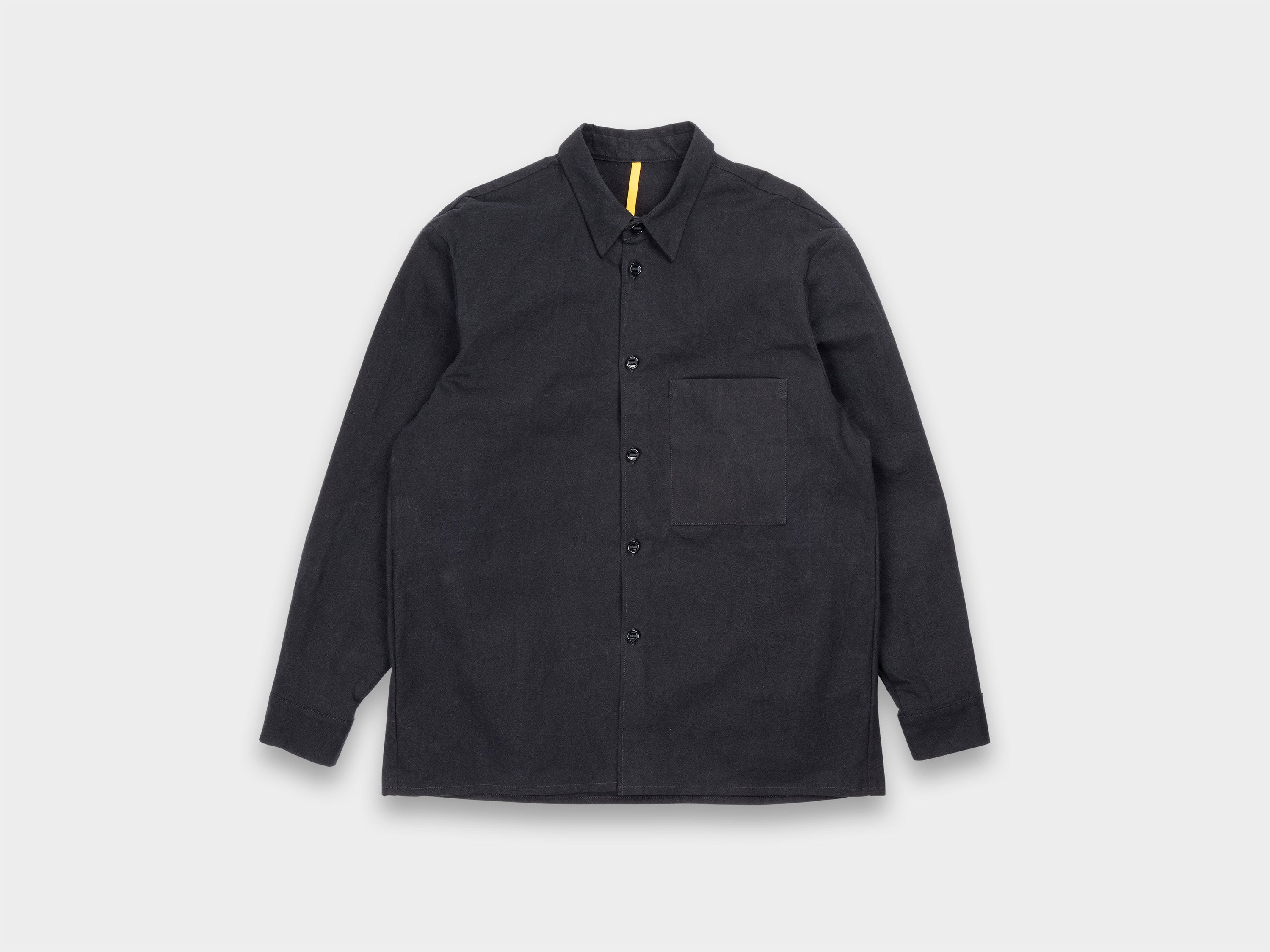 +Redesigned Shirt-1, our first shirt that had remained unchanged since Range-1, now updated with a looser fit, generous room through the armholes, a slightly higher collar, and a large patch pocket at the left chest. Relaxed sleeve with single button closure, slot buttons threaded onto seat belt tape, straight hem. Made in Japan.