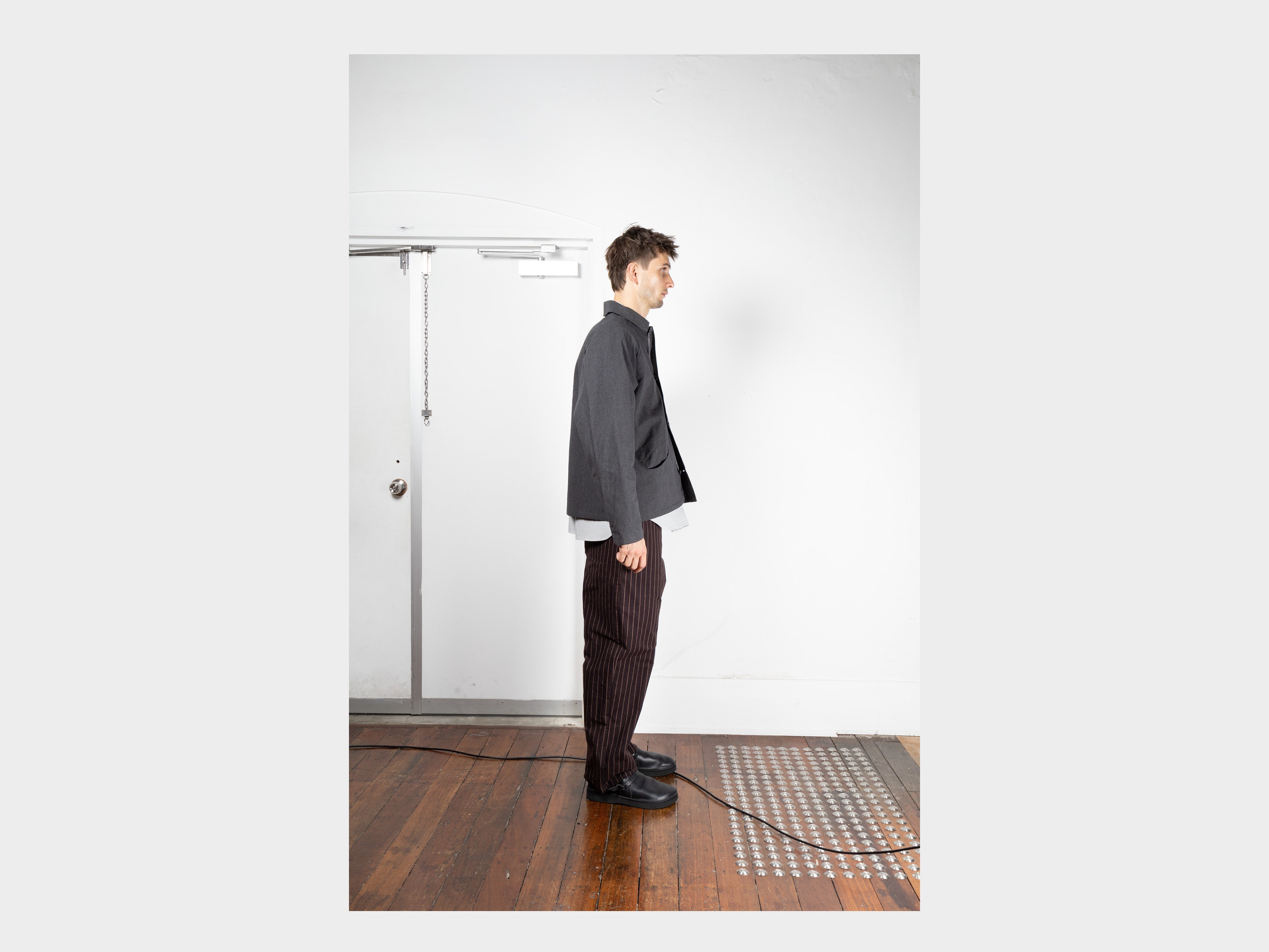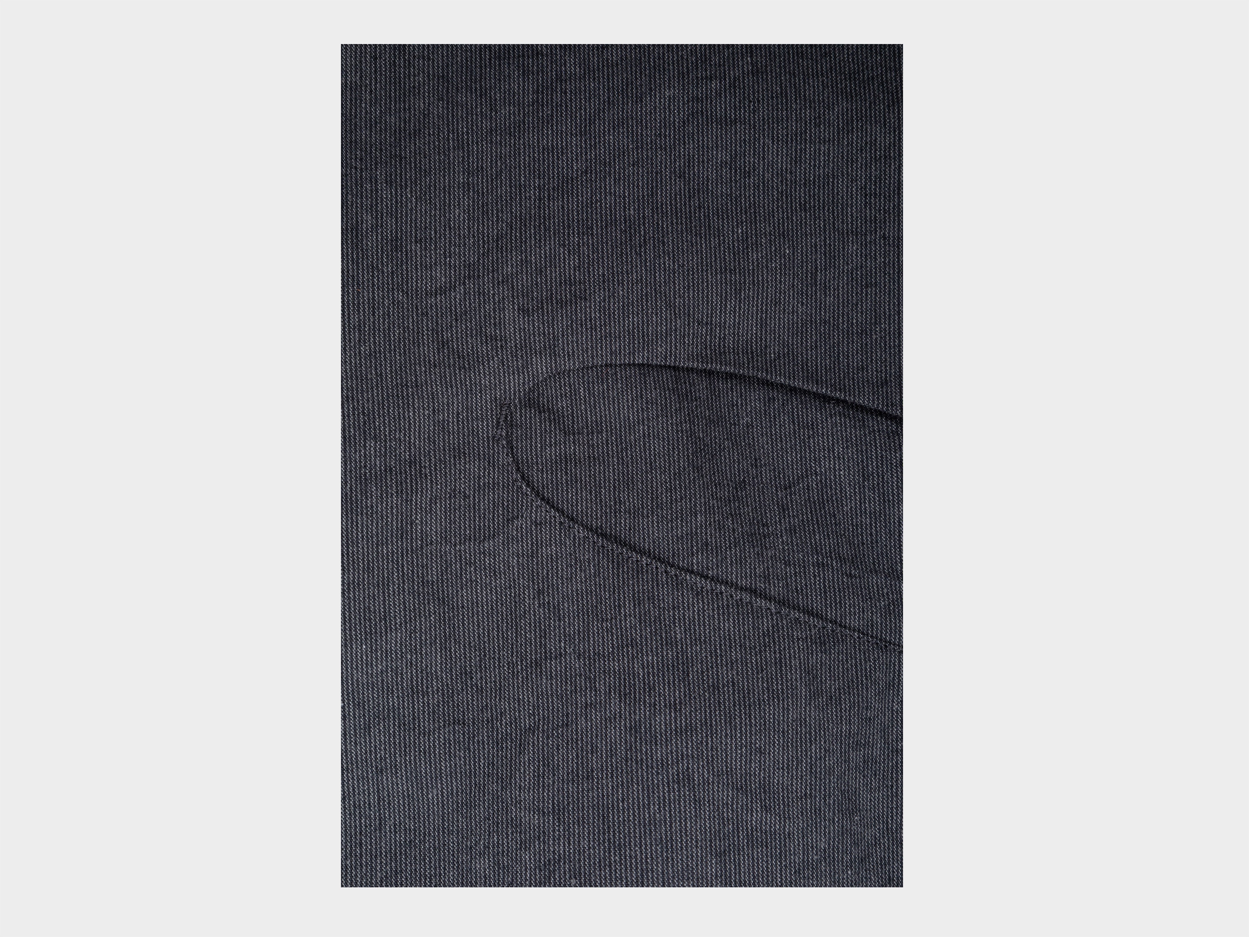 +55% cotton / 45% wool. Yarn dyed, high density plain weave with narrow vertical stripe. Cotton yarn warp, and wool yarn weft that blends New Zealand wool and Australian Merino. Cloth has a natural, dry handle and is suitable for all seasons. Woven for MAN-TLE in Shizuoka, Japan.