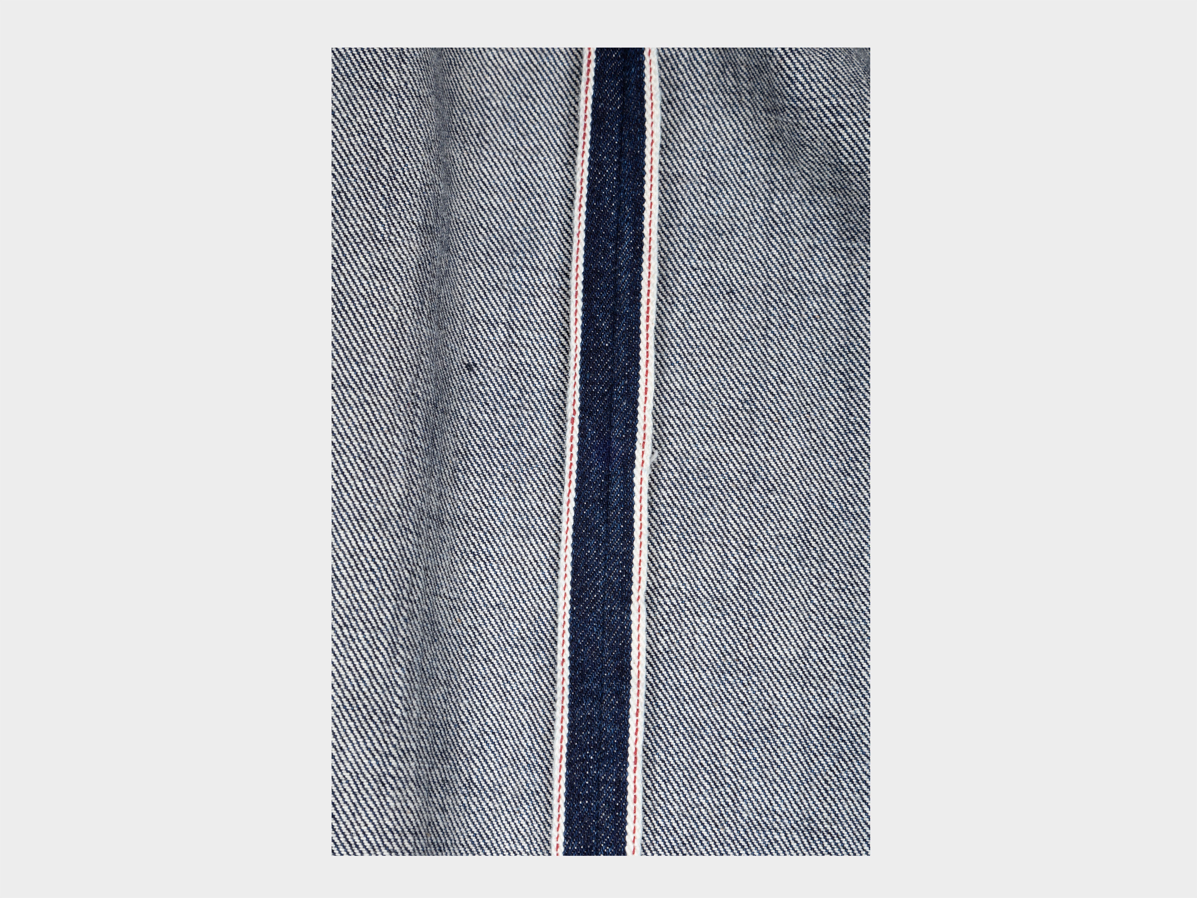 +100% organic cotton. Mid-heavyweight 13.5oz selvedge denim, woven from uneven ring-spun, rope-dyed yarn. Cotton grown in Turkey, indigo grown in India. Woven on a vintage Riki-Shokki shuttle loom, this cloth replicates the original method used to produce selvedge denim in Japan since the 1950s. Compared to modern looms, this slower process requires greater skill and care, producing a narrow-width cloth that is dense, durable, and preserves the natural character and subtle irregularities of the yarn. Designed to wear, this cloth will soften, reveal tonal variation, and become personal to the body it covers. Spinning through to finishing completed in Okayama, Japan.