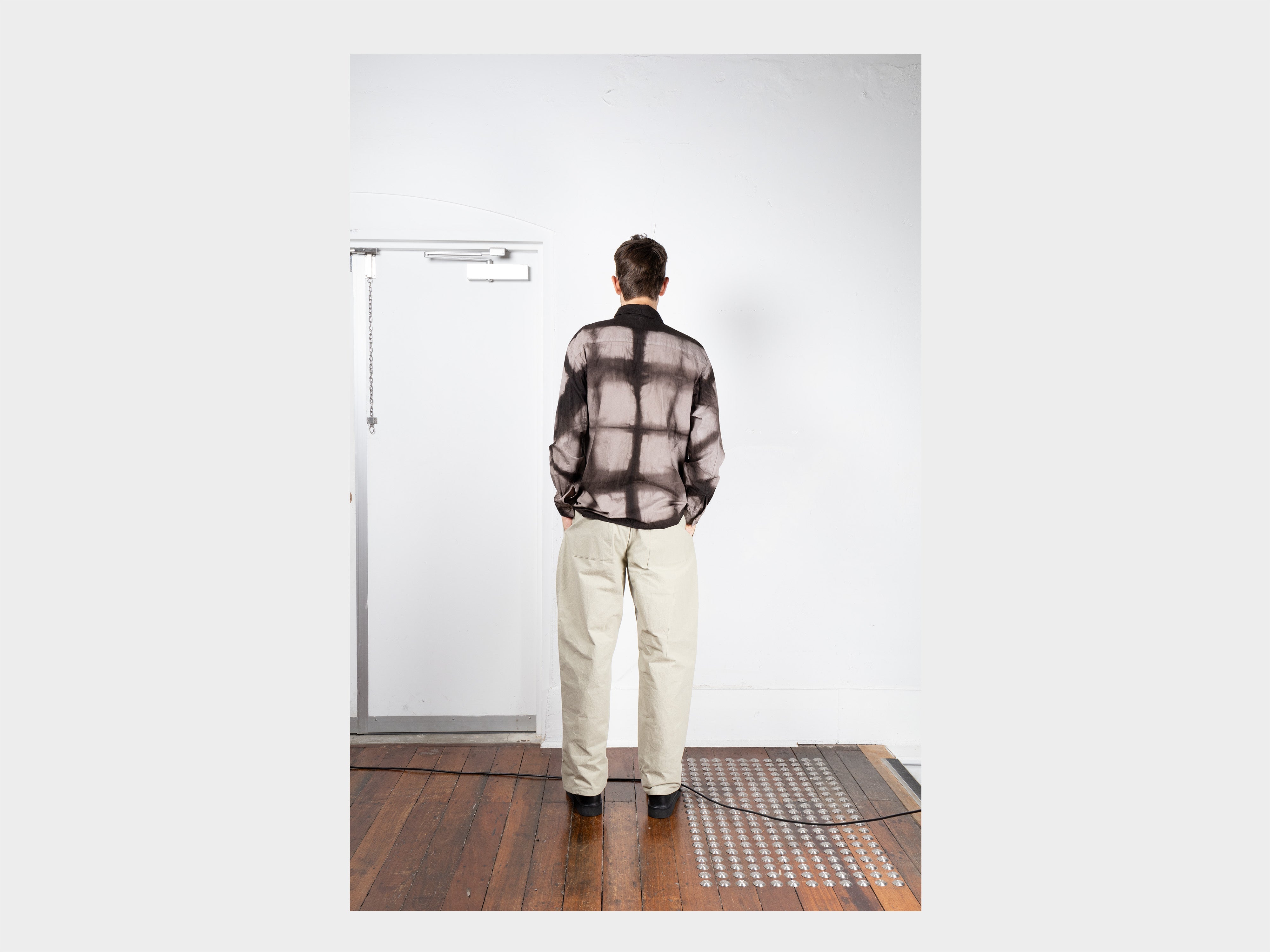+Relaxed, straight-cut shirt. Generous room through armholes, relaxed sleeves with single button closure, high stand collar, button front, large left-chest pocket. This shirt is designed to be naturally overdyed. Dyeing commissioned to iconic mud works Kanai Kougei, based in Amami-Ōshima. Master craftsman Yukihito Kanai preserves the ancient Dorozome techniques of the island, while expressing his fascination with gradation and exploring new combinations of colour using materials within reach. Made in Japan.