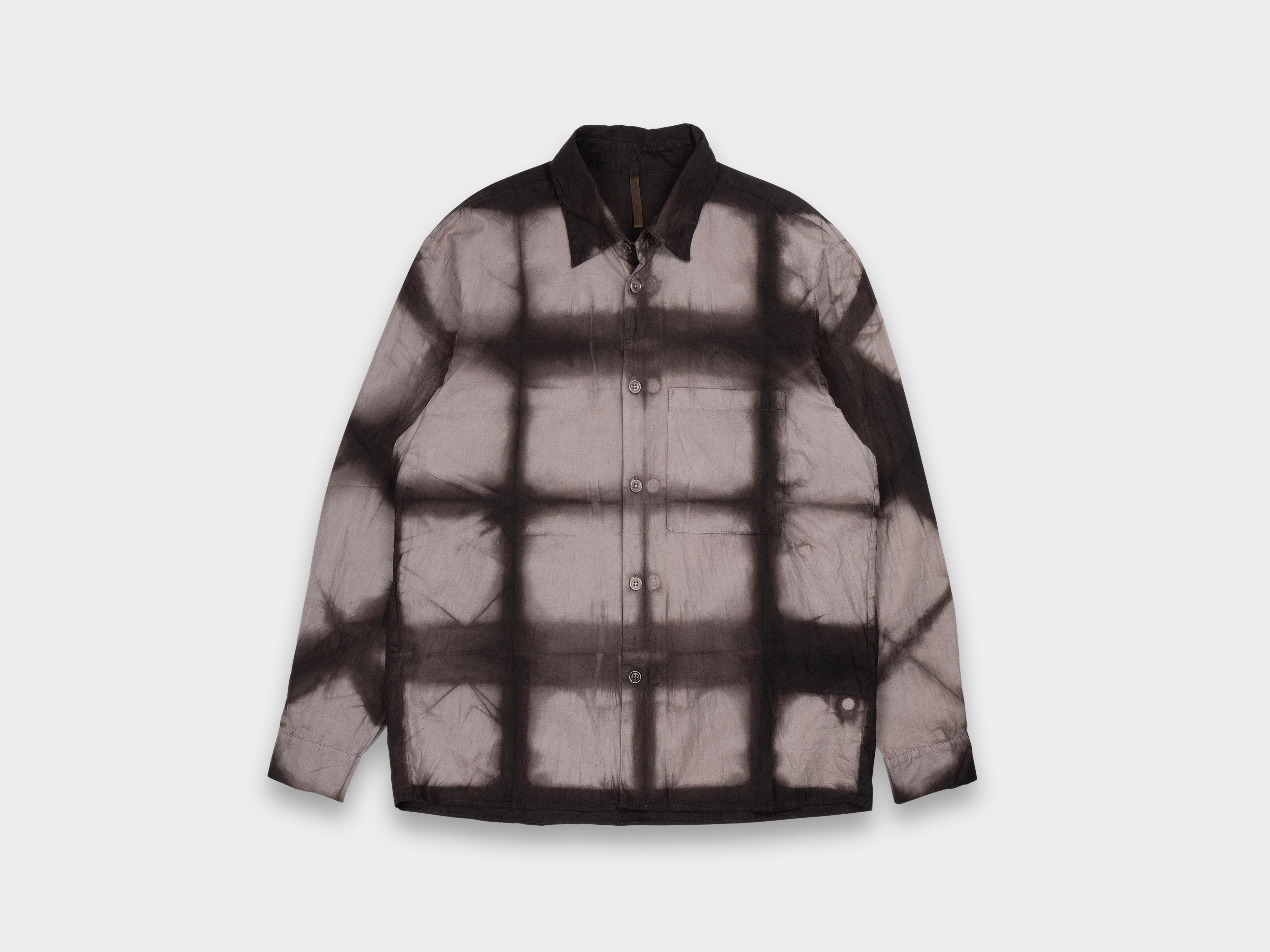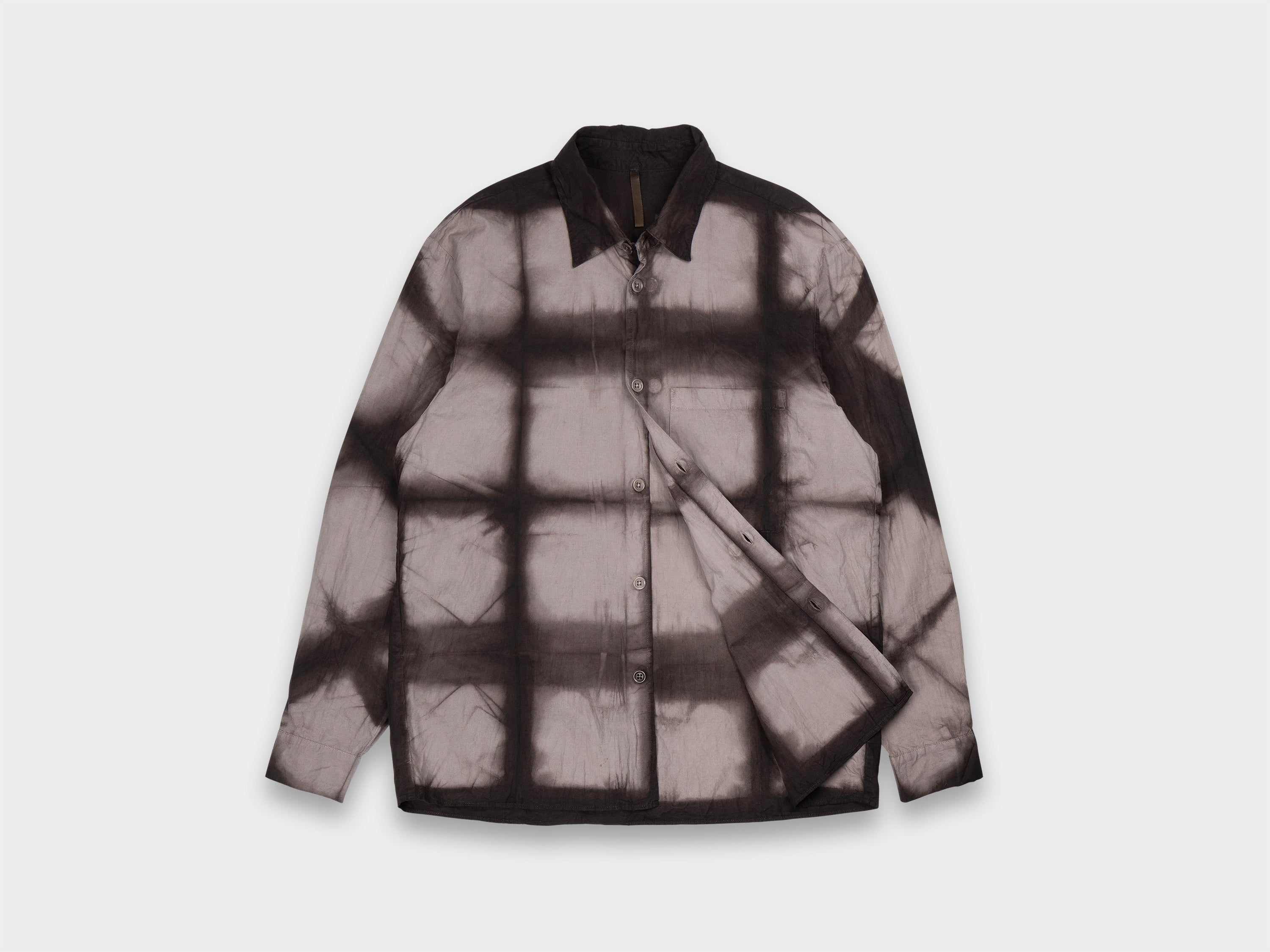 Relaxed, straight-cut shirt. Generous room through armholes, relaxed sleeves with single button closure, high stand collar, button front, large left-chest pocket. This shirt is designed to be naturally overdyed. Dyeing commissioned to iconic mud works Kanai Kougei, based in Amami-Ōshima. Master craftsman Yukihito Kanai preserves the ancient Dorozome techniques of the island, while expressing his fascination with gradation and exploring new combinations of colour using materials within reach. Made in Japan.