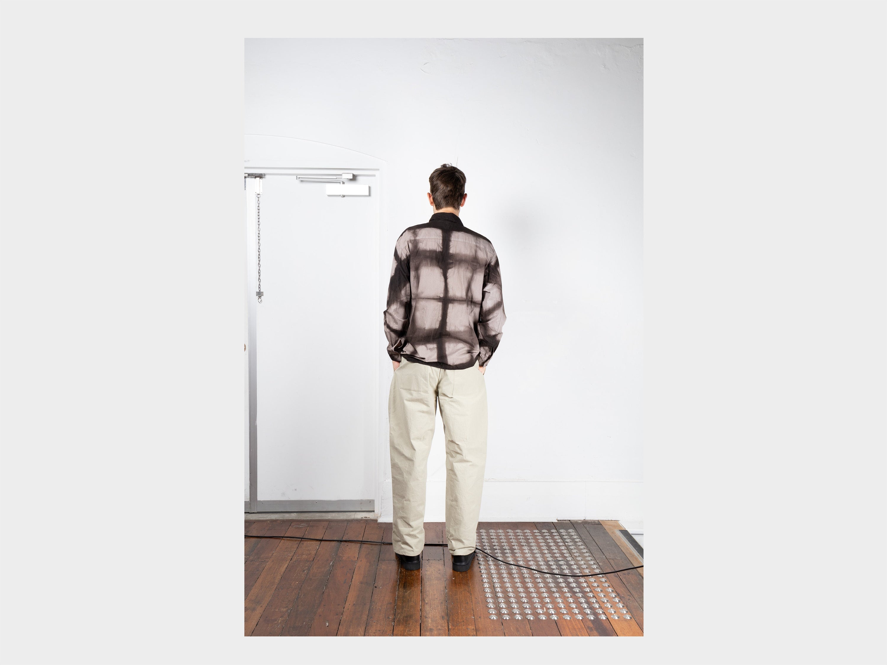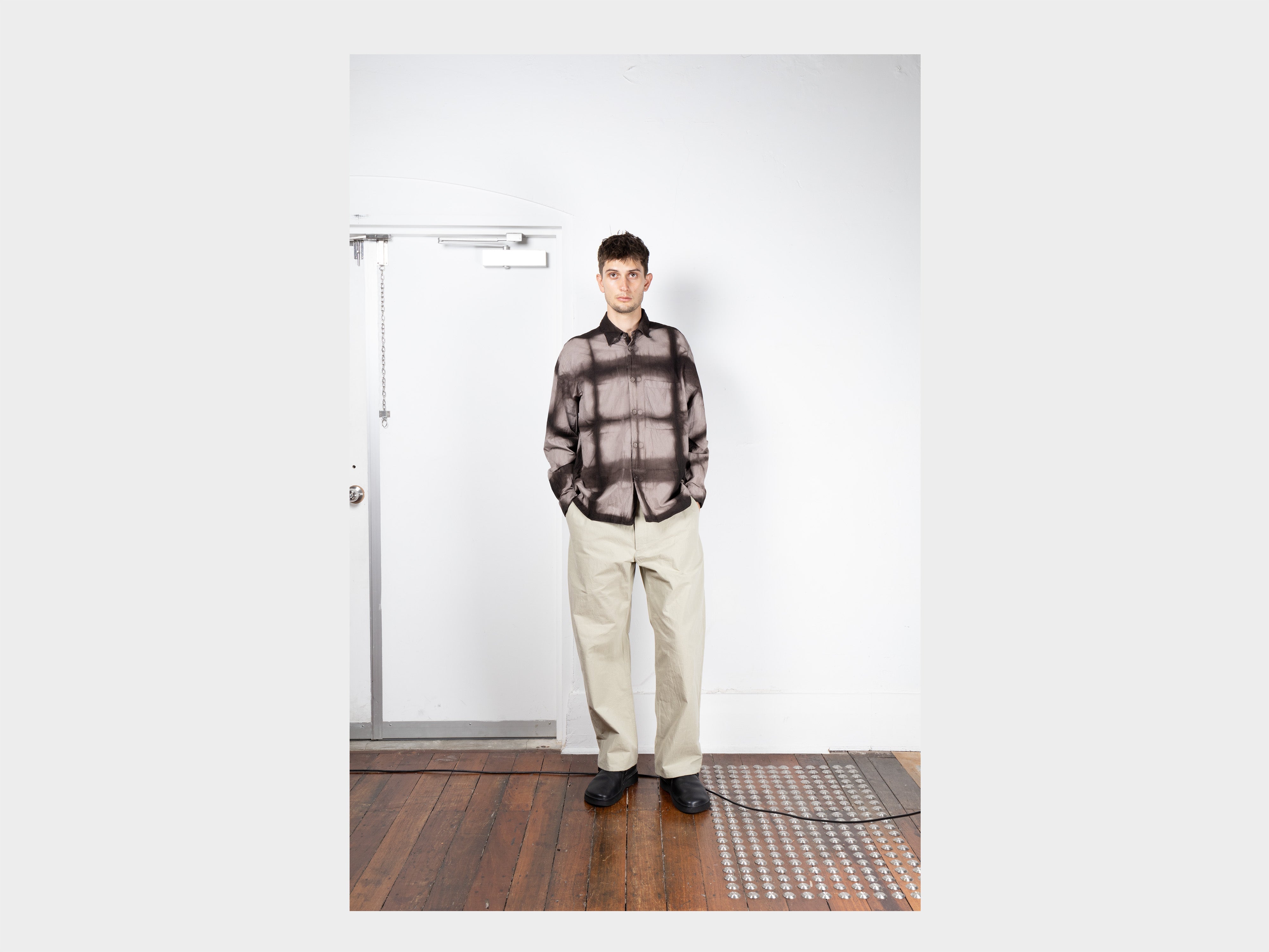70% cotton / 30% linen high-density parachute cloth. This garment is first folded and clamped between wooden blocks in the Itajime shibori method. It is then immersed in a tannin-rich dye bath made from the bark of local Teichiki wood, and then in iron-rich mud, dorotetsu. This process is repeated 25 times to achieve great depth of colour. Once the clamps are released, the entire garment is again overdyed only using the mud, resulting in the pale grey iron colour, between the lines. Please note that due to the hand-dyed nature of this cloth, slight irregularities in the finished colour may occur. Designed to evolve with washing, wear, and exposure to sunlight. Woven in Shizuoka and hand-dyed by Kanai Kougei in Amami-Ōshima.