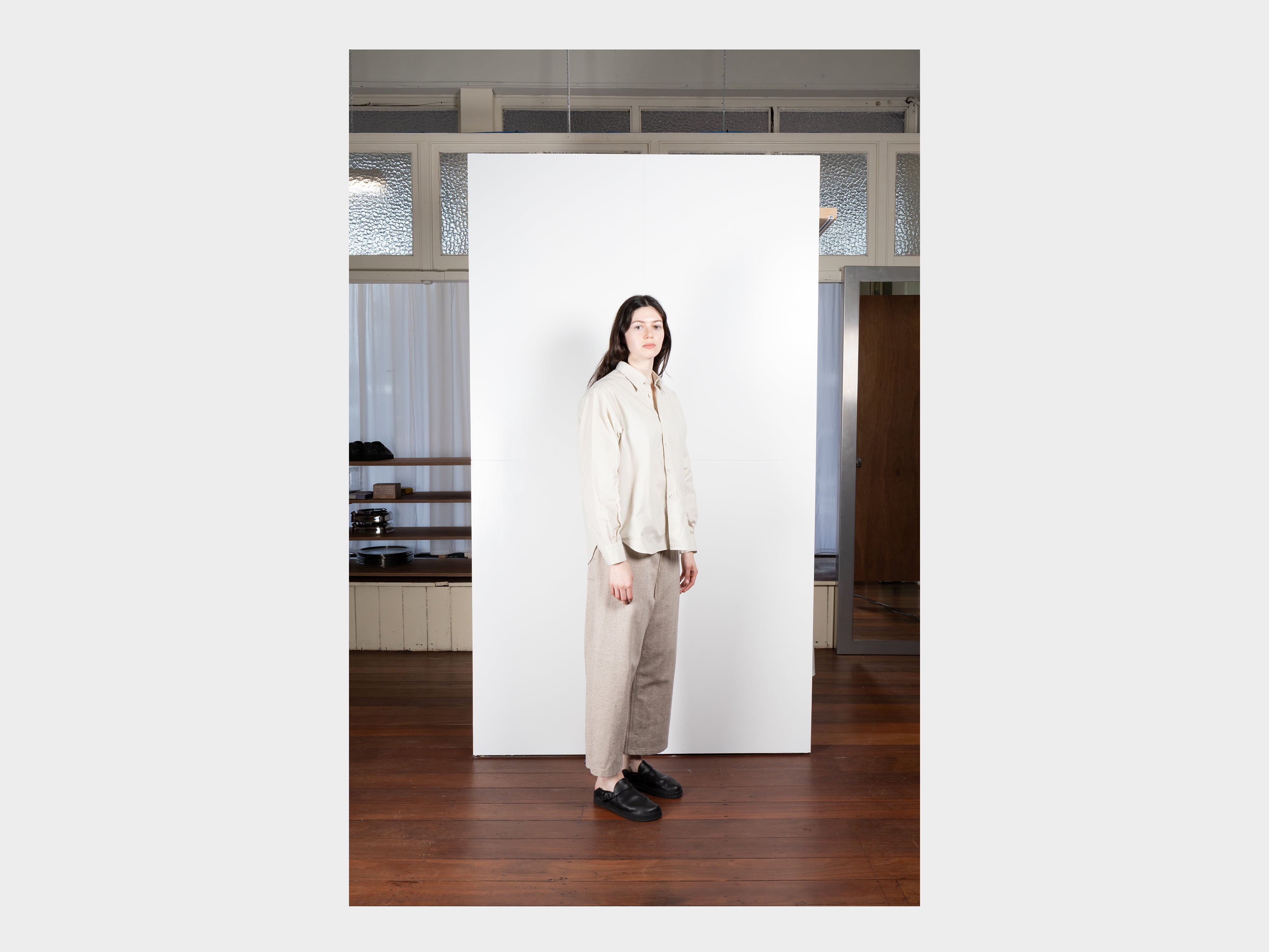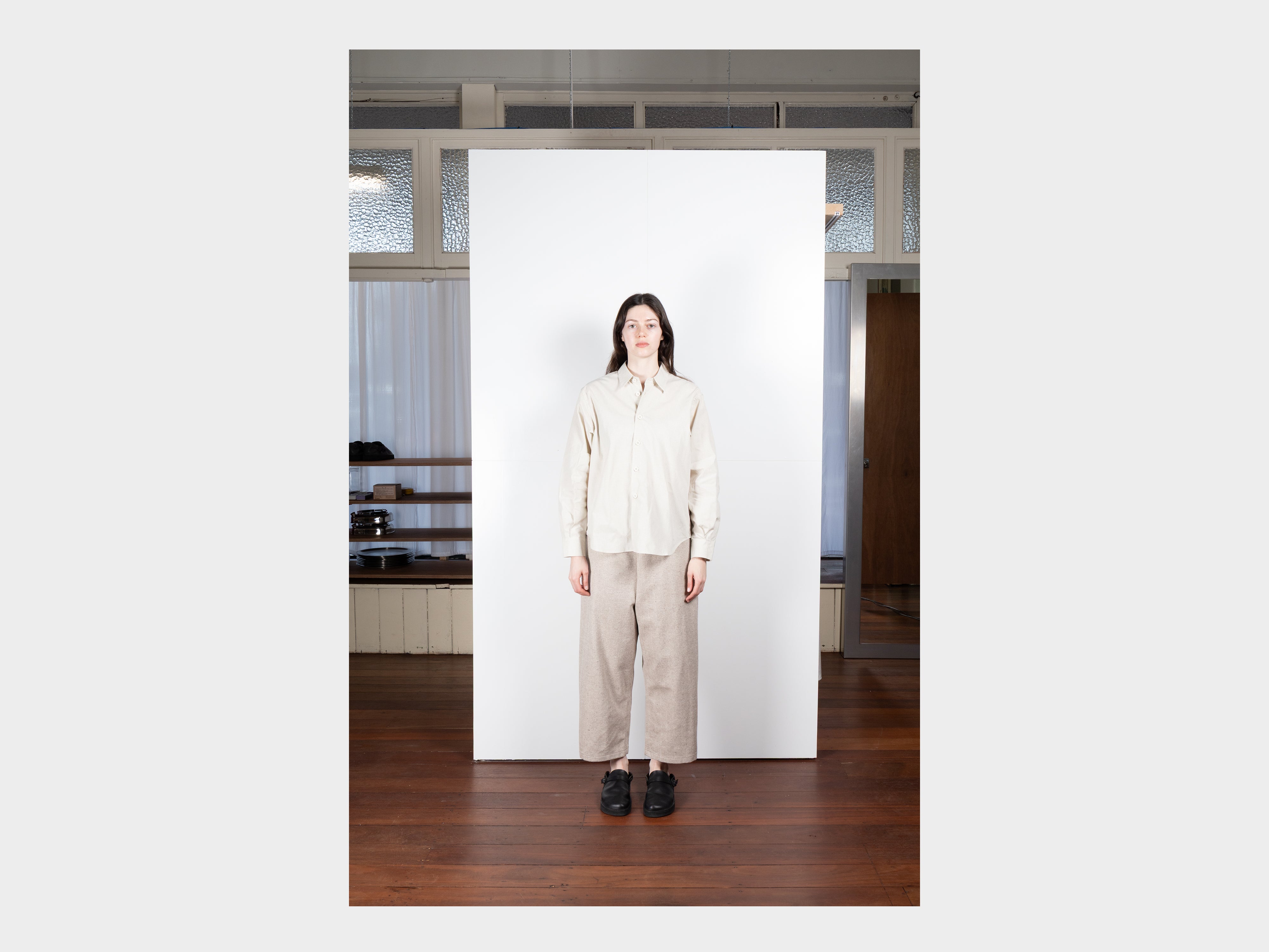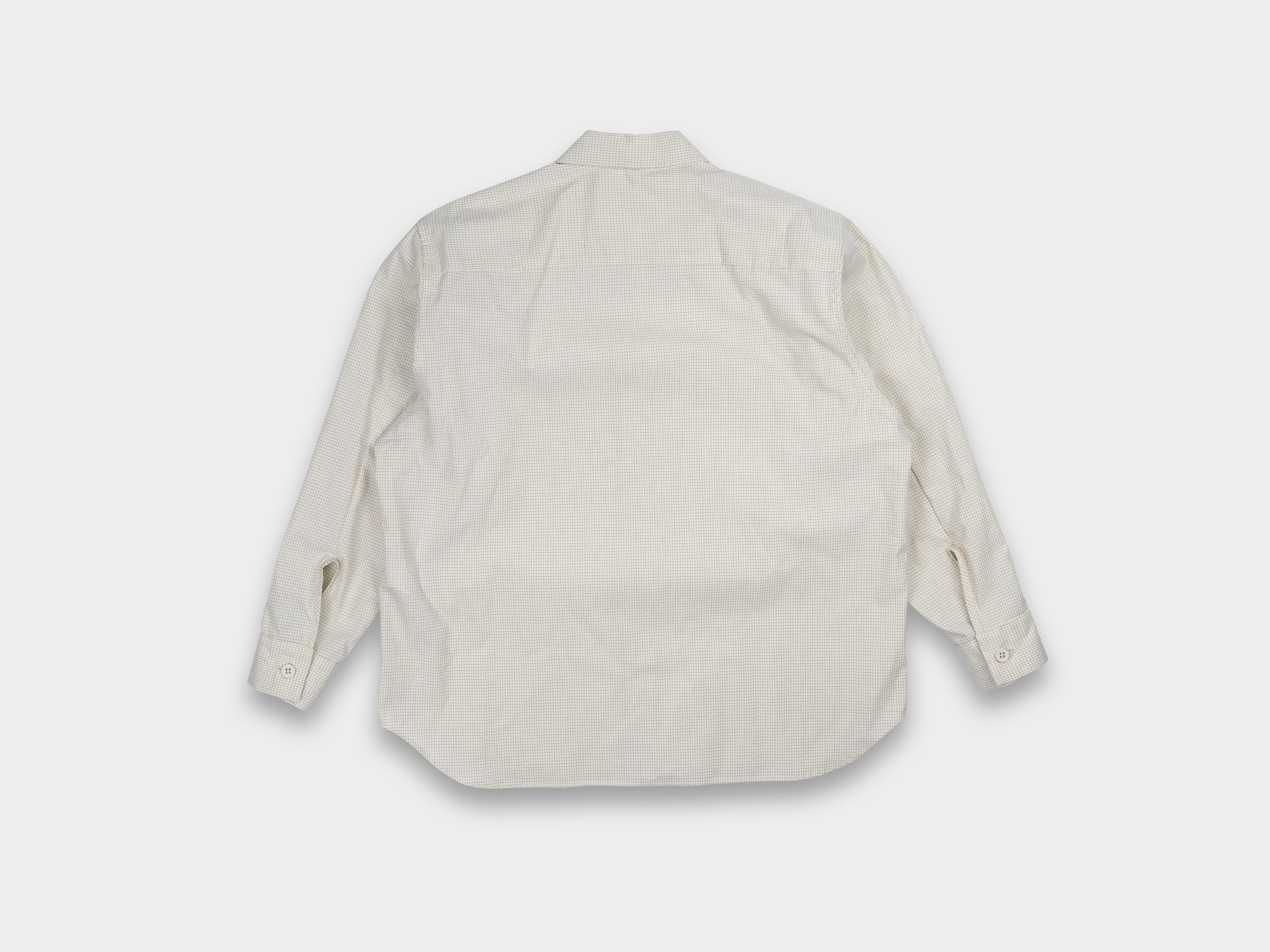 +Loose-fitting shirt. Slightly dropped shoulders, relaxed sleeves, pleated cuffs with single-button closure, pointed collar, button front, curved hem. Made in Japan.