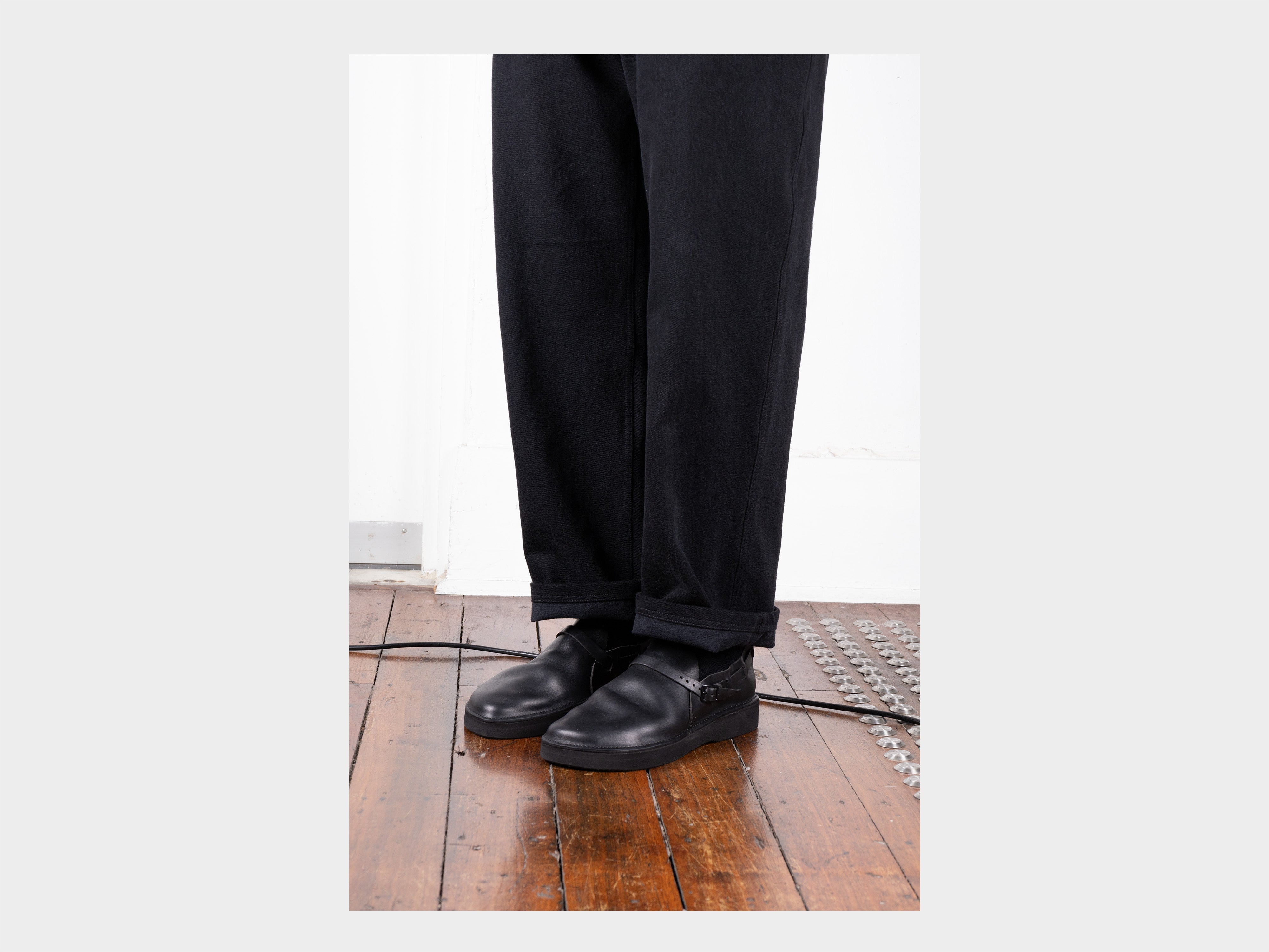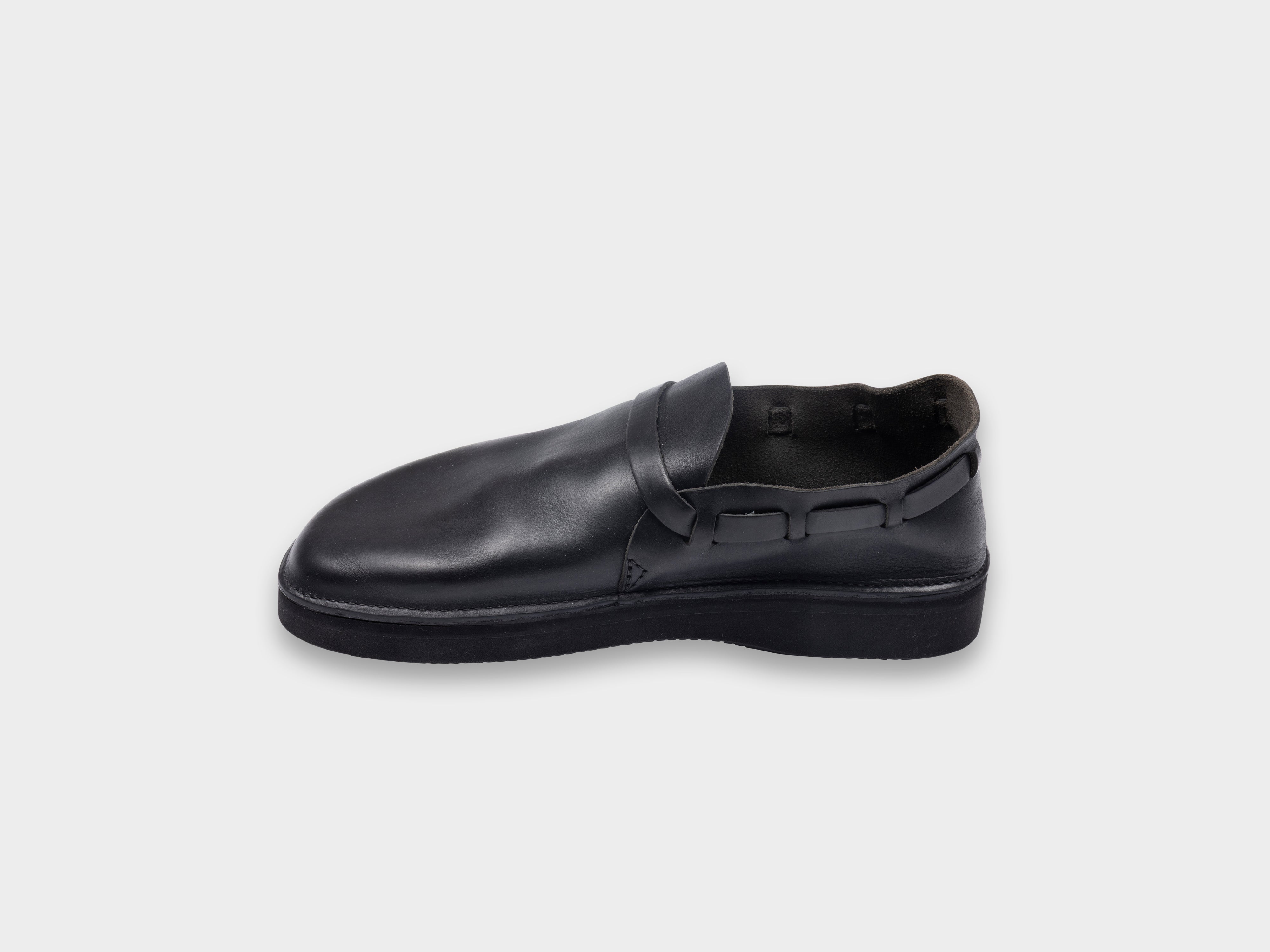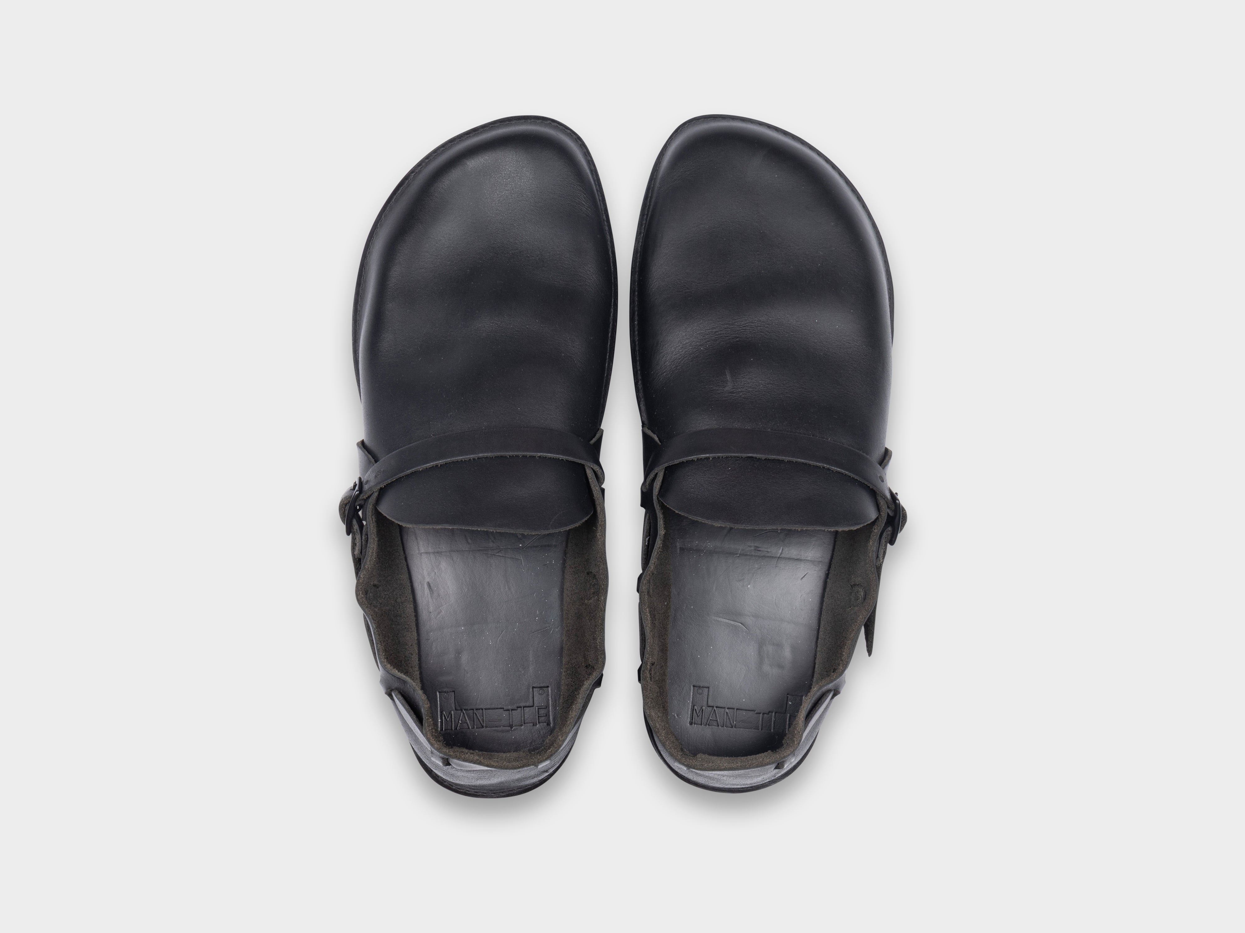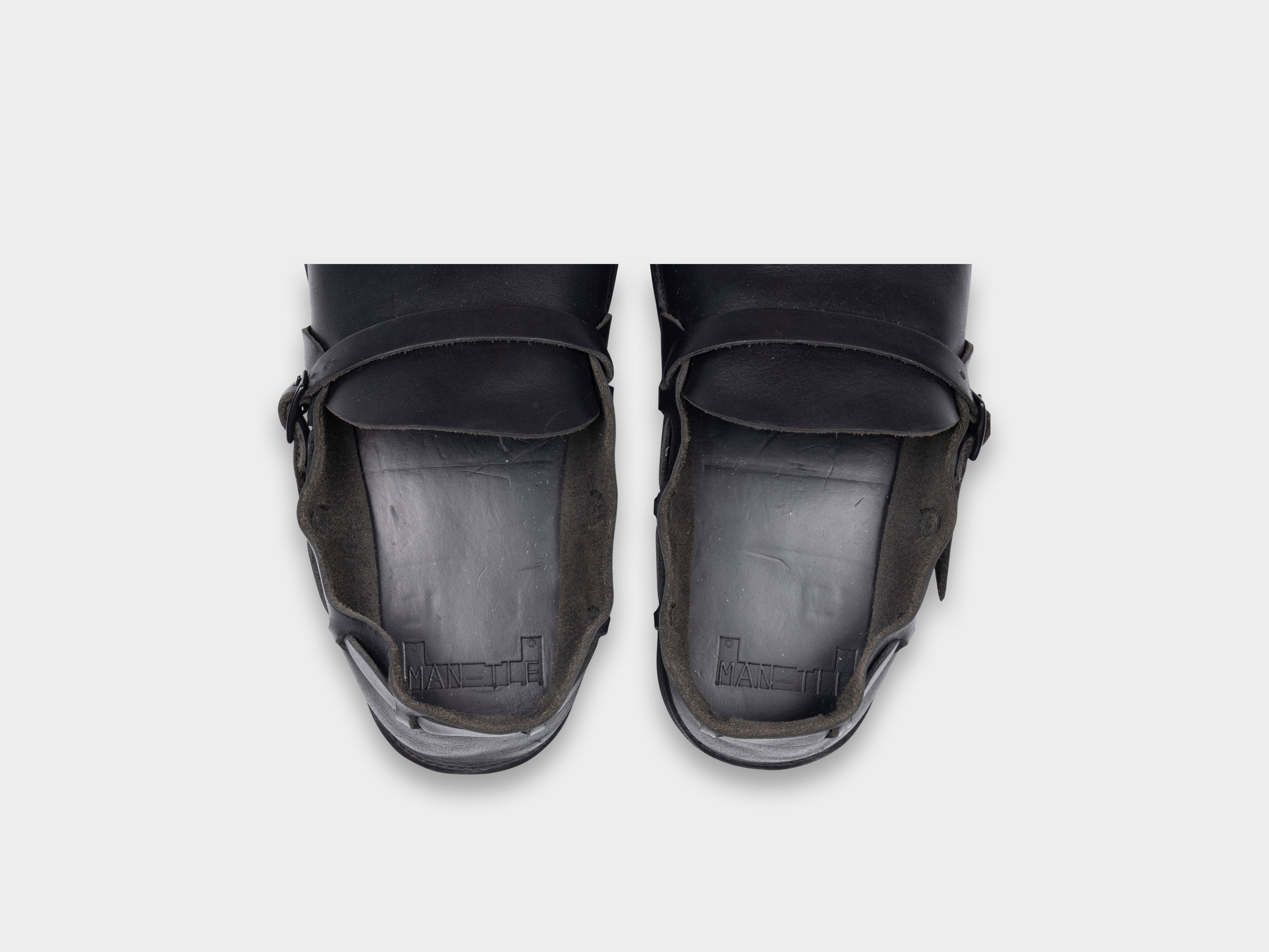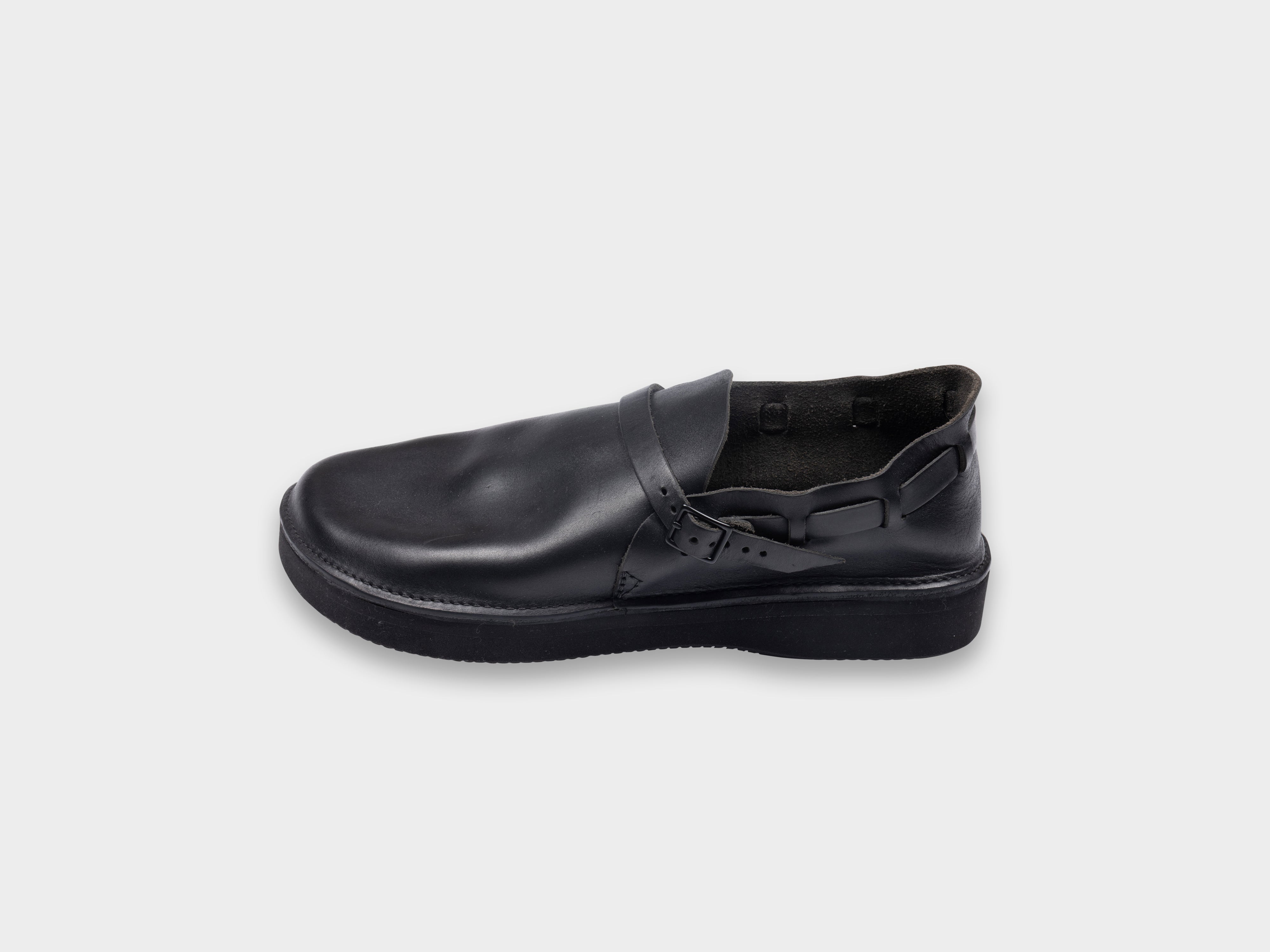 +Produced for MAN-TLE by Aurora Shoe Co. in upstate New York. Taking their recognisable Middle English monk-style flat, a thicker Vibram sole has been applied. This shoe features large cuts of leather, Aurora’s recognisable strap and solid brass buckle in black, and a MAN–TLE insole stamp. Thick, breathable, full grain leather upper, intentionally under-formed, used the wearers feet as the final last. Leather domes over the first few wears. Handmade in the USA.