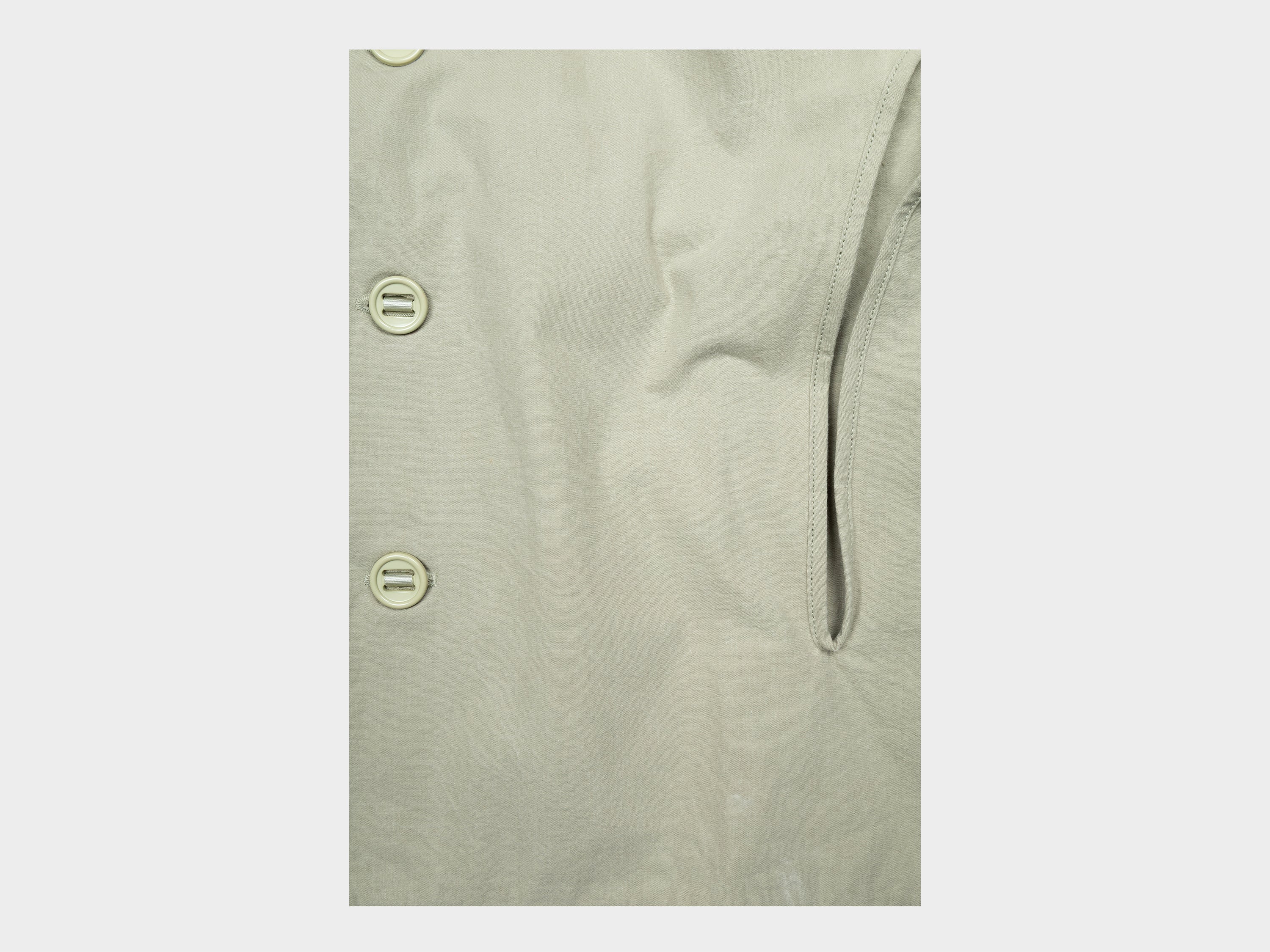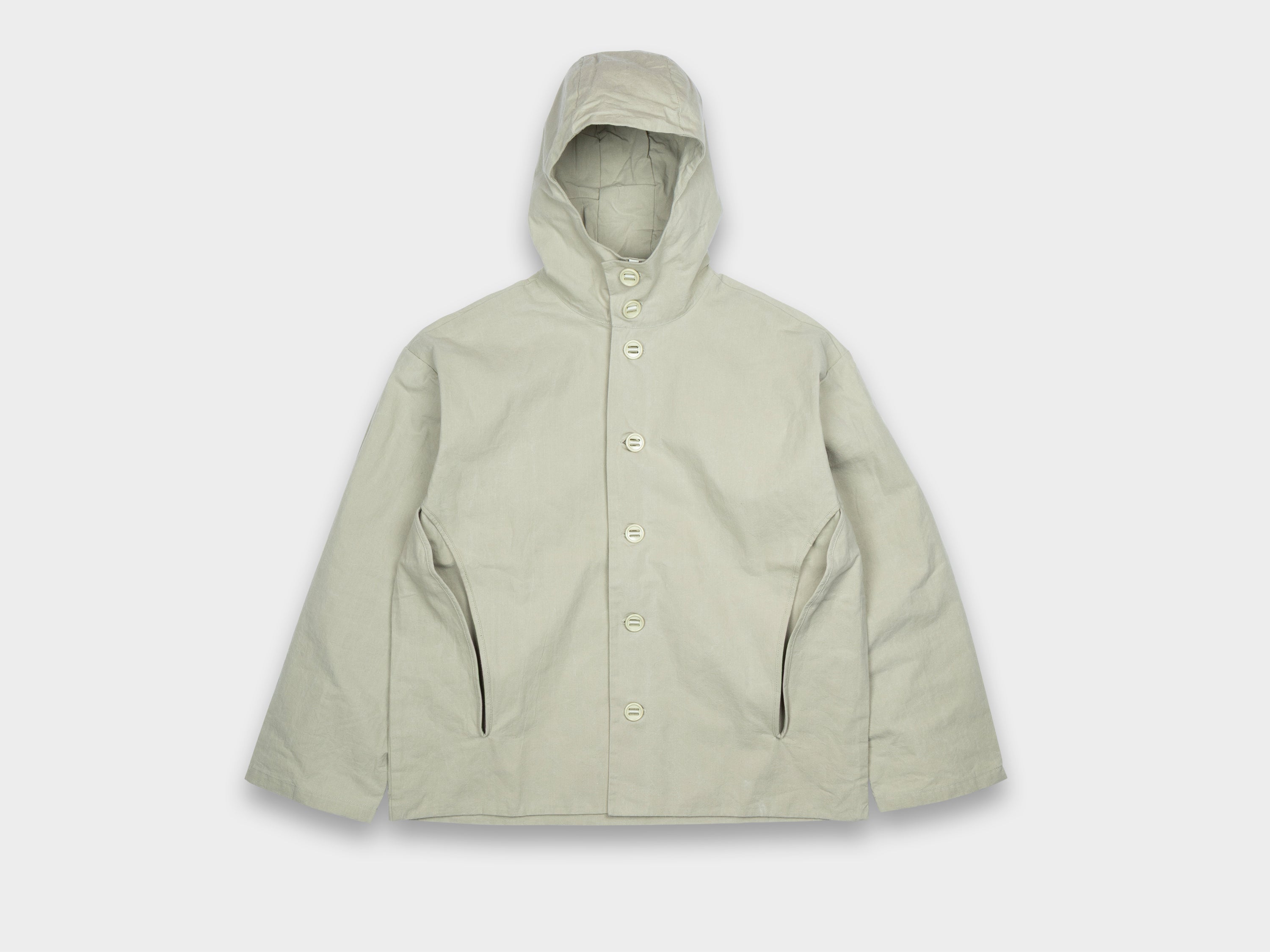 +Hooded jacket with a loose, slightly cropped fit. Self-lined front and hood, enlarged slot buttons threaded onto seatbelt tape, slashed pockets that extend from the armholes. Exclusive item produced for retailer; Pan’s Dance in Seoul, South Korea. Made in Japan.